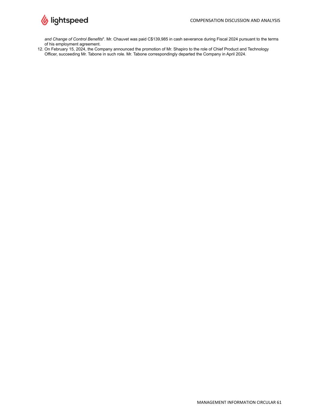 and Change of Control Benefits". Mr. Chauvet was paid C$139,985 in cash severance during Fiscal 2024 pursuant to the terms of his employment agreement. 12. On February 15, 2024, the Company announced the promotion of Mr. Shapiro to the role of Chief Product and Technology Officer, succeeding Mr. Tabone in such role. Mr. Tabone correspondingly departed the Company in April 2024. COMPENSATION DISCUSSION AND ANALYSIS MANAGEMENT INFORMATION CIRCULAR 61