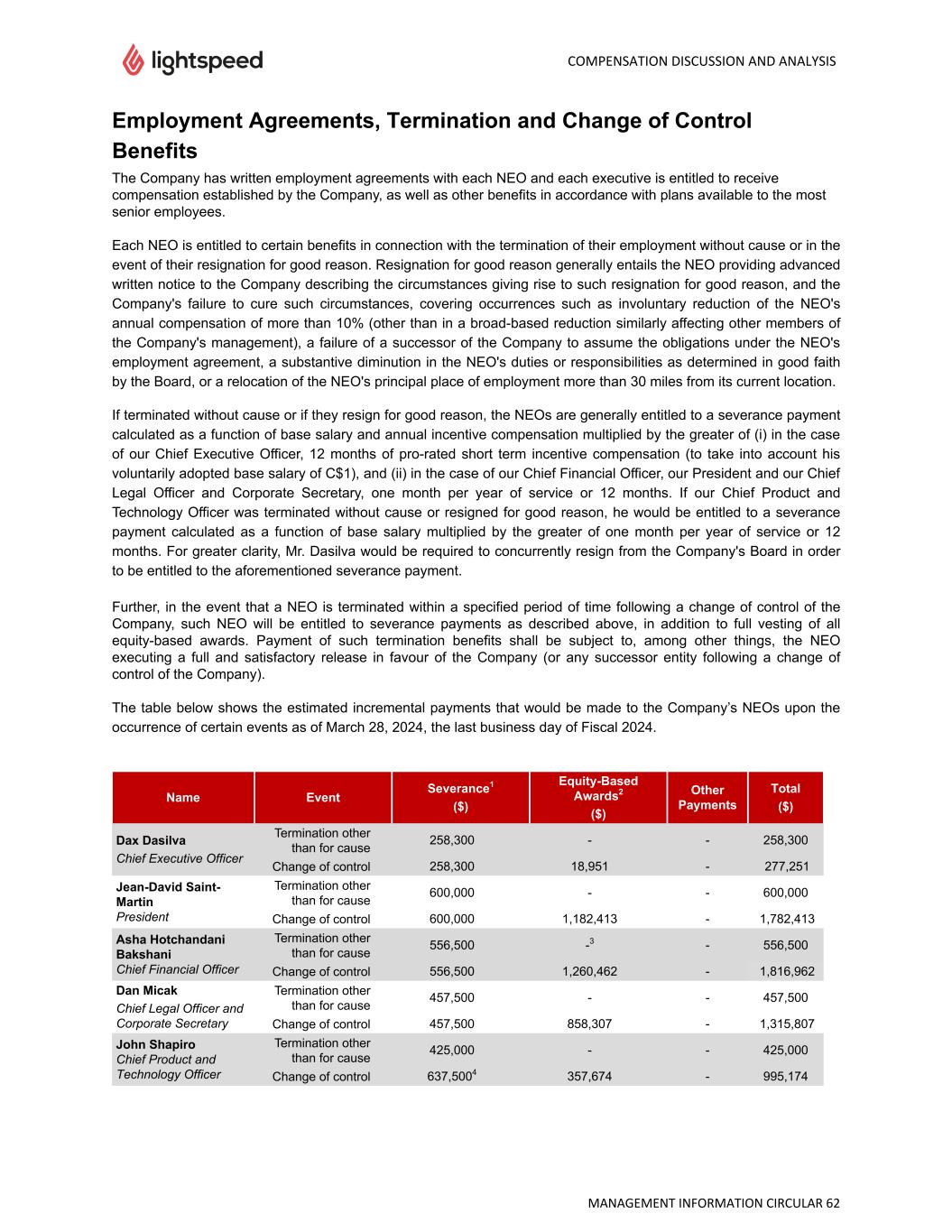 Employment Agreements, Termination and Change of Control Benefits The Company has written employment agreements with each NEO and each executive is entitled to receive compensation established by the Company, as well as other benefits in accordance with plans available to the most senior employees. Each NEO is entitled to certain benefits in connection with the termination of their employment without cause or in the event of their resignation for good reason. Resignation for good reason generally entails the NEO providing advanced written notice to the Company describing the circumstances giving rise to such resignation for good reason, and the Company's failure to cure such circumstances, covering occurrences such as involuntary reduction of the NEO's annual compensation of more than 10% (other than in a broad-based reduction similarly affecting other members of the Company's management), a failure of a successor of the Company to assume the obligations under the NEO's employment agreement, a substantive diminution in the NEO's duties or responsibilities as determined in good faith by the Board, or a relocation of the NEO's principal place of employment more than 30 miles from its current location. If terminated without cause or if they resign for good reason, the NEOs are generally entitled to a severance payment calculated as a function of base salary and annual incentive compensation multiplied by the greater of (i) in the case of our Chief Executive Officer, 12 months of pro-rated short term incentive compensation (to take into account his voluntarily adopted base salary of C$1), and (ii) in the case of our Chief Financial Officer, our President and our Chief Legal Officer and Corporate Secretary, one month per year of service or 12 months. If our Chief Product and Technology Officer was terminated without cause or resigned for good reason, he would be entitled to a severance payment calculated as a function of base salary multiplied by the greater of one month per year of service or 12 months. For greater clarity, Mr. Dasilva would be required to concurrently resign from the Company's Board in order to be entitled to the aforementioned severance payment. Further, in the event that a NEO is terminated within a specified period of time following a change of control of the Company, such NEO will be entitled to severance payments as described above, in addition to full vesting of all equity-based awards. Payment of such termination benefits shall be subject to, among other things, the NEO executing a full and satisfactory release in favour of the Company (or any successor entity following a change of control of the Company). The table below shows the estimated incremental payments that would be made to the Company’s NEOs upon the occurrence of certain events as of March 28, 2024, the last business day of Fiscal 2024. Name Event Severance1 ($) Equity-Based Awards2 ($) Other Payments Total ($) Dax Dasilva Chief Executive Officer Termination other than for cause 258,300 - - 258,300 Change of control 258,300 18,951 - 277,251 Jean-David Saint- Martin President Termination other than for cause 600,000 - - 600,000 Change of control 600,000 1,182,413 - 1,782,413 Asha Hotchandani Bakshani Chief Financial Officer Termination other than for cause 556,500 -3 - 556,500 Change of control 556,500 1,260,462 - 1,816,962 Dan Micak Chief Legal Officer and Corporate Secretary Termination other than for cause 457,500 - - 457,500 Change of control 457,500 858,307 - 1,315,807 John Shapiro Chief Product and Technology Officer Termination other than for cause 425,000 - - 425,000 Change of control 637,5004 357,674 - 995,174 COMPENSATION DISCUSSION AND ANALYSIS MANAGEMENT INFORMATION CIRCULAR 62