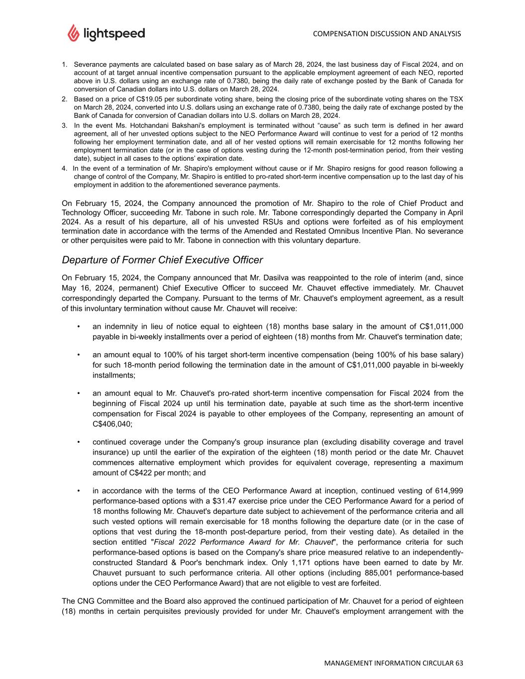 1. Severance payments are calculated based on base salary as of March 28, 2024, the last business day of Fiscal 2024, and on account of at target annual incentive compensation pursuant to the applicable employment agreement of each NEO, reported above in U.S. dollars using an exchange rate of 0.7380, being the daily rate of exchange posted by the Bank of Canada for conversion of Canadian dollars into U.S. dollars on March 28, 2024. 2. Based on a price of C$19.05 per subordinate voting share, being the closing price of the subordinate voting shares on the TSX on March 28, 2024, converted into U.S. dollars using an exchange rate of 0.7380, being the daily rate of exchange posted by the Bank of Canada for conversion of Canadian dollars into U.S. dollars on March 28, 2024. 3. In the event Ms. Hotchandani Bakshani's employment is terminated without “cause” as such term is defined in her award agreement, all of her unvested options subject to the NEO Performance Award will continue to vest for a period of 12 months following her employment termination date, and all of her vested options will remain exercisable for 12 months following her employment termination date (or in the case of options vesting during the 12-month post-termination period, from their vesting date), subject in all cases to the options’ expiration date. 4. In the event of a termination of Mr. Shapiro's employment without cause or if Mr. Shapiro resigns for good reason following a change of control of the Company, Mr. Shapiro is entitled to pro-rated short-term incentive compensation up to the last day of his employment in addition to the aforementioned severance payments. On February 15, 2024, the Company announced the promotion of Mr. Shapiro to the role of Chief Product and Technology Officer, succeeding Mr. Tabone in such role. Mr. Tabone correspondingly departed the Company in April 2024. As a result of his departure, all of his unvested RSUs and options were forfeited as of his employment termination date in accordance with the terms of the Amended and Restated Omnibus Incentive Plan. No severance or other perquisites were paid to Mr. Tabone in connection with this voluntary departure. Departure of Former Chief Executive Officer On February 15, 2024, the Company announced that Mr. Dasilva was reappointed to the role of interim (and, since May 16, 2024, permanent) Chief Executive Officer to succeed Mr. Chauvet effective immediately. Mr. Chauvet correspondingly departed the Company. Pursuant to the terms of Mr. Chauvet's employment agreement, as a result of this involuntary termination without cause Mr. Chauvet will receive: • an indemnity in lieu of notice equal to eighteen (18) months base salary in the amount of C$1,011,000 payable in bi-weekly installments over a period of eighteen (18) months from Mr. Chauvet's termination date; • an amount equal to 100% of his target short-term incentive compensation (being 100% of his base salary) for such 18-month period following the termination date in the amount of C$1,011,000 payable in bi-weekly installments; • an amount equal to Mr. Chauvet's pro-rated short-term incentive compensation for Fiscal 2024 from the beginning of Fiscal 2024 up until his termination date, payable at such time as the short-term incentive compensation for Fiscal 2024 is payable to other employees of the Company, representing an amount of C$406,040; • continued coverage under the Company's group insurance plan (excluding disability coverage and travel insurance) up until the earlier of the expiration of the eighteen (18) month period or the date Mr. Chauvet commences alternative employment which provides for equivalent coverage, representing a maximum amount of C$422 per month; and • in accordance with the terms of the CEO Performance Award at inception, continued vesting of 614,999 performance-based options with a $31.47 exercise price under the CEO Performance Award for a period of 18 months following Mr. Chauvet's departure date subject to achievement of the performance criteria and all such vested options will remain exercisable for 18 months following the departure date (or in the case of options that vest during the 18-month post-departure period, from their vesting date). As detailed in the section entitled "Fiscal 2022 Performance Award for Mr. Chauvet", the performance criteria for such performance-based options is based on the Company's share price measured relative to an independently- constructed Standard & Poor's benchmark index. Only 1,171 options have been earned to date by Mr. Chauvet pursuant to such performance criteria. All other options (including 885,001 performance-based options under the CEO Performance Award) that are not eligible to vest are forfeited. The CNG Committee and the Board also approved the continued participation of Mr. Chauvet for a period of eighteen (18) months in certain perquisites previously provided for under Mr. Chauvet's employment arrangement with the COMPENSATION DISCUSSION AND ANALYSIS MANAGEMENT INFORMATION CIRCULAR 63
