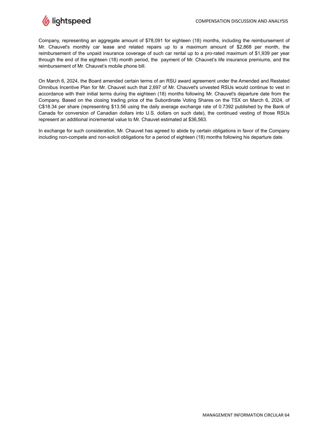 Company, representing an aggregate amount of $78,091 for eighteen (18) months, including the reimbursement of Mr. Chauvet's monthly car lease and related repairs up to a maximum amount of $2,868 per month, the reimbursement of the unpaid insurance coverage of such car rental up to a pro-rated maximum of $1,939 per year through the end of the eighteen (18) month period, the payment of Mr. Chauvet’s life insurance premiums, and the reimbursement of Mr. Chauvet’s mobile phone bill. On March 6, 2024, the Board amended certain terms of an RSU award agreement under the Amended and Restated Omnibus Incentive Plan for Mr. Chauvet such that 2,697 of Mr. Chauvet's unvested RSUs would continue to vest in accordance with their initial terms during the eighteen (18) months following Mr. Chauvet's departure date from the Company. Based on the closing trading price of the Subordinate Voting Shares on the TSX on March 6, 2024, of C$18.34 per share (representing $13.56 using the daily average exchange rate of 0.7392 published by the Bank of Canada for conversion of Canadian dollars into U.S. dollars on such date), the continued vesting of those RSUs represent an additional incremental value to Mr. Chauvet estimated at $36,563. In exchange for such consideration, Mr. Chauvet has agreed to abide by certain obligations in favor of the Company including non-compete and non-solicit obligations for a period of eighteen (18) months following his departure date. COMPENSATION DISCUSSION AND ANALYSIS MANAGEMENT INFORMATION CIRCULAR 64