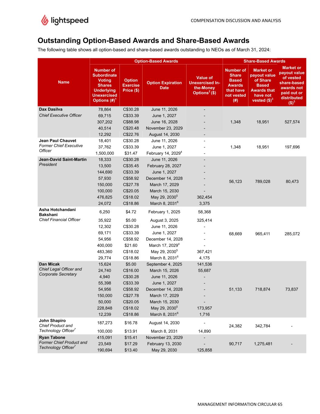 Outstanding Option-Based Awards and Share-Based Awards The following table shows all option-based and share-based awards outstanding to NEOs as of March 31, 2024: Name Option-Based Awards Share-Based Awards Number of Subordinate Voting Shares Underlying Unexercised Options (#)1 Option Exercise Price ($) Option Expiration Date Value of Unexercised In- the-Money Options2 ($) Number of Share Based Awards that have not vested (#) Market or payout value of Share Based Awards that have not vested ($)3 Market or payout value of vested share-based awards not paid out or distributed ($)3 Dax Dasilva Chief Executive Officer 78,864 C$30.28 June 11, 2026 - 1,348 18,951 527,574 69,715 C$33.39 June 1, 2027 - 307,202 C$88.98 June 16, 2028 - 40,514 C$20.48 November 23, 2029 - 12,292 C$22.76 August 14, 2030 - Jean Paul Chauvet Former Chief Executive Officer 18,401 C$30.28 June 11, 2026 - 1,348 18,951 197,69637,762 C$33.39 June 1, 2027 - 1,500,000 $31.47 February 14, 20294 - Jean-David Saint-Martin President 18,333 C$30.28 June 11, 2026 - 56,123 789,028 80,473 13,500 C$35.45 February 28, 2027 - 144,690 C$33.39 June 1, 2027 - 57,930 C$58.92 December 14, 2028 - 150,000 C$27.78 March 17, 2029 - 100,000 C$20.05 March 15, 2030 - 476,825 C$18.02 May 29, 20305 362,454 24,072 C$18.86 March 8, 20316 3,375 Asha Hotchandani Bakshani Chief Financial Officer 6,250 $4.72 February 1, 2025 58,368 68,669 965,411 285,072 35,922 $5.00 August 3, 2025 325,414 12,302 C$30.28 June 11, 2026 - 69,171 C$33.39 June 1, 2027 - 54,956 C$58.92 December 14, 2028 - 400,000 $21.60 March 17, 20294 - 483,360 C$18.02 May 29, 20305 367,421 29,774 C$18.86 March 8, 20316 4,175 Dan Micak Chief Legal Officer and Corporate Secretary 15,624 $5.00 September 4, 2025 141,536 51,133 718,874 73,837 24,740 C$16.00 March 15, 2026 55,687 4,940 C$30.28 June 11, 2026 - 55,398 C$33.39 June 1, 2027 - 54,956 C$58.92 December 14, 2028 - 150,000 C$27.78 March 17, 2029 - 50,000 C$20.05 March 15, 2030 - 228,848 C$18.02 May 29, 20305 173,957 12,239 C$18.86 March 8, 20316 1,716 John Shapiro Chief Product and Technology Officer7 187,273 $16.78 August 14, 2030 - 24,382 342,784 - 100,000 $13.91 March 8, 2031 14,890 Ryan Tabone Former Chief Product and Technology Officer7 415,091 $15.41 November 23, 2029 - 90,717 1,275,481 -23,549 $17.29 February 13, 2030 - 190,694 $13.40 May 29, 2030 125,858 COMPENSATION DISCUSSION AND ANALYSIS MANAGEMENT INFORMATION CIRCULAR 65