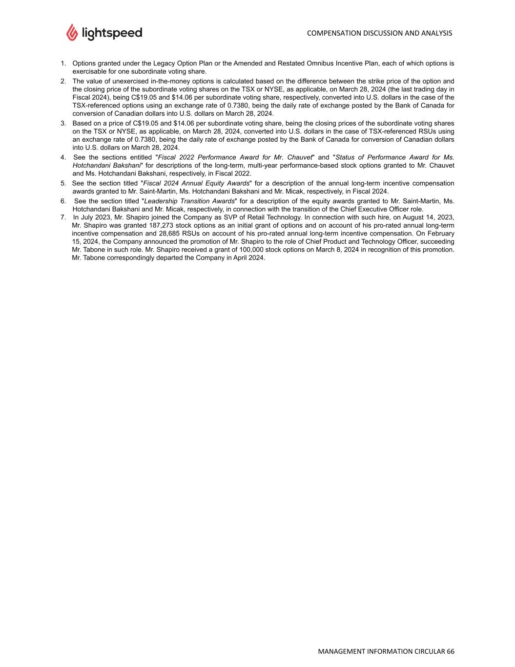 1. Options granted under the Legacy Option Plan or the Amended and Restated Omnibus Incentive Plan, each of which options is exercisable for one subordinate voting share. 2. The value of unexercised in-the-money options is calculated based on the difference between the strike price of the option and the closing price of the subordinate voting shares on the TSX or NYSE, as applicable, on March 28, 2024 (the last trading day in Fiscal 2024), being C$19.05 and $14.06 per subordinate voting share, respectively, converted into U.S. dollars in the case of the TSX-referenced options using an exchange rate of 0.7380, being the daily rate of exchange posted by the Bank of Canada for conversion of Canadian dollars into U.S. dollars on March 28, 2024. 3. Based on a price of C$19.05 and $14.06 per subordinate voting share, being the closing prices of the subordinate voting shares on the TSX or NYSE, as applicable, on March 28, 2024, converted into U.S. dollars in the case of TSX-referenced RSUs using an exchange rate of 0.7380, being the daily rate of exchange posted by the Bank of Canada for conversion of Canadian dollars into U.S. dollars on March 28, 2024. 4. See the sections entitled "Fiscal 2022 Performance Award for Mr. Chauvet" and "Status of Performance Award for Ms. Hotchandani Bakshani" for descriptions of the long-term, multi-year performance-based stock options granted to Mr. Chauvet and Ms. Hotchandani Bakshani, respectively, in Fiscal 2022. 5. See the section titled "Fiscal 2024 Annual Equity Awards" for a description of the annual long-term incentive compensation awards granted to Mr. Saint-Martin, Ms. Hotchandani Bakshani and Mr. Micak, respectively, in Fiscal 2024. 6. See the section titled "Leadership Transition Awards" for a description of the equity awards granted to Mr. Saint-Martin, Ms. Hotchandani Bakshani and Mr. Micak, respectively, in connection with the transition of the Chief Executive Officer role. 7. In July 2023, Mr. Shapiro joined the Company as SVP of Retail Technology. In connection with such hire, on August 14, 2023, Mr. Shapiro was granted 187,273 stock options as an initial grant of options and on account of his pro-rated annual long-term incentive compensation and 28,685 RSUs on account of his pro-rated annual long-term incentive compensation. On February 15, 2024, the Company announced the promotion of Mr. Shapiro to the role of Chief Product and Technology Officer, succeeding Mr. Tabone in such role. Mr. Shapiro received a grant of 100,000 stock options on March 8, 2024 in recognition of this promotion. Mr. Tabone correspondingly departed the Company in April 2024. COMPENSATION DISCUSSION AND ANALYSIS MANAGEMENT INFORMATION CIRCULAR 66
