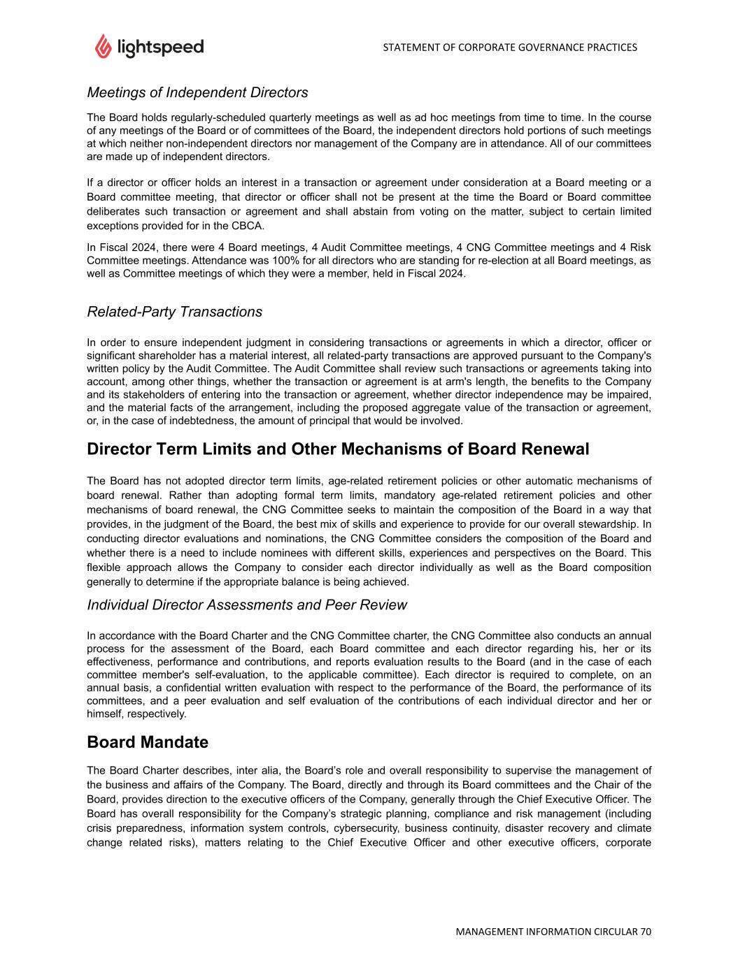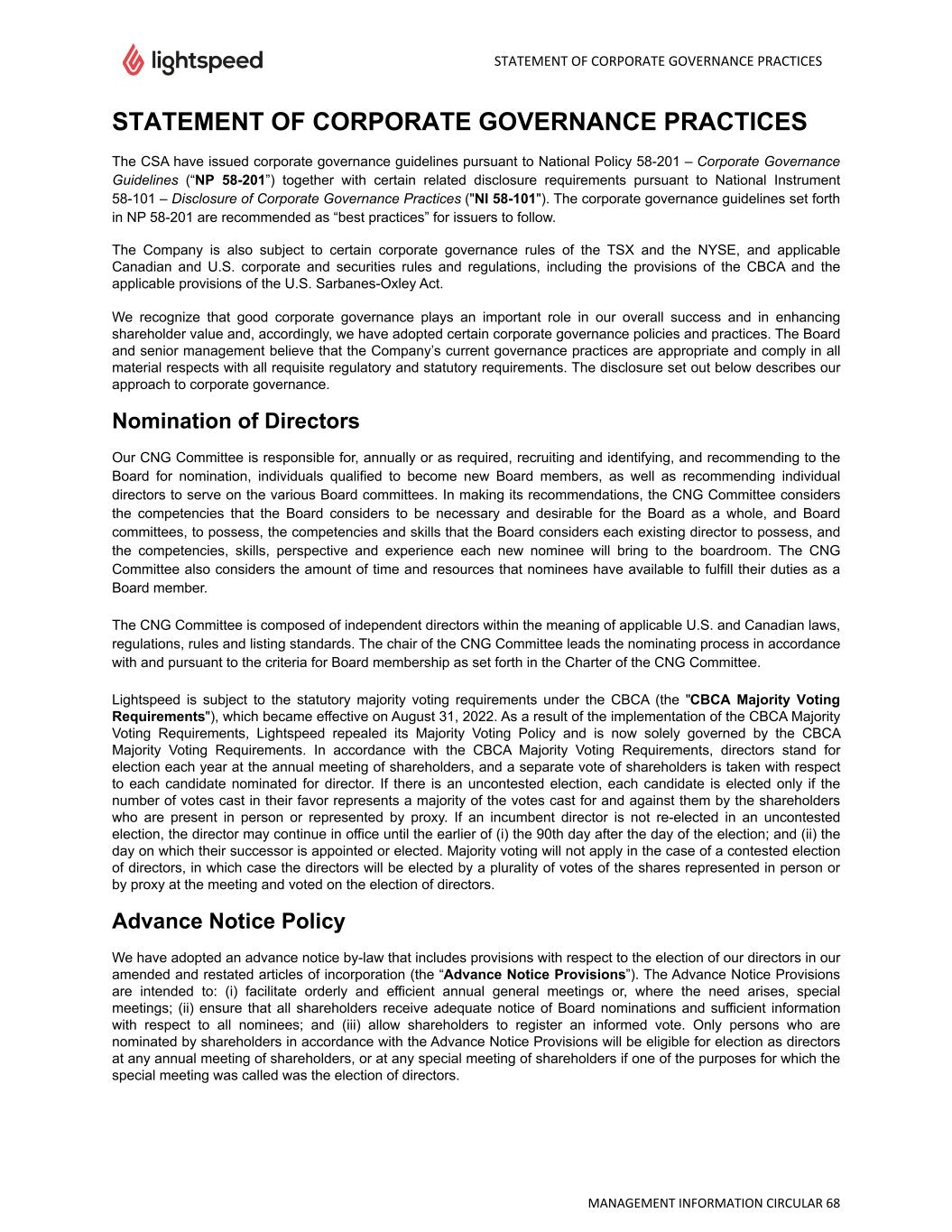 STATEMENT OF CORPORATE GOVERNANCE PRACTICES The CSA have issued corporate governance guidelines pursuant to National Policy 58-201 – Corporate Governance Guidelines (“NP 58-201”) together with certain related disclosure requirements pursuant to National Instrument 58-101 – Disclosure of Corporate Governance Practices ("NI 58-101"). The corporate governance guidelines set forth in NP 58-201 are recommended as “best practices” for issuers to follow. The Company is also subject to certain corporate governance rules of the TSX and the NYSE, and applicable Canadian and U.S. corporate and securities rules and regulations, including the provisions of the CBCA and the applicable provisions of the U.S. Sarbanes-Oxley Act. We recognize that good corporate governance plays an important role in our overall success and in enhancing shareholder value and, accordingly, we have adopted certain corporate governance policies and practices. The Board and senior management believe that the Company’s current governance practices are appropriate and comply in all material respects with all requisite regulatory and statutory requirements. The disclosure set out below describes our approach to corporate governance. Nomination of Directors Our CNG Committee is responsible for, annually or as required, recruiting and identifying, and recommending to the Board for nomination, individuals qualified to become new Board members, as well as recommending individual directors to serve on the various Board committees. In making its recommendations, the CNG Committee considers the competencies that the Board considers to be necessary and desirable for the Board as a whole, and Board committees, to possess, the competencies and skills that the Board considers each existing director to possess, and the competencies, skills, perspective and experience each new nominee will bring to the boardroom. The CNG Committee also considers the amount of time and resources that nominees have available to fulfill their duties as a Board member. The CNG Committee is composed of independent directors within the meaning of applicable U.S. and Canadian laws, regulations, rules and listing standards. The chair of the CNG Committee leads the nominating process in accordance with and pursuant to the criteria for Board membership as set forth in the Charter of the CNG Committee. Lightspeed is subject to the statutory majority voting requirements under the CBCA (the "CBCA Majority Voting Requirements"), which became effective on August 31, 2022. As a result of the implementation of the CBCA Majority Voting Requirements, Lightspeed repealed its Majority Voting Policy and is now solely governed by the CBCA Majority Voting Requirements. In accordance with the CBCA Majority Voting Requirements, directors stand for election each year at the annual meeting of shareholders, and a separate vote of shareholders is taken with respect to each candidate nominated for director. If there is an uncontested election, each candidate is elected only if the number of votes cast in their favor represents a majority of the votes cast for and against them by the shareholders who are present in person or represented by proxy. If an incumbent director is not re-elected in an uncontested election, the director may continue in office until the earlier of (i) the 90th day after the day of the election; and (ii) the day on which their successor is appointed or elected. Majority voting will not apply in the case of a contested election of directors, in which case the directors will be elected by a plurality of votes of the shares represented in person or by proxy at the meeting and voted on the election of directors. Advance Notice Policy We have adopted an advance notice by-law that includes provisions with respect to the election of our directors in our amended and restated articles of incorporation (the “Advance Notice Provisions”). The Advance Notice Provisions are intended to: (i) facilitate orderly and efficient annual general meetings or, where the need arises, special meetings; (ii) ensure that all shareholders receive adequate notice of Board nominations and sufficient information with respect to all nominees; and (iii) allow shareholders to register an informed vote. Only persons who are nominated by shareholders in accordance with the Advance Notice Provisions will be eligible for election as directors at any annual meeting of shareholders, or at any special meeting of shareholders if one of the purposes for which the special meeting was called was the election of directors. STATEMENT OF CORPORATE GOVERNANCE PRACTICES MANAGEMENT INFORMATION CIRCULAR 68