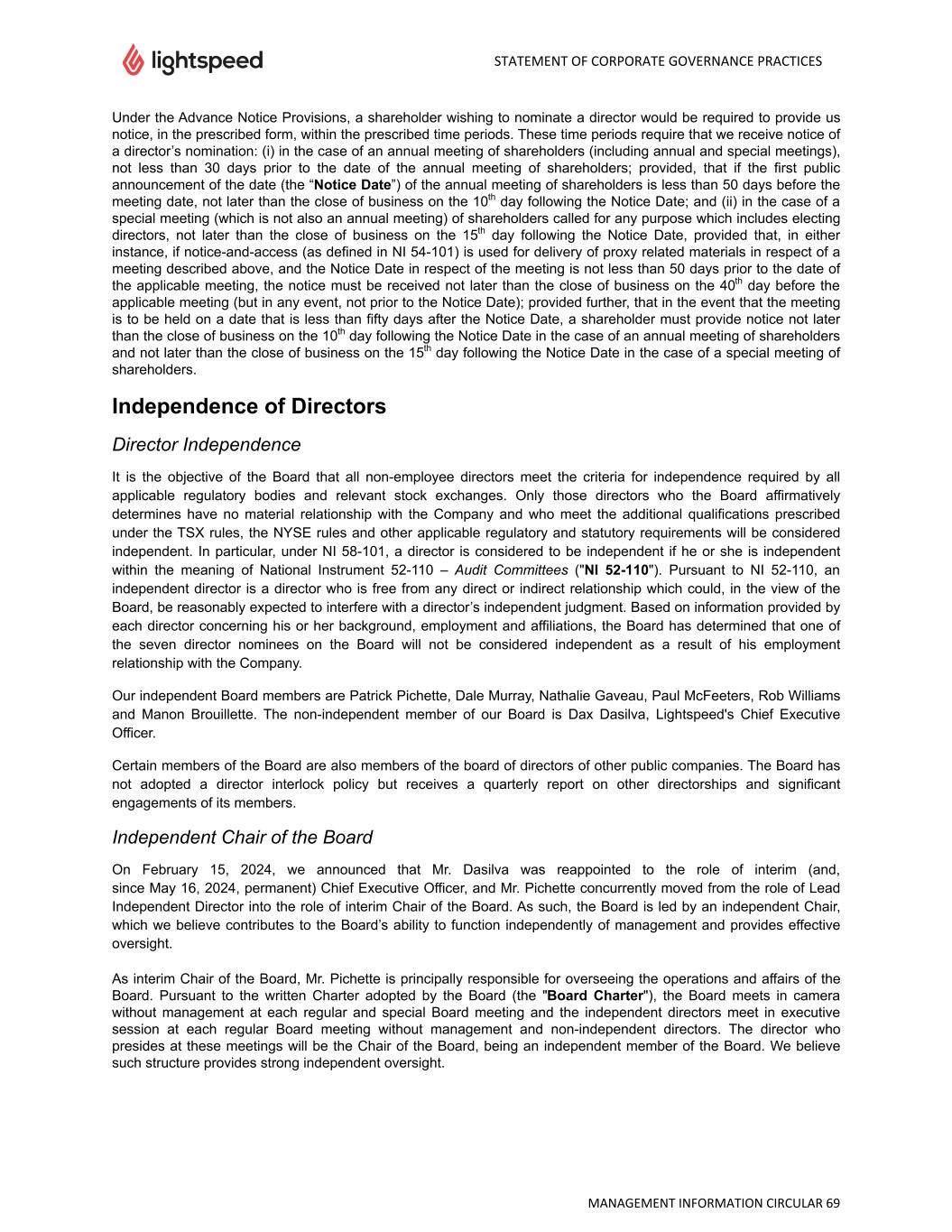 Under the Advance Notice Provisions, a shareholder wishing to nominate a director would be required to provide us notice, in the prescribed form, within the prescribed time periods. These time periods require that we receive notice of a director’s nomination: (i) in the case of an annual meeting of shareholders (including annual and special meetings), not less than 30 days prior to the date of the annual meeting of shareholders; provided, that if the first public announcement of the date (the “Notice Date”) of the annual meeting of shareholders is less than 50 days before the meeting date, not later than the close of business on the 10th day following the Notice Date; and (ii) in the case of a special meeting (which is not also an annual meeting) of shareholders called for any purpose which includes electing directors, not later than the close of business on the 15th day following the Notice Date, provided that, in either instance, if notice-and-access (as defined in NI 54-101) is used for delivery of proxy related materials in respect of a meeting described above, and the Notice Date in respect of the meeting is not less than 50 days prior to the date of the applicable meeting, the notice must be received not later than the close of business on the 40th day before the applicable meeting (but in any event, not prior to the Notice Date); provided further, that in the event that the meeting is to be held on a date that is less than fifty days after the Notice Date, a shareholder must provide notice not later than the close of business on the 10th day following the Notice Date in the case of an annual meeting of shareholders and not later than the close of business on the 15th day following the Notice Date in the case of a special meeting of shareholders. Independence of Directors Director Independence It is the objective of the Board that all non-employee directors meet the criteria for independence required by all applicable regulatory bodies and relevant stock exchanges. Only those directors who the Board affirmatively determines have no material relationship with the Company and who meet the additional qualifications prescribed under the TSX rules, the NYSE rules and other applicable regulatory and statutory requirements will be considered independent. In particular, under NI 58-101, a director is considered to be independent if he or she is independent within the meaning of National Instrument 52-110 – Audit Committees ("NI 52-110"). Pursuant to NI 52-110, an independent director is a director who is free from any direct or indirect relationship which could, in the view of the Board, be reasonably expected to interfere with a director’s independent judgment. Based on information provided by each director concerning his or her background, employment and affiliations, the Board has determined that one of the seven director nominees on the Board will not be considered independent as a result of his employment relationship with the Company. Our independent Board members are Patrick Pichette, Dale Murray, Nathalie Gaveau, Paul McFeeters, Rob Williams and Manon Brouillette. The non-independent member of our Board is Dax Dasilva, Lightspeed's Chief Executive Officer. Certain members of the Board are also members of the board of directors of other public companies. The Board has not adopted a director interlock policy but receives a quarterly report on other directorships and significant engagements of its members. Independent Chair of the Board On February 15, 2024, we announced that Mr. Dasilva was reappointed to the role of interim (and, since May 16, 2024, permanent) Chief Executive Officer, and Mr. Pichette concurrently moved from the role of Lead Independent Director into the role of interim Chair of the Board. As such, the Board is led by an independent Chair, which we believe contributes to the Board’s ability to function independently of management and provides effective oversight. As interim Chair of the Board, Mr. Pichette is principally responsible for overseeing the operations and affairs of the Board. Pursuant to the written Charter adopted by the Board (the "Board Charter"), the Board meets in camera without management at each regular and special Board meeting and the independent directors meet in executive session at each regular Board meeting without management and non-independent directors. The director who presides at these meetings will be the Chair of the Board, being an independent member of the Board. We believe such structure provides strong independent oversight. STATEMENT OF CORPORATE GOVERNANCE PRACTICES MANAGEMENT INFORMATION CIRCULAR 69