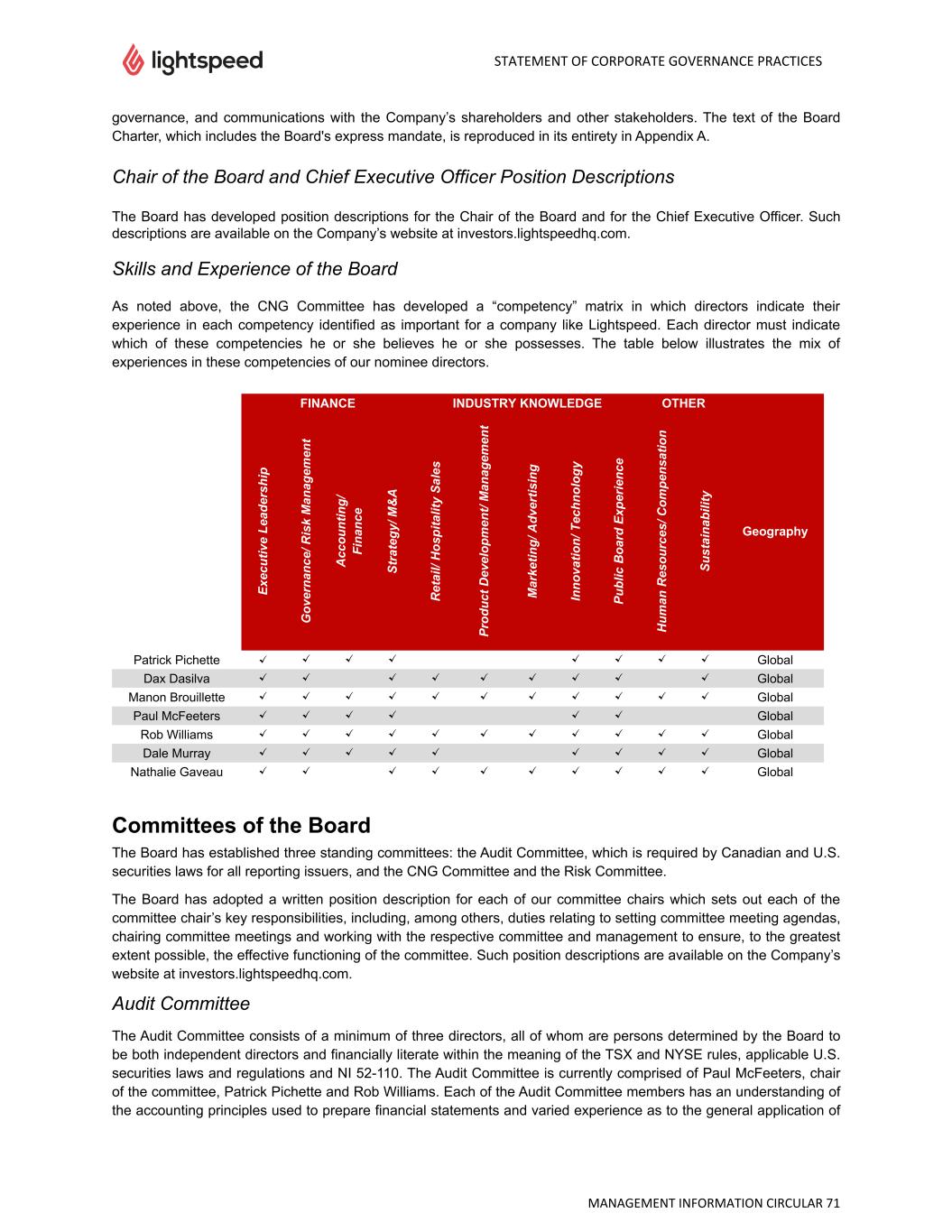 governance, and communications with the Company’s shareholders and other stakeholders. The text of the Board Charter, which includes the Board's express mandate, is reproduced in its entirety in Appendix A. Chair of the Board and Chief Executive Officer Position Descriptions The Board has developed position descriptions for the Chair of the Board and for the Chief Executive Officer. Such descriptions are available on the Company’s website at investors.lightspeedhq.com. Skills and Experience of the Board As noted above, the CNG Committee has developed a “competency” matrix in which directors indicate their experience in each competency identified as important for a company like Lightspeed. Each director must indicate which of these competencies he or she believes he or she possesses. The table below illustrates the mix of experiences in these competencies of our nominee directors. FINANCE INDUSTRY KNOWLEDGE OTHER Geography Ex ec ut iv e Le ad er sh ip G ov er na nc e/ R is k M an ag em en t A cc ou nt in g/ Fi na nc e St ra te gy / M & A R et ai l/ H os pi ta lit y Sa le s Pr od uc t D ev el op m en t/ M an ag em en t M ar ke tin g/ A dv er tis in g In no va tio n/ T ec hn ol og y Pu bl ic B oa rd E xp er ie nc e H um an R es ou rc es / C om pe ns at io n Su st ai na bi lit y Patrick Pichette ✓ ✓ ✓ ✓ ✓ ✓ ✓ ✓ Global Dax Dasilva ✓ ✓ ✓ ✓ ✓ ✓ ✓ ✓ ✓ Global Manon Brouillette ✓ ✓ ✓ ✓ ✓ ✓ ✓ ✓ ✓ ✓ ✓ Global Paul McFeeters ✓ ✓ ✓ ✓ ✓ ✓ Global Rob Williams ✓ ✓ ✓ ✓ ✓ ✓ ✓ ✓ ✓ ✓ ✓ Global Dale Murray ✓ ✓ ✓ ✓ ✓ ✓ ✓ ✓ ✓ Global Nathalie Gaveau ✓ ✓ ✓ ✓ ✓ ✓ ✓ ✓ ✓ ✓ Global Committees of the Board The Board has established three standing committees: the Audit Committee, which is required by Canadian and U.S. securities laws for all reporting issuers, and the CNG Committee and the Risk Committee. The Board has adopted a written position description for each of our committee chairs which sets out each of the committee chair’s key responsibilities, including, among others, duties relating to setting committee meeting agendas, chairing committee meetings and working with the respective committee and management to ensure, to the greatest extent possible, the effective functioning of the committee. Such position descriptions are available on the Company’s website at investors.lightspeedhq.com. Audit Committee The Audit Committee consists of a minimum of three directors, all of whom are persons determined by the Board to be both independent directors and financially literate within the meaning of the TSX and NYSE rules, applicable U.S. securities laws and regulations and NI 52-110. The Audit Committee is currently comprised of Paul McFeeters, chair of the committee, Patrick Pichette and Rob Williams. Each of the Audit Committee members has an understanding of the accounting principles used to prepare financial statements and varied experience as to the general application of STATEMENT OF CORPORATE GOVERNANCE PRACTICES MANAGEMENT INFORMATION CIRCULAR 71