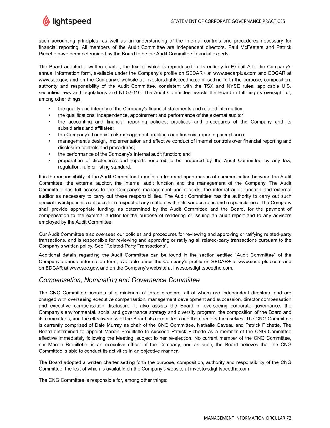 such accounting principles, as well as an understanding of the internal controls and procedures necessary for financial reporting. All members of the Audit Committee are independent directors. Paul McFeeters and Patrick Pichette have been determined by the Board to be the Audit Committee financial experts. The Board adopted a written charter, the text of which is reproduced in its entirety in Exhibit A to the Company’s annual information form, available under the Company’s profile on SEDAR+ at www.sedarplus.com and EDGAR at www.sec.gov, and on the Company’s website at investors.lightspeedhq.com, setting forth the purpose, composition, authority and responsibility of the Audit Committee, consistent with the TSX and NYSE rules, applicable U.S. securities laws and regulations and NI 52-110. The Audit Committee assists the Board in fulfilling its oversight of, among other things: • the quality and integrity of the Company’s financial statements and related information; • the qualifications, independence, appointment and performance of the external auditor; • the accounting and financial reporting policies, practices and procedures of the Company and its subsidiaries and affiliates; • the Company’s financial risk management practices and financial reporting compliance; • management’s design, implementation and effective conduct of internal controls over financial reporting and disclosure controls and procedures; • the performance of the Company’s internal audit function; and • preparation of disclosures and reports required to be prepared by the Audit Committee by any law, regulation, rule or listing standard. It is the responsibility of the Audit Committee to maintain free and open means of communication between the Audit Committee, the external auditor, the internal audit function and the management of the Company. The Audit Committee has full access to the Company’s management and records, the internal audit function and external auditor as necessary to carry out these responsibilities. The Audit Committee has the authority to carry out such special investigations as it sees fit in respect of any matters within its various roles and responsibilities. The Company shall provide appropriate funding, as determined by the Audit Committee and the Board, for the payment of compensation to the external auditor for the purpose of rendering or issuing an audit report and to any advisors employed by the Audit Committee. Our Audit Committee also oversees our policies and procedures for reviewing and approving or ratifying related-party transactions, and is responsible for reviewing and approving or ratifying all related-party transactions pursuant to the Company's written policy. See "Related-Party Transactions". Additional details regarding the Audit Committee can be found in the section entitled “Audit Committee” of the Company’s annual information form, available under the Company’s profile on SEDAR+ at www.sedarplus.com and on EDGAR at www.sec.gov, and on the Company’s website at investors.lightspeedhq.com. Compensation, Nominating and Governance Committee The CNG Committee consists of a minimum of three directors, all of whom are independent directors, and are charged with overseeing executive compensation, management development and succession, director compensation and executive compensation disclosure. It also assists the Board in overseeing corporate governance, the Company's environmental, social and governance strategy and diversity program, the composition of the Board and its committees, and the effectiveness of the Board, its committees and the directors themselves. The CNG Committee is currently comprised of Dale Murray as chair of the CNG Committee, Nathalie Gaveau and Patrick Pichette. The Board determined to appoint Manon Brouillette to succeed Patrick Pichette as a member of the CNG Committee effective immediately following the Meeting, subject to her re-election. No current member of the CNG Committee, nor Manon Brouillette, is an executive officer of the Company, and as such, the Board believes that the CNG Committee is able to conduct its activities in an objective manner. The Board adopted a written charter setting forth the purpose, composition, authority and responsibility of the CNG Committee, the text of which is available on the Company’s website at investors.lightspeedhq.com. The CNG Committee is responsible for, among other things: STATEMENT OF CORPORATE GOVERNANCE PRACTICES MANAGEMENT INFORMATION CIRCULAR 72