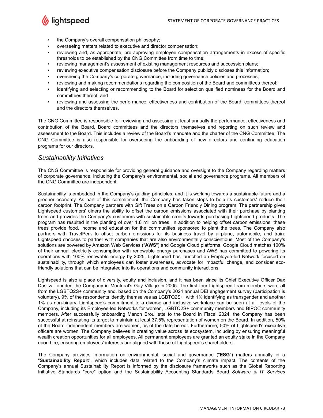 • the Company’s overall compensation philosophy; • overseeing matters related to executive and director compensation; • reviewing and, as appropriate, pre-approving employee compensation arrangements in excess of specific thresholds to be established by the CNG Committee from time to time; • reviewing management’s assessment of existing management resources and succession plans; • reviewing executive compensation disclosure before the Company publicly discloses this information; • overseeing the Company’s corporate governance, including governance policies and processes; • reviewing and making recommendations regarding the composition of the Board and committees thereof; • identifying and selecting or recommending to the Board for selection qualified nominees for the Board and committees thereof; and • reviewing and assessing the performance, effectiveness and contribution of the Board, committees thereof and the directors themselves. The CNG Committee is responsible for reviewing and assessing at least annually the performance, effectiveness and contribution of the Board, Board committees and the directors themselves and reporting on such review and assessment to the Board. This includes a review of the Board’s mandate and the charter of the CNG Committee. The CNG Committee is also responsible for overseeing the onboarding of new directors and continuing education programs for our directors. Sustainability Initiatives The CNG Committee is responsible for providing general guidance and oversight to the Company regarding matters of corporate governance, including the Company's environmental, social and governance programs. All members of the CNG Committee are independent. Sustainability is embedded in the Company's guiding principles, and it is working towards a sustainable future and a greener economy. As part of this commitment, the Company has taken steps to help its customers' reduce their carbon footprint. The Company partners with Gift Trees on a Carbon Friendly Dining program. The partnership gives Lightspeed customers' diners the ability to offset the carbon emissions associated with their purchase by planting trees and provides the Company's customers with sustainable credits towards purchasing Lightspeed products. The program has resulted in the planting of over 1.8 million trees. In addition to helping offset carbon emissions, these trees provide food, income and education for the communities sponsored to plant the trees. The Company also partners with TravelPerk to offset carbon emissions for its business travel by airplane, automobile, and train. Lightspeed chooses to partner with companies that are also environmentally conscientious. Most of the Company's solutions are powered by Amazon Web Services ("AWS") and Google Cloud platforms. Google Cloud matches 100% of their annual electricity consumption with renewable energy purchases and AWS has committed to powering its operations with 100% renewable energy by 2025. Lightspeed has launched an Employee-led Network focused on sustainability, through which employees can foster awareness, advocate for impactful change, and consider eco- friendly solutions that can be integrated into its operations and community interactions. Lightspeed is also a place of diversity, equity and inclusion, and it has been since its Chief Executive Officer Dax Dasilva founded the Company in Montreal’s Gay Village in 2005. The first four Lightspeed team members were all from the LGBTQ2S+ community and, based on the Company's 2024 annual DEI engagement survey (participation is voluntary), 9% of the respondents identify themselves as LGBTQ2S+, with 1% identifying as transgender and another 1% as non-binary. Lightspeed's commitment to a diverse and inclusive workplace can be seen at all levels of the Company, including its Employee-led Networks for women, LGBTQ2S+ community members and BIPOC community members. After successfully onboarding Manon Brouillette to the Board in Fiscal 2024, the Company has been successful at reinstating its target to maintain at least 37.5% representation of women on the Board. In addition, 50% of the Board independent members are women, as of the date hereof. Furthermore, 50% of Lightspeed's executive officers are women. The Company believes in creating value across its ecosystem, including by ensuring meaningful wealth creation opportunities for all employees. All permanent employees are granted an equity stake in the Company upon hire, ensuring employees’ interests are aligned with those of Lightspeed's shareholders. The Company provides information on environmental, social and governance ("ESG") matters annually in a "Sustainability Report", which includes data related to the Company’s climate impact. The contents of the Company's annual Sustainability Report is informed by the disclosure frameworks such as the Global Reporting Initiative Standards "core" option and the Sustainability Accounting Standards Board Software & IT Services STATEMENT OF CORPORATE GOVERNANCE PRACTICES MANAGEMENT INFORMATION CIRCULAR 73