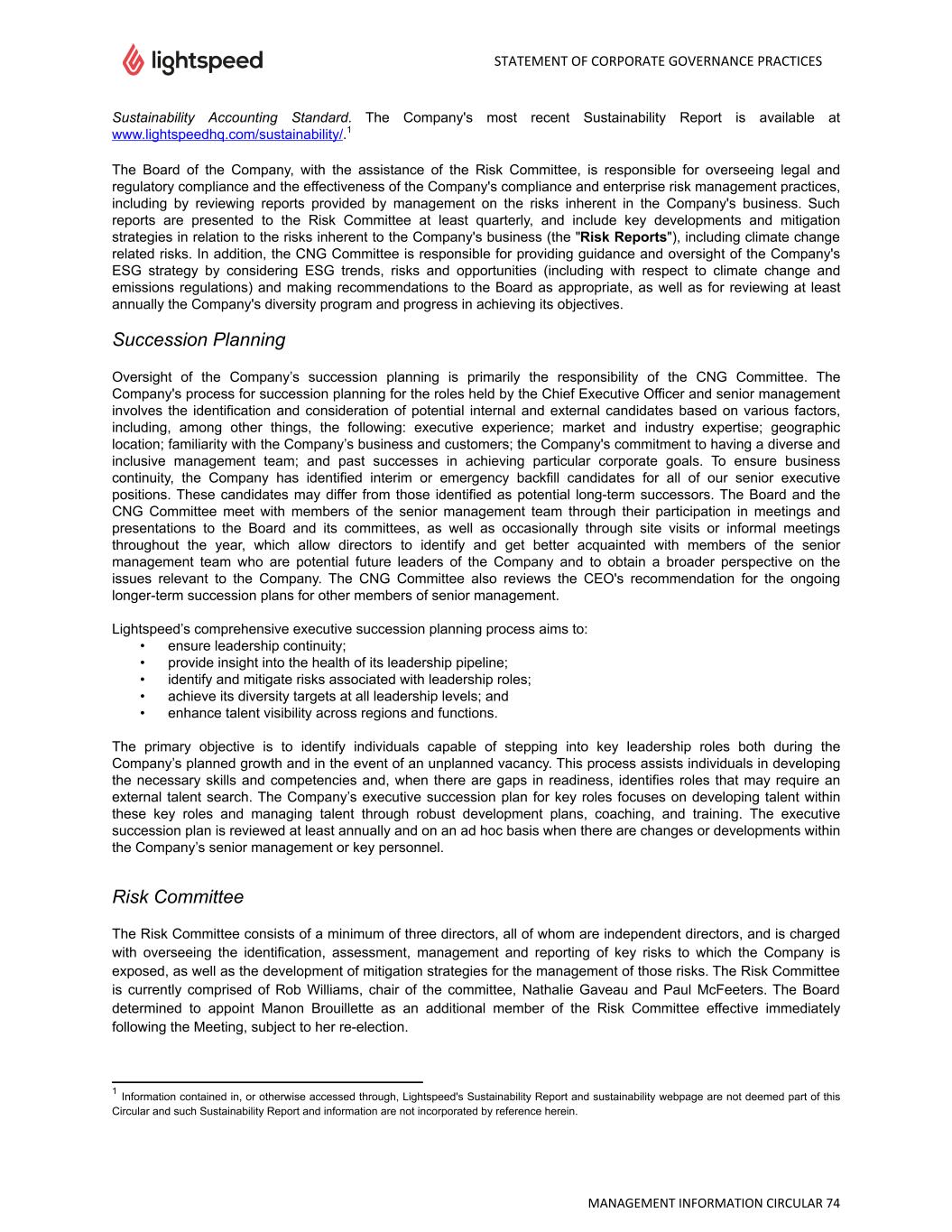 Sustainability Accounting Standard. The Company's most recent Sustainability Report is available at www.lightspeedhq.com/sustainability/.1 The Board of the Company, with the assistance of the Risk Committee, is responsible for overseeing legal and regulatory compliance and the effectiveness of the Company's compliance and enterprise risk management practices, including by reviewing reports provided by management on the risks inherent in the Company's business. Such reports are presented to the Risk Committee at least quarterly, and include key developments and mitigation strategies in relation to the risks inherent to the Company's business (the "Risk Reports"), including climate change related risks. In addition, the CNG Committee is responsible for providing guidance and oversight of the Company's ESG strategy by considering ESG trends, risks and opportunities (including with respect to climate change and emissions regulations) and making recommendations to the Board as appropriate, as well as for reviewing at least annually the Company's diversity program and progress in achieving its objectives. Succession Planning Oversight of the Company’s succession planning is primarily the responsibility of the CNG Committee. The Company's process for succession planning for the roles held by the Chief Executive Officer and senior management involves the identification and consideration of potential internal and external candidates based on various factors, including, among other things, the following: executive experience; market and industry expertise; geographic location; familiarity with the Company’s business and customers; the Company's commitment to having a diverse and inclusive management team; and past successes in achieving particular corporate goals. To ensure business continuity, the Company has identified interim or emergency backfill candidates for all of our senior executive positions. These candidates may differ from those identified as potential long-term successors. The Board and the CNG Committee meet with members of the senior management team through their participation in meetings and presentations to the Board and its committees, as well as occasionally through site visits or informal meetings throughout the year, which allow directors to identify and get better acquainted with members of the senior management team who are potential future leaders of the Company and to obtain a broader perspective on the issues relevant to the Company. The CNG Committee also reviews the CEO's recommendation for the ongoing longer-term succession plans for other members of senior management. Lightspeed’s comprehensive executive succession planning process aims to: • ensure leadership continuity; • provide insight into the health of its leadership pipeline; • identify and mitigate risks associated with leadership roles; • achieve its diversity targets at all leadership levels; and • enhance talent visibility across regions and functions. The primary objective is to identify individuals capable of stepping into key leadership roles both during the Company’s planned growth and in the event of an unplanned vacancy. This process assists individuals in developing the necessary skills and competencies and, when there are gaps in readiness, identifies roles that may require an external talent search. The Company’s executive succession plan for key roles focuses on developing talent within these key roles and managing talent through robust development plans, coaching, and training. The executive succession plan is reviewed at least annually and on an ad hoc basis when there are changes or developments within the Company’s senior management or key personnel. Risk Committee The Risk Committee consists of a minimum of three directors, all of whom are independent directors, and is charged with overseeing the identification, assessment, management and reporting of key risks to which the Company is exposed, as well as the development of mitigation strategies for the management of those risks. The Risk Committee is currently comprised of Rob Williams, chair of the committee, Nathalie Gaveau and Paul McFeeters. The Board determined to appoint Manon Brouillette as an additional member of the Risk Committee effective immediately following the Meeting, subject to her re-election. STATEMENT OF CORPORATE GOVERNANCE PRACTICES MANAGEMENT INFORMATION CIRCULAR 74 1 Information contained in, or otherwise accessed through, Lightspeed's Sustainability Report and sustainability webpage are not deemed part of this Circular and such Sustainability Report and information are not incorporated by reference herein.