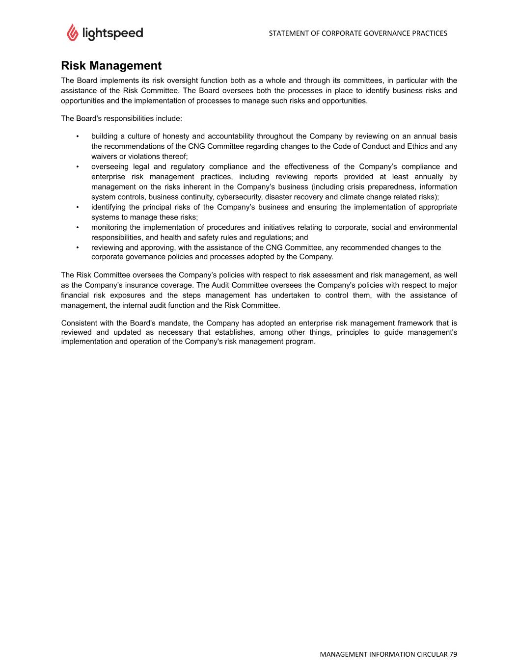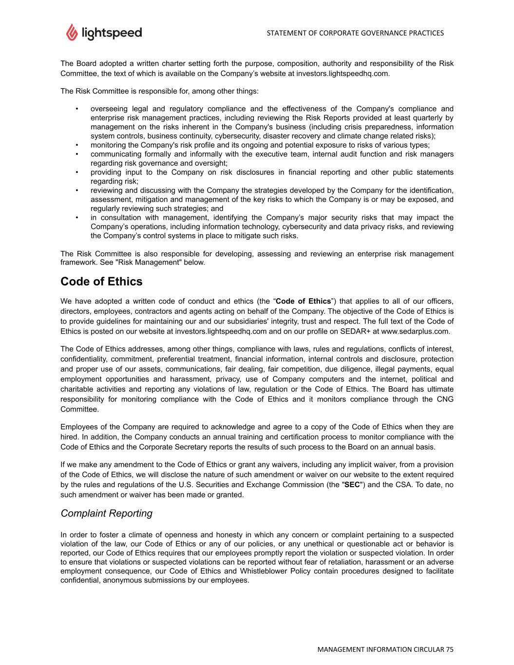 The Board adopted a written charter setting forth the purpose, composition, authority and responsibility of the Risk Committee, the text of which is available on the Company’s website at investors.lightspeedhq.com. The Risk Committee is responsible for, among other things: • overseeing legal and regulatory compliance and the effectiveness of the Company's compliance and enterprise risk management practices, including reviewing the Risk Reports provided at least quarterly by management on the risks inherent in the Company's business (including crisis preparedness, information system controls, business continuity, cybersecurity, disaster recovery and climate change related risks); • monitoring the Company's risk profile and its ongoing and potential exposure to risks of various types; • communicating formally and informally with the executive team, internal audit function and risk managers regarding risk governance and oversight; • providing input to the Company on risk disclosures in financial reporting and other public statements regarding risk; • reviewing and discussing with the Company the strategies developed by the Company for the identification, assessment, mitigation and management of the key risks to which the Company is or may be exposed, and regularly reviewing such strategies; and • in consultation with management, identifying the Company’s major security risks that may impact the Company’s operations, including information technology, cybersecurity and data privacy risks, and reviewing the Company’s control systems in place to mitigate such risks. The Risk Committee is also responsible for developing, assessing and reviewing an enterprise risk management framework. See "Risk Management" below. Code of Ethics We have adopted a written code of conduct and ethics (the “Code of Ethics”) that applies to all of our officers, directors, employees, contractors and agents acting on behalf of the Company. The objective of the Code of Ethics is to provide guidelines for maintaining our and our subsidiaries' integrity, trust and respect. The full text of the Code of Ethics is posted on our website at investors.lightspeedhq.com and on our profile on SEDAR+ at www.sedarplus.com. The Code of Ethics addresses, among other things, compliance with laws, rules and regulations, conflicts of interest, confidentiality, commitment, preferential treatment, financial information, internal controls and disclosure, protection and proper use of our assets, communications, fair dealing, fair competition, due diligence, illegal payments, equal employment opportunities and harassment, privacy, use of Company computers and the internet, political and charitable activities and reporting any violations of law, regulation or the Code of Ethics. The Board has ultimate responsibility for monitoring compliance with the Code of Ethics and it monitors compliance through the CNG Committee. Employees of the Company are required to acknowledge and agree to a copy of the Code of Ethics when they are hired. In addition, the Company conducts an annual training and certification process to monitor compliance with the Code of Ethics and the Corporate Secretary reports the results of such process to the Board on an annual basis. If we make any amendment to the Code of Ethics or grant any waivers, including any implicit waiver, from a provision of the Code of Ethics, we will disclose the nature of such amendment or waiver on our website to the extent required by the rules and regulations of the U.S. Securities and Exchange Commission (the "SEC") and the CSA. To date, no such amendment or waiver has been made or granted. Complaint Reporting In order to foster a climate of openness and honesty in which any concern or complaint pertaining to a suspected violation of the law, our Code of Ethics or any of our policies, or any unethical or questionable act or behavior is reported, our Code of Ethics requires that our employees promptly report the violation or suspected violation. In order to ensure that violations or suspected violations can be reported without fear of retaliation, harassment or an adverse employment consequence, our Code of Ethics and Whistleblower Policy contain procedures designed to facilitate confidential, anonymous submissions by our employees. STATEMENT OF CORPORATE GOVERNANCE PRACTICES MANAGEMENT INFORMATION CIRCULAR 75