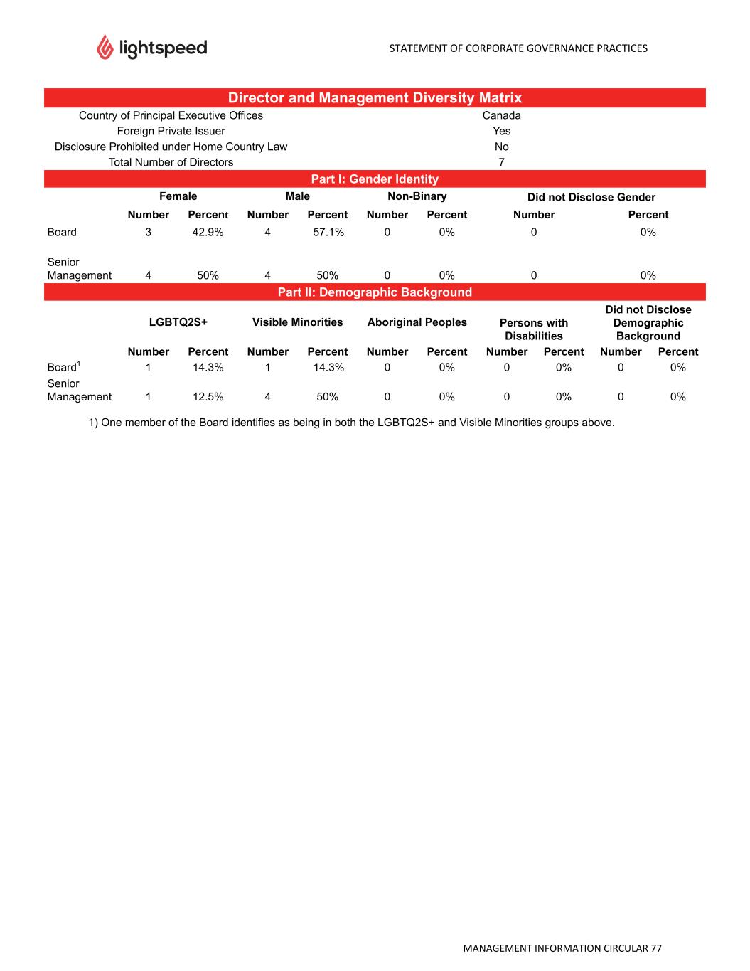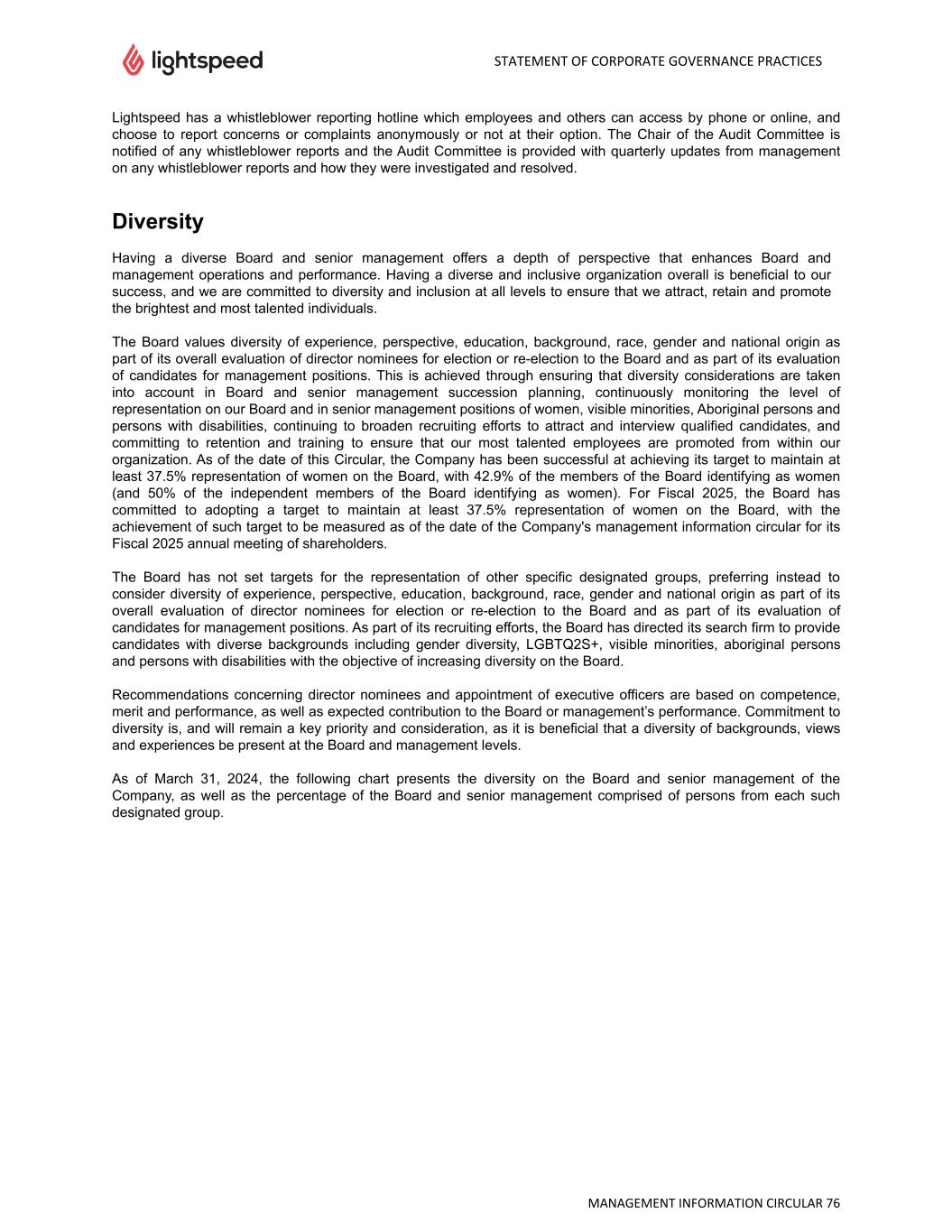 Lightspeed has a whistleblower reporting hotline which employees and others can access by phone or online, and choose to report concerns or complaints anonymously or not at their option. The Chair of the Audit Committee is notified of any whistleblower reports and the Audit Committee is provided with quarterly updates from management on any whistleblower reports and how they were investigated and resolved. Diversity Having a diverse Board and senior management offers a depth of perspective that enhances Board and management operations and performance. Having a diverse and inclusive organization overall is beneficial to our success, and we are committed to diversity and inclusion at all levels to ensure that we attract, retain and promote the brightest and most talented individuals. The Board values diversity of experience, perspective, education, background, race, gender and national origin as part of its overall evaluation of director nominees for election or re-election to the Board and as part of its evaluation of candidates for management positions. This is achieved through ensuring that diversity considerations are taken into account in Board and senior management succession planning, continuously monitoring the level of representation on our Board and in senior management positions of women, visible minorities, Aboriginal persons and persons with disabilities, continuing to broaden recruiting efforts to attract and interview qualified candidates, and committing to retention and training to ensure that our most talented employees are promoted from within our organization. As of the date of this Circular, the Company has been successful at achieving its target to maintain at least 37.5% representation of women on the Board, with 42.9% of the members of the Board identifying as women (and 50% of the independent members of the Board identifying as women). For Fiscal 2025, the Board has committed to adopting a target to maintain at least 37.5% representation of women on the Board, with the achievement of such target to be measured as of the date of the Company's management information circular for its Fiscal 2025 annual meeting of shareholders. The Board has not set targets for the representation of other specific designated groups, preferring instead to consider diversity of experience, perspective, education, background, race, gender and national origin as part of its overall evaluation of director nominees for election or re-election to the Board and as part of its evaluation of candidates for management positions. As part of its recruiting efforts, the Board has directed its search firm to provide candidates with diverse backgrounds including gender diversity, LGBTQ2S+, visible minorities, aboriginal persons and persons with disabilities with the objective of increasing diversity on the Board. Recommendations concerning director nominees and appointment of executive officers are based on competence, merit and performance, as well as expected contribution to the Board or management’s performance. Commitment to diversity is, and will remain a key priority and consideration, as it is beneficial that a diversity of backgrounds, views and experiences be present at the Board and management levels. As of March 31, 2024, the following chart presents the diversity on the Board and senior management of the Company, as well as the percentage of the Board and senior management comprised of persons from each such designated group. STATEMENT OF CORPORATE GOVERNANCE PRACTICES MANAGEMENT INFORMATION CIRCULAR 76