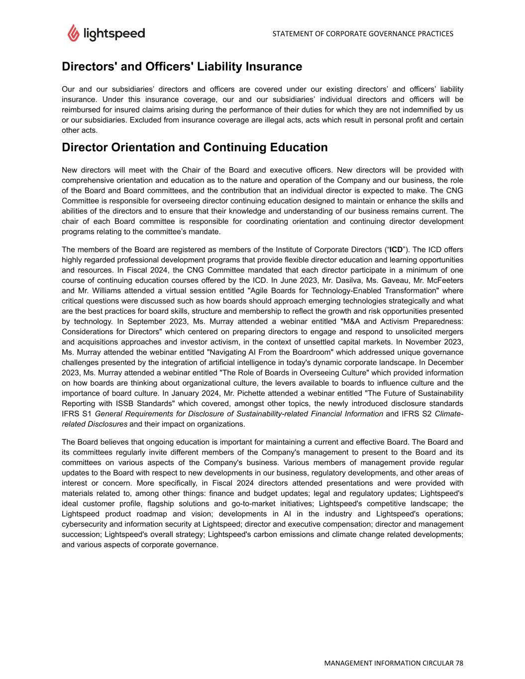 Directors' and Officers' Liability Insurance Our and our subsidiaries’ directors and officers are covered under our existing directors’ and officers’ liability insurance. Under this insurance coverage, our and our subsidiaries’ individual directors and officers will be reimbursed for insured claims arising during the performance of their duties for which they are not indemnified by us or our subsidiaries. Excluded from insurance coverage are illegal acts, acts which result in personal profit and certain other acts. Director Orientation and Continuing Education New directors will meet with the Chair of the Board and executive officers. New directors will be provided with comprehensive orientation and education as to the nature and operation of the Company and our business, the role of the Board and Board committees, and the contribution that an individual director is expected to make. The CNG Committee is responsible for overseeing director continuing education designed to maintain or enhance the skills and abilities of the directors and to ensure that their knowledge and understanding of our business remains current. The chair of each Board committee is responsible for coordinating orientation and continuing director development programs relating to the committee’s mandate. The members of the Board are registered as members of the Institute of Corporate Directors (“ICD”). The ICD offers highly regarded professional development programs that provide flexible director education and learning opportunities and resources. In Fiscal 2024, the CNG Committee mandated that each director participate in a minimum of one course of continuing education courses offered by the ICD. In June 2023, Mr. Dasilva, Ms. Gaveau, Mr. McFeeters and Mr. Williams attended a virtual session entitled "Agile Boards for Technology-Enabled Transformation" where critical questions were discussed such as how boards should approach emerging technologies strategically and what are the best practices for board skills, structure and membership to reflect the growth and risk opportunities presented by technology. In September 2023, Ms. Murray attended a webinar entitled "M&A and Activism Preparedness: Considerations for Directors" which centered on preparing directors to engage and respond to unsolicited mergers and acquisitions approaches and investor activism, in the context of unsettled capital markets. In November 2023, Ms. Murray attended the webinar entitled "Navigating AI From the Boardroom" which addressed unique governance challenges presented by the integration of artificial intelligence in today's dynamic corporate landscape. In December 2023, Ms. Murray attended a webinar entitled "The Role of Boards in Overseeing Culture" which provided information on how boards are thinking about organizational culture, the levers available to boards to influence culture and the importance of board culture. In January 2024, Mr. Pichette attended a webinar entitled "The Future of Sustainability Reporting with ISSB Standards" which covered, amongst other topics, the newly introduced disclosure standards IFRS S1 General Requirements for Disclosure of Sustainability-related Financial Information and IFRS S2 Climate- related Disclosures and their impact on organizations. The Board believes that ongoing education is important for maintaining a current and effective Board. The Board and its committees regularly invite different members of the Company's management to present to the Board and its committees on various aspects of the Company's business. Various members of management provide regular updates to the Board with respect to new developments in our business, regulatory developments, and other areas of interest or concern. More specifically, in Fiscal 2024 directors attended presentations and were provided with materials related to, among other things: finance and budget updates; legal and regulatory updates; Lightspeed's ideal customer profile, flagship solutions and go-to-market initiatives; Lightspeed's competitive landscape; the Lightspeed product roadmap and vision; developments in AI in the industry and Lightspeed's operations; cybersecurity and information security at Lightspeed; director and executive compensation; director and management succession; Lightspeed's overall strategy; Lightspeed's carbon emissions and climate change related developments; and various aspects of corporate governance. STATEMENT OF CORPORATE GOVERNANCE PRACTICES MANAGEMENT INFORMATION CIRCULAR 78