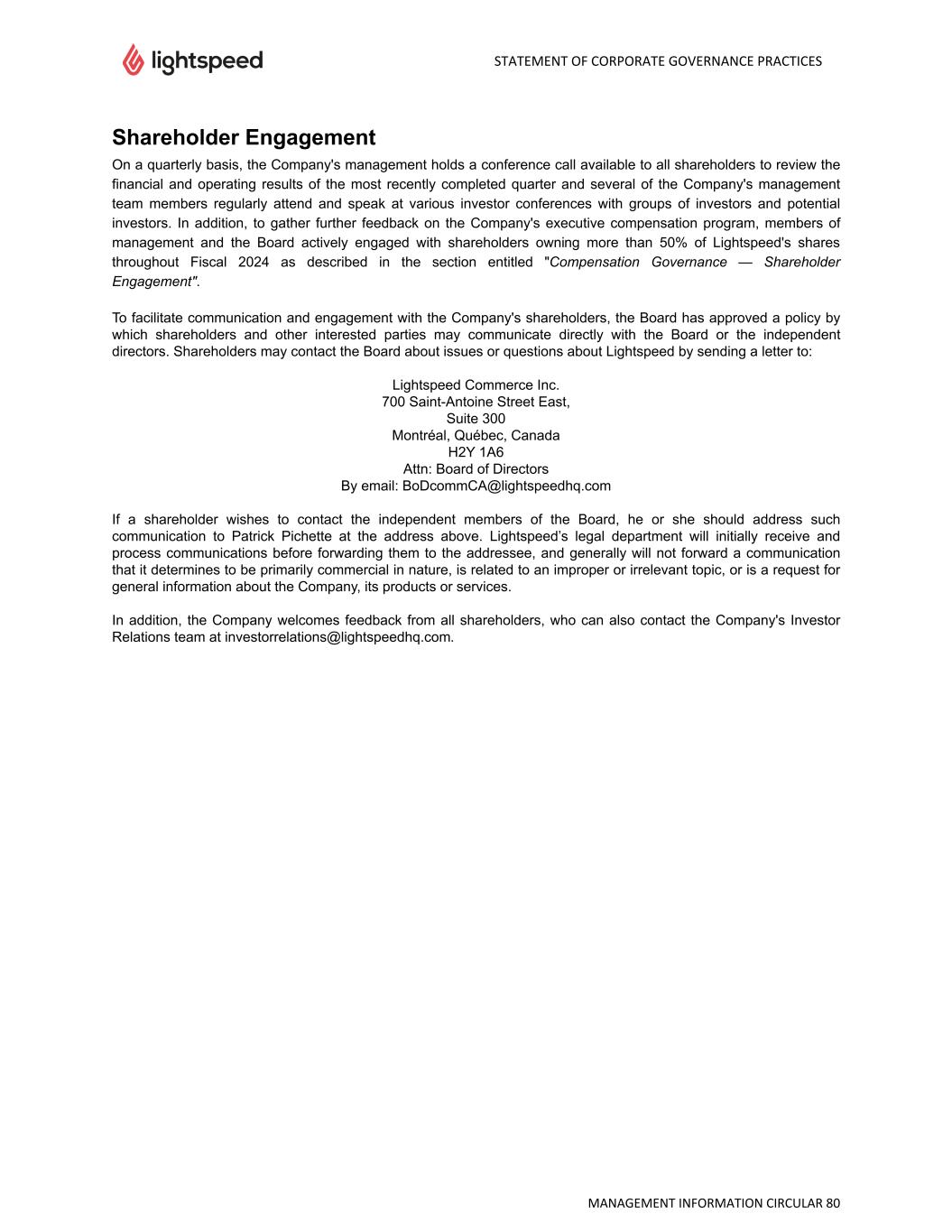 Shareholder Engagement On a quarterly basis, the Company's management holds a conference call available to all shareholders to review the financial and operating results of the most recently completed quarter and several of the Company's management team members regularly attend and speak at various investor conferences with groups of investors and potential investors. In addition, to gather further feedback on the Company's executive compensation program, members of management and the Board actively engaged with shareholders owning more than 50% of Lightspeed's shares throughout Fiscal 2024 as described in the section entitled "Compensation Governance — Shareholder Engagement". To facilitate communication and engagement with the Company's shareholders, the Board has approved a policy by which shareholders and other interested parties may communicate directly with the Board or the independent directors. Shareholders may contact the Board about issues or questions about Lightspeed by sending a letter to: Lightspeed Commerce Inc. 700 Saint-Antoine Street East, Suite 300 Montréal, Québec, Canada H2Y 1A6 Attn: Board of Directors By email: BoDcommCA@lightspeedhq.com If a shareholder wishes to contact the independent members of the Board, he or she should address such communication to Patrick Pichette at the address above. Lightspeed’s legal department will initially receive and process communications before forwarding them to the addressee, and generally will not forward a communication that it determines to be primarily commercial in nature, is related to an improper or irrelevant topic, or is a request for general information about the Company, its products or services. In addition, the Company welcomes feedback from all shareholders, who can also contact the Company's Investor Relations team at investorrelations@lightspeedhq.com. STATEMENT OF CORPORATE GOVERNANCE PRACTICES MANAGEMENT INFORMATION CIRCULAR 80