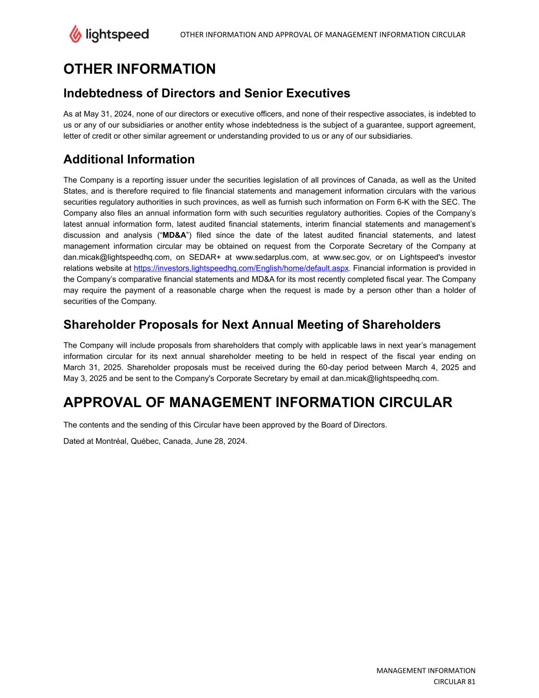 OTHER INFORMATION Indebtedness of Directors and Senior Executives As at May 31, 2024, none of our directors or executive officers, and none of their respective associates, is indebted to us or any of our subsidiaries or another entity whose indebtedness is the subject of a guarantee, support agreement, letter of credit or other similar agreement or understanding provided to us or any of our subsidiaries. Additional Information The Company is a reporting issuer under the securities legislation of all provinces of Canada, as well as the United States, and is therefore required to file financial statements and management information circulars with the various securities regulatory authorities in such provinces, as well as furnish such information on Form 6-K with the SEC. The Company also files an annual information form with such securities regulatory authorities. Copies of the Company’s latest annual information form, latest audited financial statements, interim financial statements and management’s discussion and analysis (“MD&A”) filed since the date of the latest audited financial statements, and latest management information circular may be obtained on request from the Corporate Secretary of the Company at dan.micak@lightspeedhq.com, on SEDAR+ at www.sedarplus.com, at www.sec.gov, or on Lightspeed's investor relations website at https://investors.lightspeedhq.com/English/home/default.aspx. Financial information is provided in the Company’s comparative financial statements and MD&A for its most recently completed fiscal year. The Company may require the payment of a reasonable charge when the request is made by a person other than a holder of securities of the Company. Shareholder Proposals for Next Annual Meeting of Shareholders The Company will include proposals from shareholders that comply with applicable laws in next year’s management information circular for its next annual shareholder meeting to be held in respect of the fiscal year ending on March 31, 2025. Shareholder proposals must be received during the 60-day period between March 4, 2025 and May 3, 2025 and be sent to the Company's Corporate Secretary by email at dan.micak@lightspeedhq.com. APPROVAL OF MANAGEMENT INFORMATION CIRCULAR The contents and the sending of this Circular have been approved by the Board of Directors. Dated at Montréal, Québec, Canada, June 28, 2024. OTHER INFORMATION AND APPROVAL OF MANAGEMENT INFORMATION CIRCULAR MANAGEMENT INFORMATION CIRCULAR 81