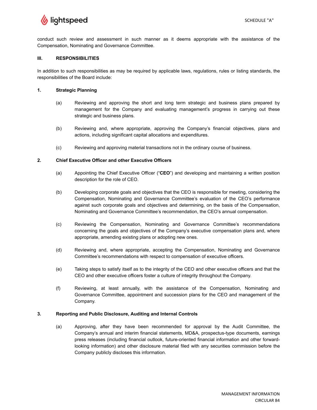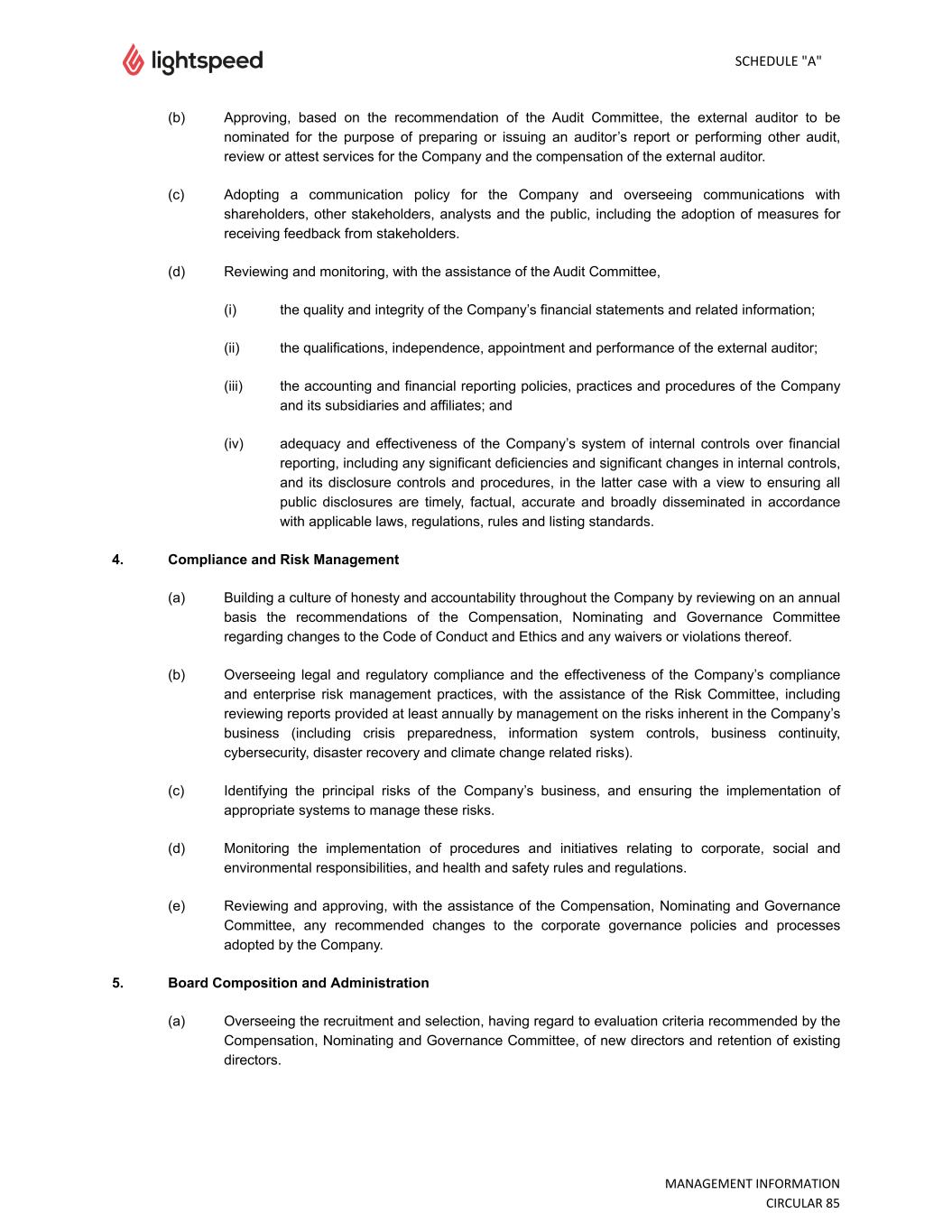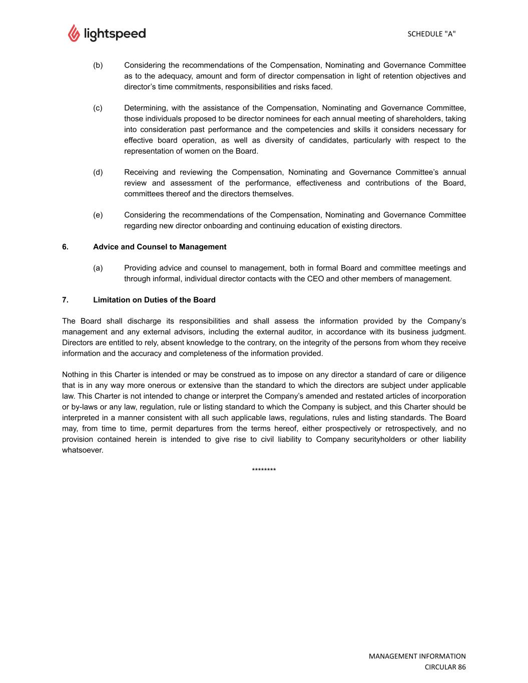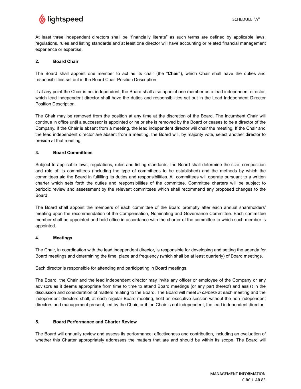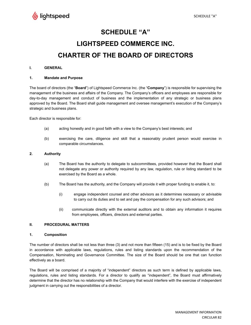 SCHEDULE “A” LIGHTSPEED COMMERCE INC. CHARTER OF THE BOARD OF DIRECTORS I. GENERAL 1. Mandate and Purpose The board of directors (the “Board”) of Lightspeed Commerce Inc. (the “Company”) is responsible for supervising the management of the business and affairs of the Company. The Company’s officers and employees are responsible for day-to-day management and conduct of business and the implementation of any strategic or business plans approved by the Board. The Board shall guide management and oversee management’s execution of the Company’s strategic and business plans. Each director is responsible for: (a) acting honestly and in good faith with a view to the Company’s best interests; and (b) exercising the care, diligence and skill that a reasonably prudent person would exercise in comparable circumstances. 2. Authority (a) The Board has the authority to delegate to subcommittees, provided however that the Board shall not delegate any power or authority required by any law, regulation, rule or listing standard to be exercised by the Board as a whole. (b) The Board has the authority, and the Company will provide it with proper funding to enable it, to: (i) engage independent counsel and other advisors as it determines necessary or advisable to carry out its duties and to set and pay the compensation for any such advisors; and (ii) communicate directly with the external auditors and to obtain any information it requires from employees, officers, directors and external parties. II. PROCEDURAL MATTERS 1. Composition The number of directors shall be not less than three (3) and not more than fifteen (15) and is to be fixed by the Board in accordance with applicable laws, regulations, rules and listing standards upon the recommendation of the Compensation, Nominating and Governance Committee. The size of the Board should be one that can function effectively as a board. The Board will be comprised of a majority of “independent” directors as such term is defined by applicable laws, regulations, rules and listing standards. For a director to qualify as “independent”, the Board must affirmatively determine that the director has no relationship with the Company that would interfere with the exercise of independent judgment in carrying out the responsibilities of a director. SCHEDULE "A" MANAGEMENT INFORMATION CIRCULAR 82