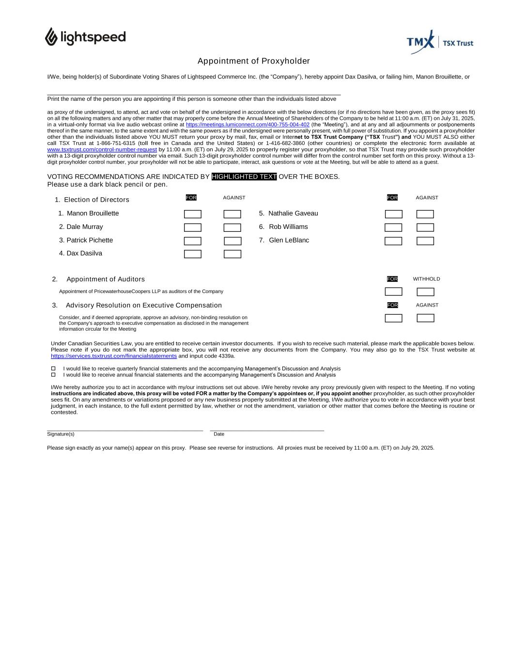 Appointment of Proxyholder I/We, being holder(s) of Subordinate Voting Shares of Lightspeed Commerce Inc. (the “Company”), hereby appoint Dax Dasilva, or failing him, Manon Brouillette, or _______________________________________________________________________________ Print the name of the person you are appointing if this person is someone other than the individuals listed above as proxy of the undersigned, to attend, act and vote on behalf of the undersigned in accordance with the below directions (or if no directions have been given, as the proxy sees fit) on all the following matters and any other matter that may properly come before the Annual Meeting of Shareholders of the Company to be held at 11:00 a.m. (ET) on July 31, 2025, in a virtual-only format via live audio webcast online at https://meetings.lumiconnect.com/400-755-004-402 (the “Meeting”), and at any and all adjournments or postponements thereof in the same manner, to the same extent and with the same powers as if the undersigned were personally present, with full power of substitution. If you appoint a proxyholder other than the individuals listed above YOU MUST return your proxy by mail, fax, email or Internet to TSX Trust Company (“TSX Trust”) and YOU MUST ALSO either call TSX Trust at 1-866-751-6315 (toll free in Canada and the United States) or 1-416-682-3860 (other countries) or complete the electronic form available at www.tsxtrust.com/control-number-request by 11:00 a.m. (ET) on July 29, 2025 to properly register your proxyholder, so that TSX Trust may provide such proxyholder with a 13-digit proxyholder control number via email. Such 13-digit proxyholder control number will differ from the control number set forth on this proxy. Without a 13- digit proxyholder control number, your proxyholder will not be able to participate, interact, ask questions or vote at the Meeting, but will be able to attend as a guest. , NC 2 VOTING RECOMMENDATIONS ARE INDICATED BY HIGHLIGHTED TEXT OVER THE BOXES. Please use a dark black pencil or pen. 1. Election of Directors 1. Manon Brouillette 5. Nathalie Gaveau   2. Dale Murray 6. Rob Williams 3. Patrick Pichette 7. Glen LeBlanc 4. Dax Dasilva 2. Appointment of Auditors Appointment of PricewaterhouseCoopers LLP as auditors of the Company 3. Advisory Resolution on Executive Compensation Consider, and if deemed appropriate, approve an advisory, non-binding resolution on the Company's approach to executive compensation as disclosed in the management information circular for the Meeting FOR AGAINST FOR AGAINST Under Canadian Securities Law, you are entitled to receive certain investor documents. If you wish to receive such material, please mark the applicable boxes below. Please note if you do not mark the appropriate box, you will not receive any documents from the Company. You may also go to the TSX Trust website at https://services.tsxtrust.com/financialstatements and input code 4339a.  I would like to receive quarterly financial statements and the accompanying Management’s Discussion and Analysis  I would like to receive annual financial statements and the accompanying Management’s Discussion and Analysis I/We hereby authorize you to act in accordance with my/our instructions set out above. I/We hereby revoke any proxy previously given with respect to the Meeting. If no voting instructions are indicated above, this proxy will be voted FOR a matter by the Company’s appointees or, if you appoint another proxyholder, as such other proxyholder sees fit. On any amendments or variations proposed or any new business properly submitted at the Meeting, I/We authorize you to vote in accordance with your best judgment, in each instance, to the full extent permitted by law, whether or not the amendment, variation or other matter that comes before the Meeting is routine or contested. ________________________________________________________ _________________________________________ Signature(s) Date Please sign exactly as your name(s) appear on this proxy. Please see reverse for instructions. All proxies must be received by 11:00 a.m. (ET) on July 29, 2025. FOR WITHHOLD FOR AGAINST