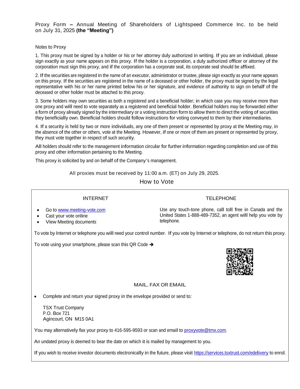 Proxy Form – Annual Meeting of Shareholders of Lightspeed Commerce Inc. to be held on July 31, 2025 (the “Meeting”) Notes to Proxy 1. This proxy must be signed by a holder or his or her attorney duly authorized in writing. If you are an individual, please sign exactly as your name appears on this proxy. If the holder is a corporation, a duly authorized officer or attorney of the corporation must sign this proxy, and if the corporation has a corporate seal, its corporate seal should be affixed. 2. If the securities are registered in the name of an executor, administrator or trustee, please sign exactly as your name appears on this proxy. If the securities are registered in the name of a deceased or other holder, the proxy must be signed by the legal representative with his or her name printed below his or her signature, and evidence of authority to sign on behalf of the deceased or other holder must be attached to this proxy. 3. Some holders may own securities as both a registered and a beneficial holder; in which case you may receive more than one proxy and will need to vote separately as a registered and beneficial holder. Beneficial holders may be forwarded either a form of proxy already signed by the intermediary or a voting instruction form to allow them to direct the voting of securities they beneficially own. Beneficial holders should follow instructions for voting conveyed to them by their intermediaries. 4. If a security is held by two or more individuals, any one of them present or represented by proxy at the Meeting may, in the absence of the other or others, vote at the Meeting. However, if one or more of them are present or represented by proxy, they must vote together in respect of such security. All holders should refer to the management information circular for further information regarding completion and use of this proxy and other information pertaining to the Meeting. This proxy is solicited by and on behalf of the Company’s management. All proxies must be received by 11:00 a.m. (ET) on July 29, 2025. How to Vote INTERNET  Go to www.meeting-vote.com  Cast your vote online  View Meeting documents TELEPHONE Use any touch-tone phone, call toll free in Canada and the United States 1-888-489-7352, an agent will help you vote by telephone. To vote by Internet or telephone you will need your control number. If you vote by Internet or telephone, do not return this proxy. To vote using your smartphone, please scan this QR Code  MAIL, FAX OR EMAIL  Complete and return your signed proxy in the envelope provided or send to: TSX Trust Company P.O. Box 721 Agincourt, ON M1S 0A1 You may alternatively fax your proxy to 416-595-9593 or scan and email to proxyvote@tmx.com. An undated proxy is deemed to bear the date on which it is mailed by management to you. If you wish to receive investor documents electronically in the future, please visit https://services.tsxtrust.com/edelivery to enrol.