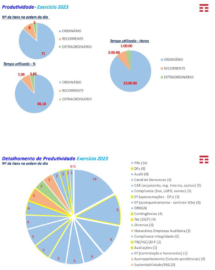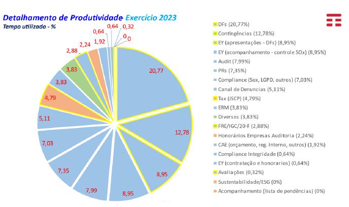 I. Analyzed the annual work plan of the Independent Auditors and discussed the results of their activities in ten (10) topics during the year of 2023. The Ernst & Young Auditores Independentes S/S (“EY”) was the firm responsible for auditing the financial statements for the fiscal year ended on December 31st, 2023, and for the planning and execution of the audits regarding the quarterly reports ("ITRs"), according to the recognized standards, as well as responsible for the special revision of the ITRs (quarterly reports), submitted to the CVM. Their opinion should ensure that these Financial Statements adequately represent the Company's equity and financial position, in accordance with accounting practices adopted in Brazil, the Brazilian Corporate Law, the CVM Rules and the International Financial Reporting Standards (IFRS) issued by the International Accounting Standard Board (IASB). The EY was also the auditor firm responsible for reviewing Form 20-F (SEC) of the Company.