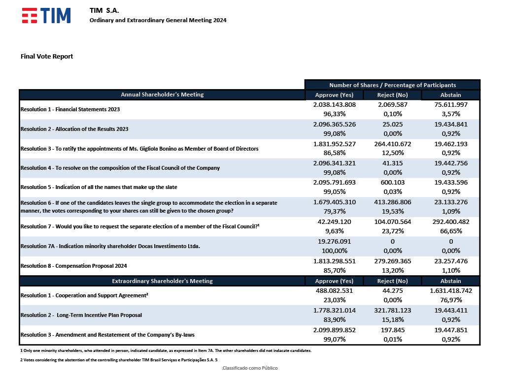 to the minutes of the Annual and Extraordinary Shareholders’ Meeting of TIM S.A.