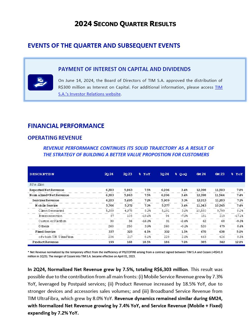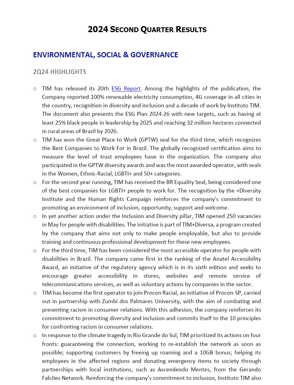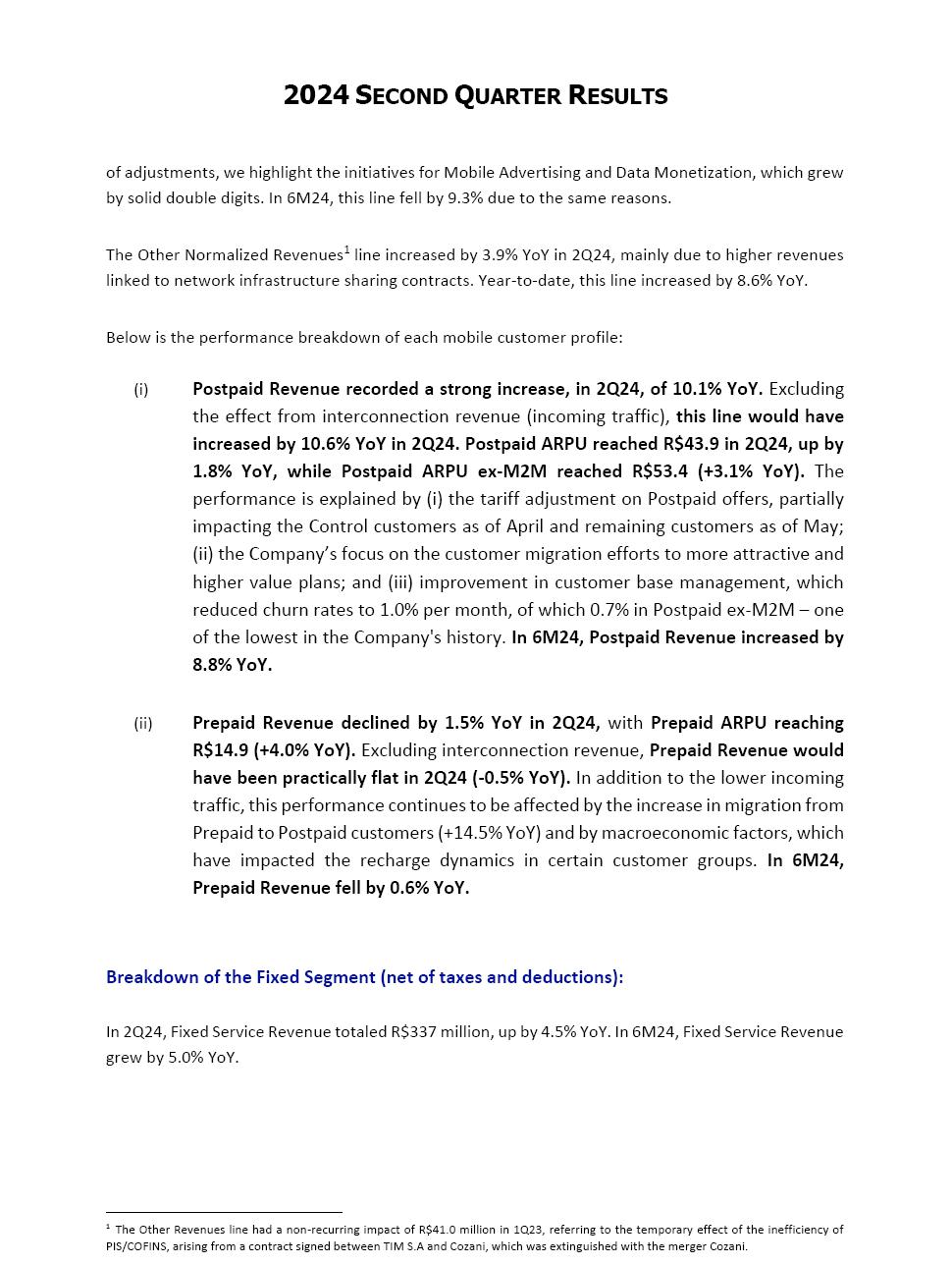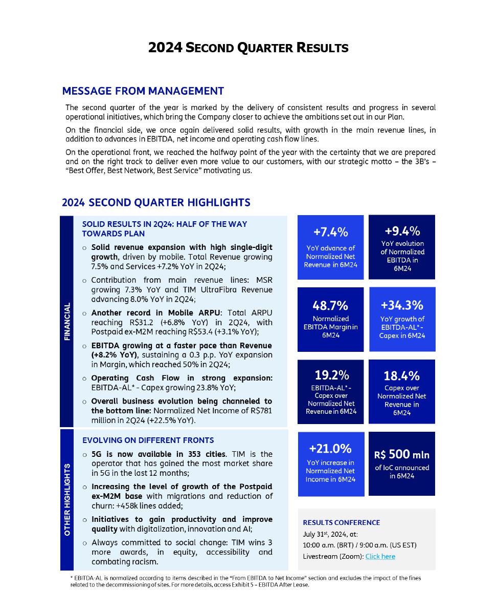 The Members of the Fiscal Council of TIM S.A. ("Company"), in the exercise of their attributions and legal duties, as provided in Article 163 of the Brazilian Corporate Law, conducted a review and analysis of the quarterly financial statements, along with the limited review report of Ernst & Young Auditores Independentes S/S (“EY”), for the period that ended on March 31st, 2024, and taking into account the information provided by the Company's management and the Independent Auditors, consider the information appropriate for presentation to the Board of Directors of the Company, in accordance to the Brazilian Corporate Law.