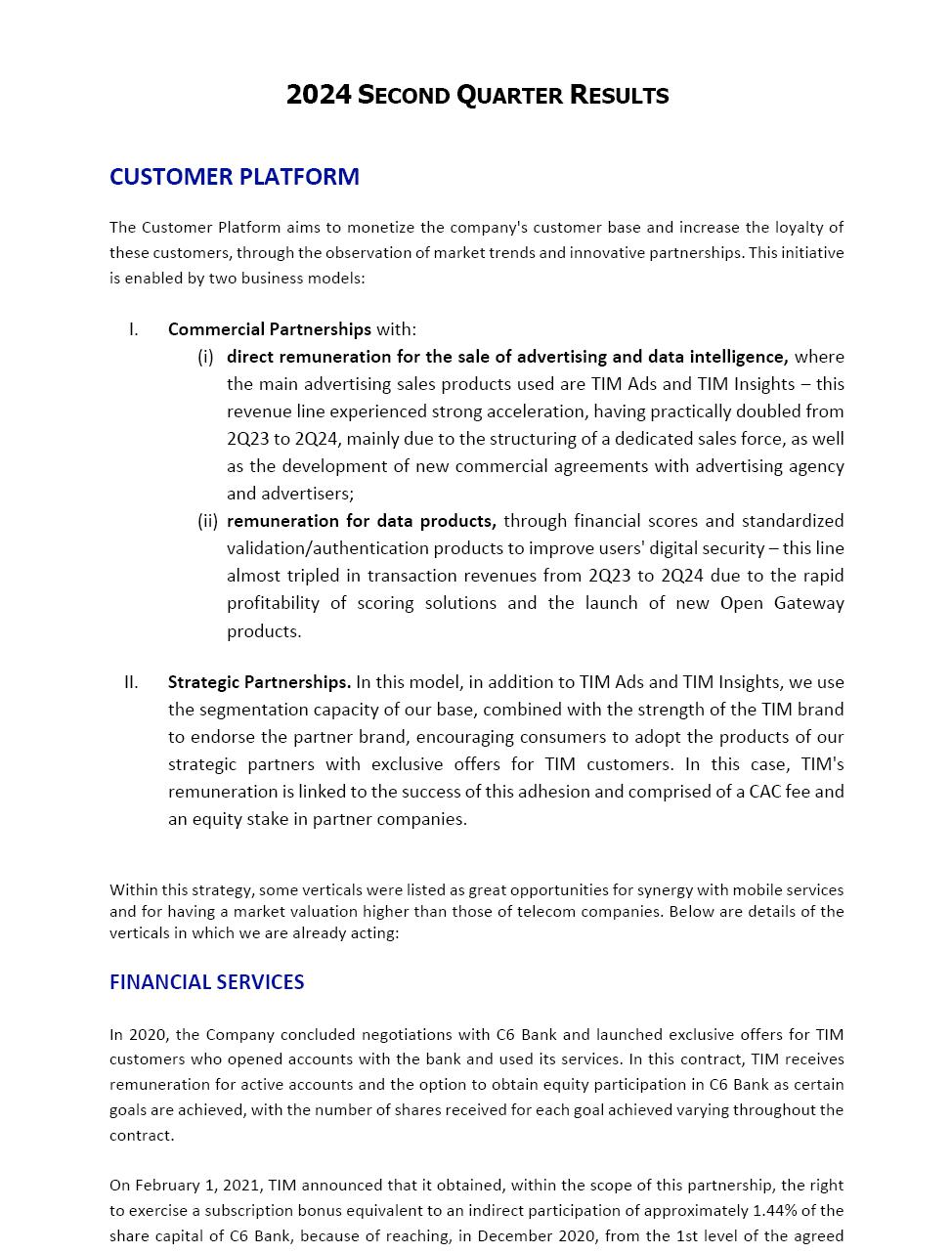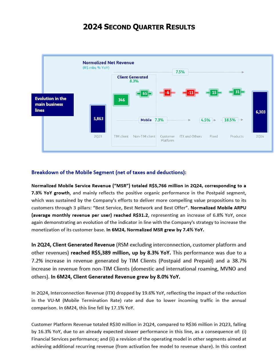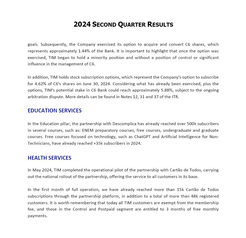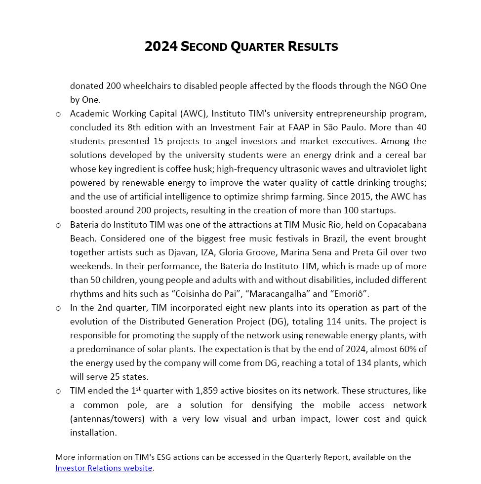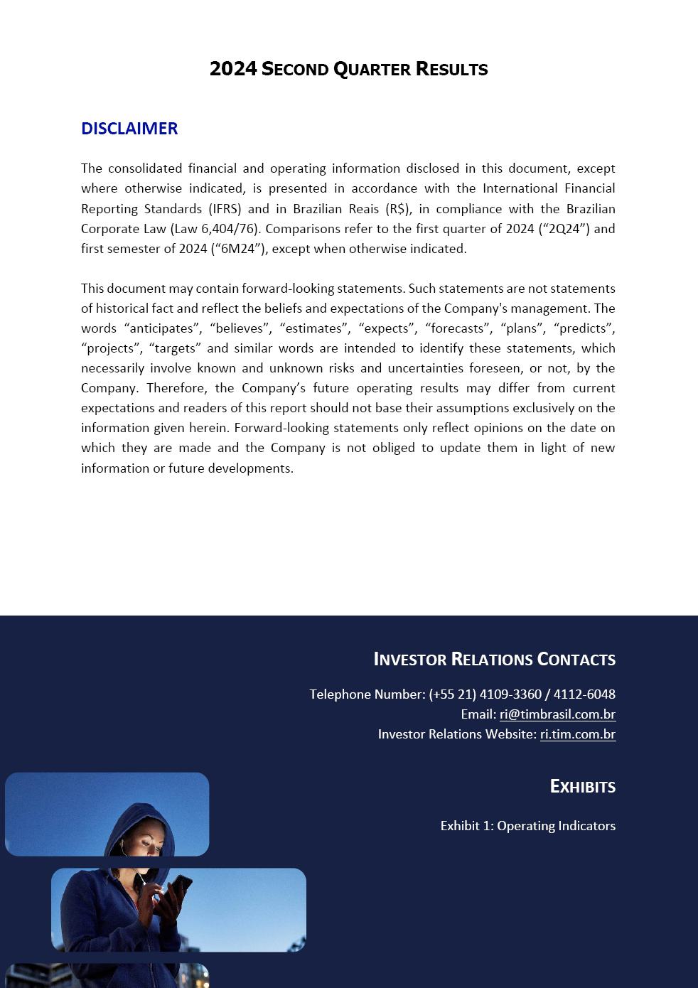 The Members of the Fiscal Council of TIM S.A. ("Company"), in the exercise of their attributions and legal duties, as provided in Article 163 of the Brazilian Corporate Law, conducted a review and analysis of the quarterly financial statements, along with the limited review report of Ernst & Young Auditores Independentes S/S (“EY”), for the period that ended on March 31st, 2024, and taking into account the information provided by the Company's management and the Independent Auditors, consider the information appropriate for presentation to the Board of Directors of the Company, in accordance to the Brazilian Corporate Law.