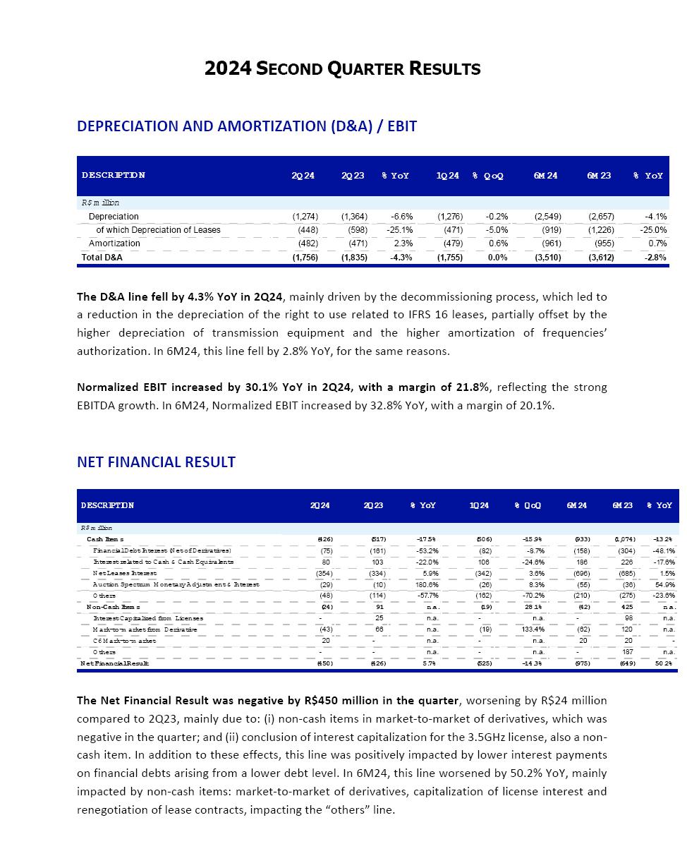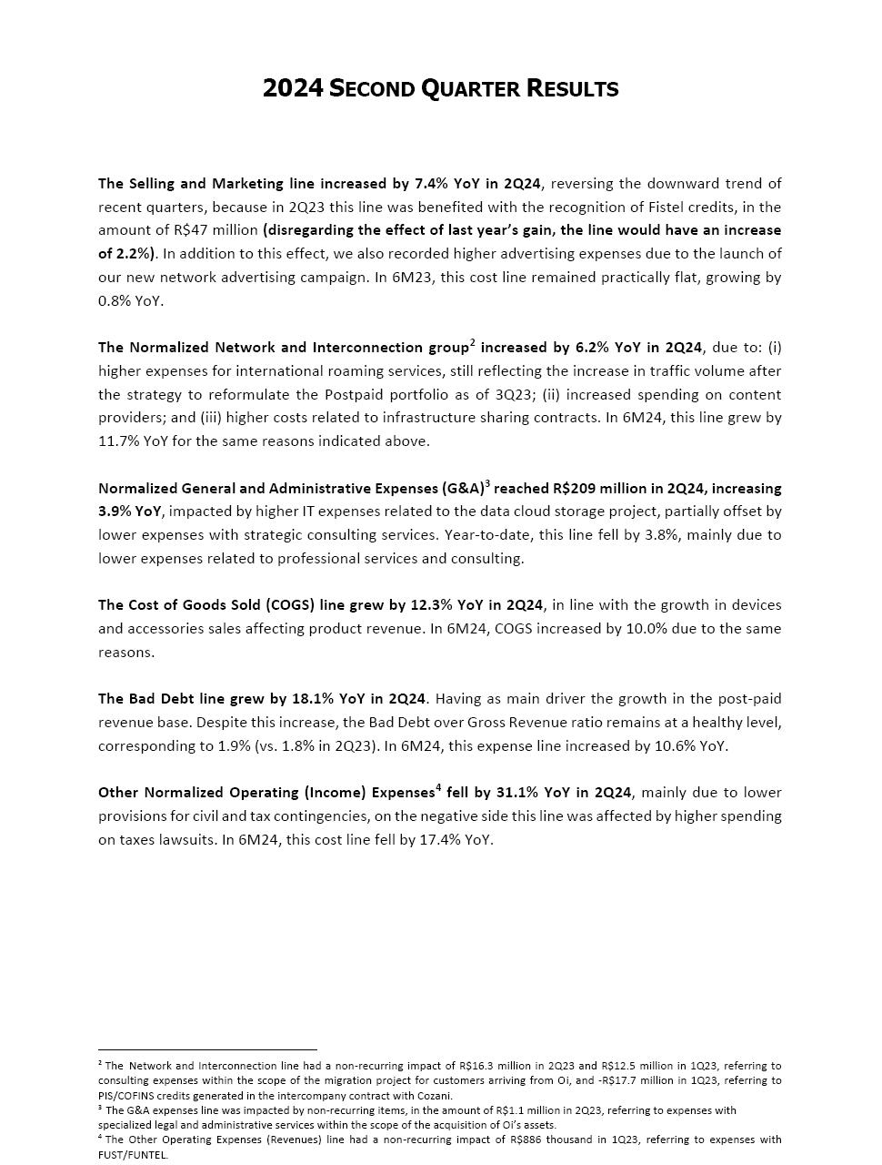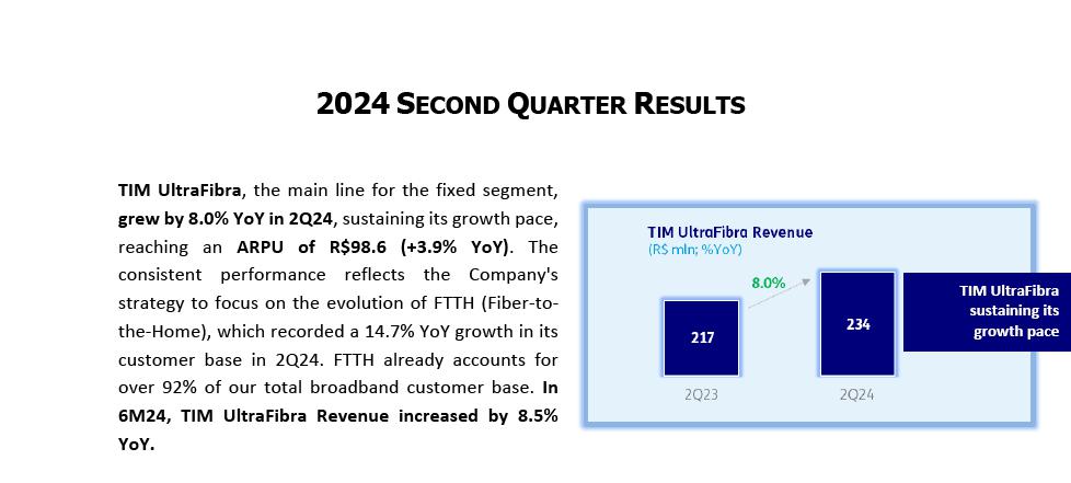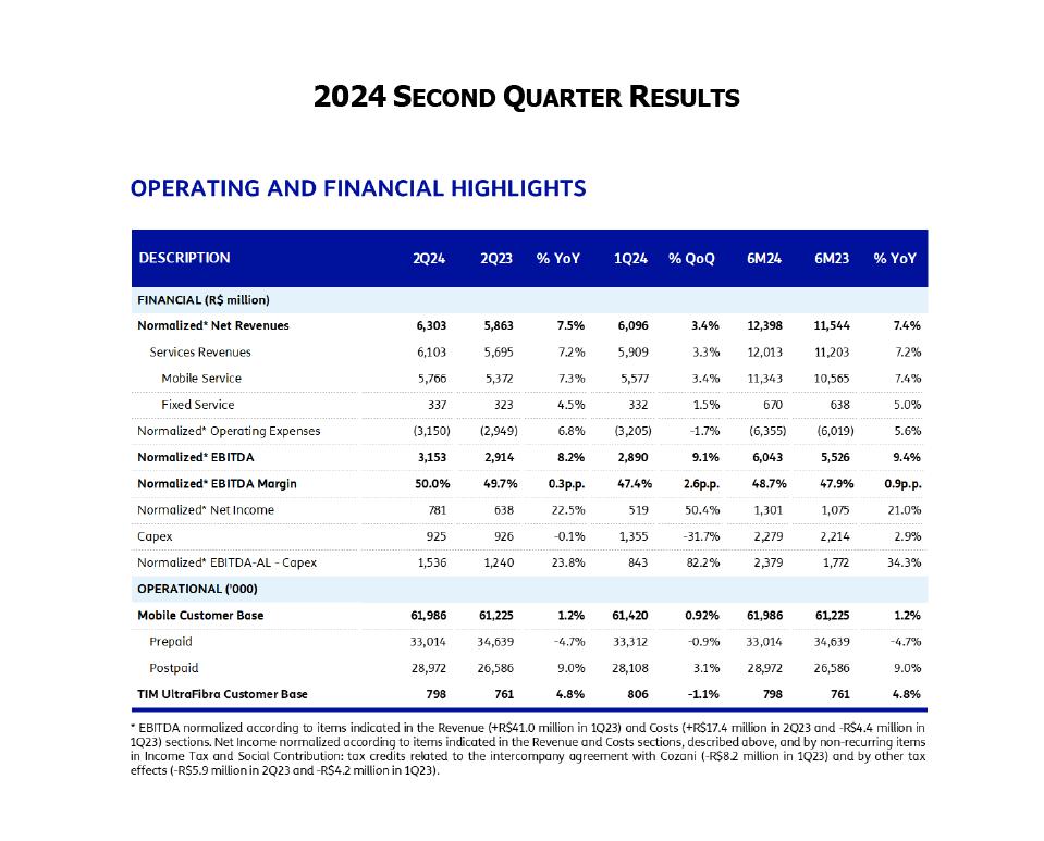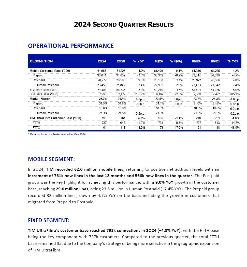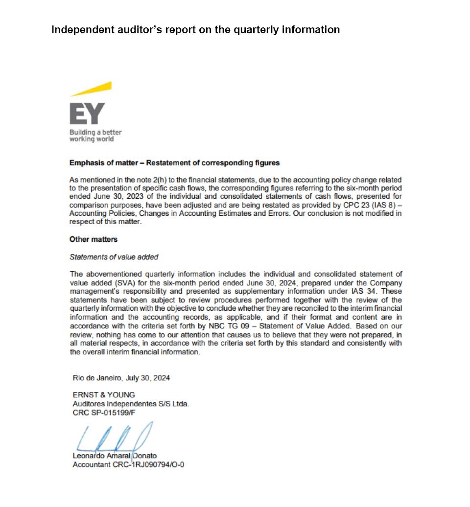 The Members of the Fiscal Council of TIM S.A. ("Company"), in the exercise of their attributions and legal duties, as provided in Article 163 of the Brazilian Corporate Law, conducted a review and analysis of the quarterly financial statements, along with the limited review report of Ernst & Young Auditores Independentes S/S (“EY”), for the period that ended on March 31st, 2024, and taking into account the information provided by the Company's management and the Independent Auditors, consider the information appropriate for presentation to the Board of Directors of the Company, in accordance to the Brazilian Corporate Law.