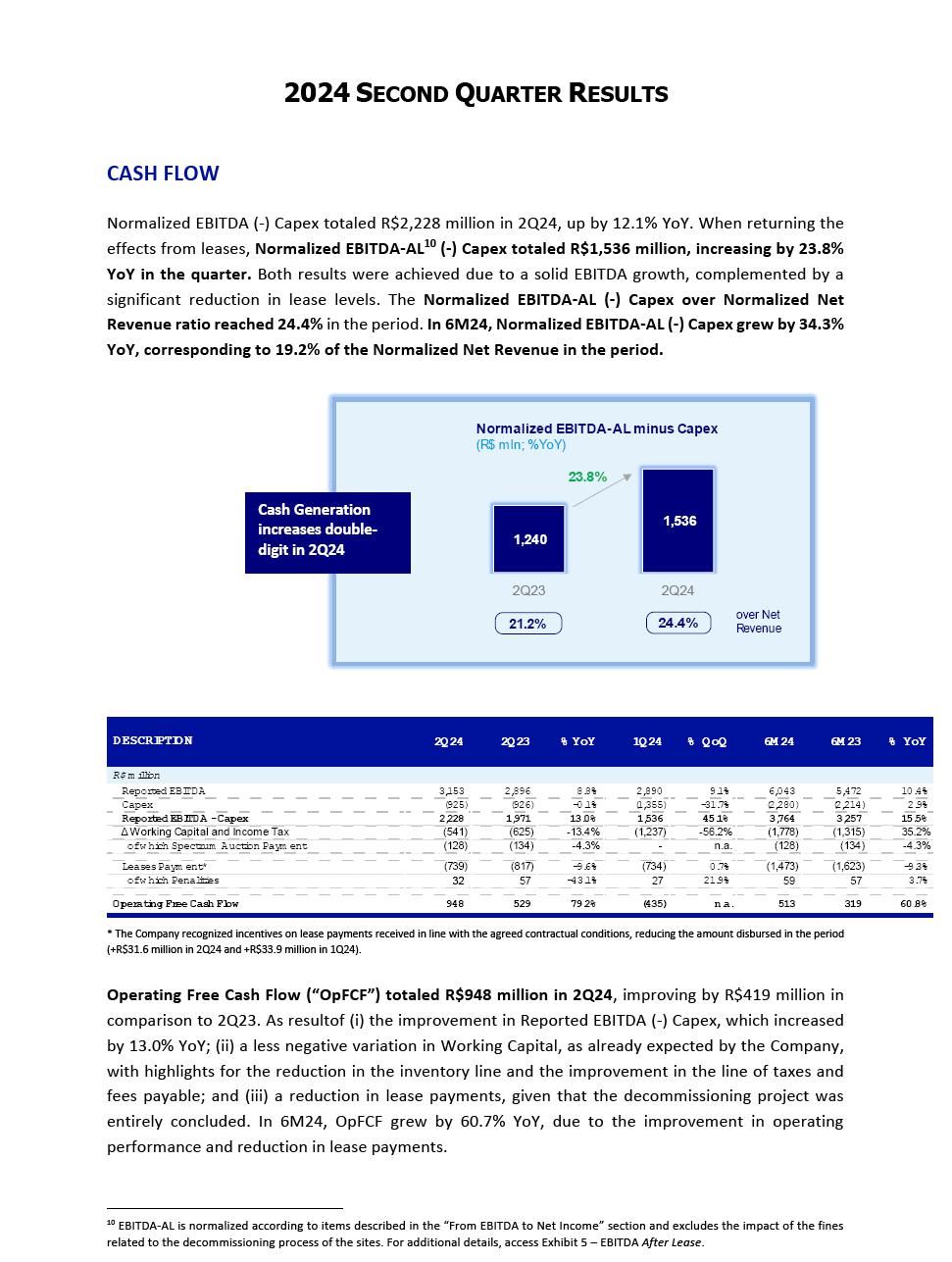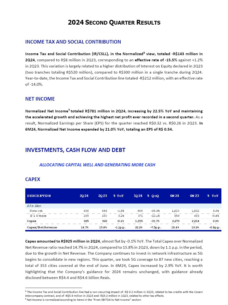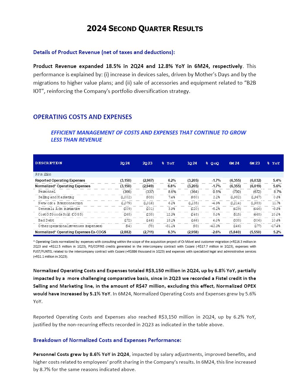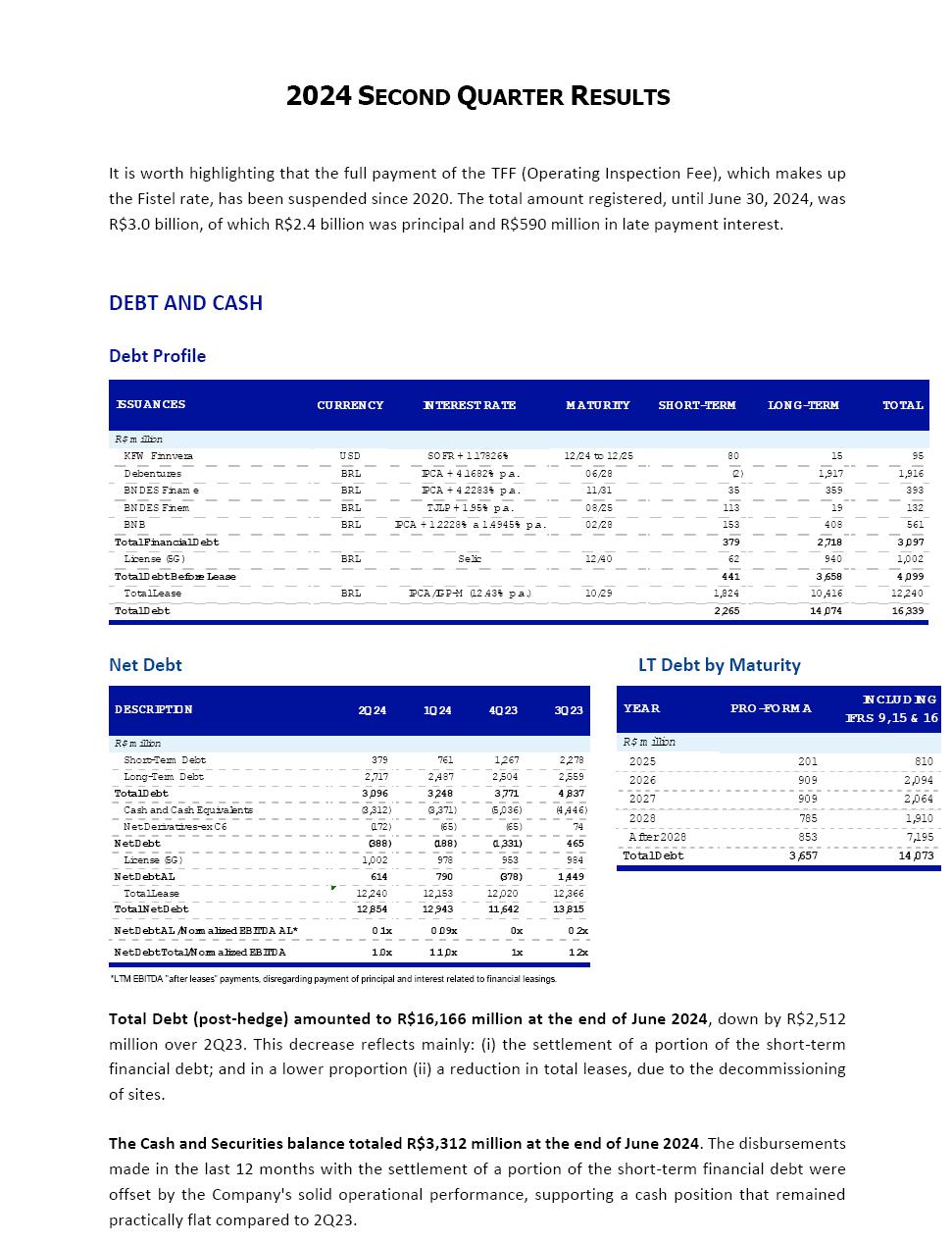 The Members of the Fiscal Council of TIM S.A. ("Company"), in the exercise of their attributions and legal duties, as provided in Article 163 of the Brazilian Corporate Law, conducted a review and analysis of the quarterly financial statements, along with the limited review report of Ernst & Young Auditores Independentes S/S (“EY”), for the period that ended on March 31st, 2024, and taking into account the information provided by the Company's management and the Independent Auditors, consider the information appropriate for presentation to the Board of Directors of the Company, in accordance to the Brazilian Corporate Law.