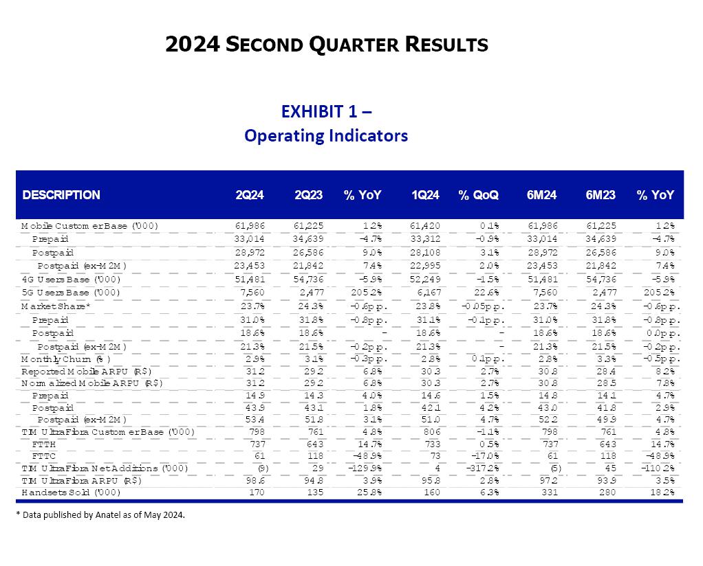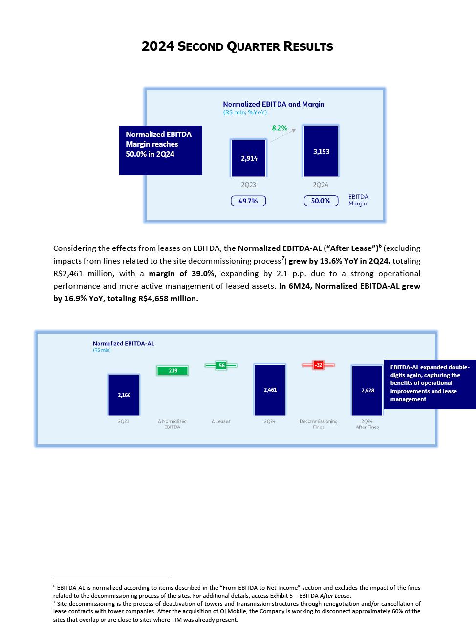 Alberto Mario Griselli (Chief Executive Officer and Investor Relations Officer), Andrea Palma Viegas Marques (Chief Financial Officer), Bruno Mutzenbecher Gentil (Business Support Officer), Maria Antonietta Russo (People, Culture & Organization Officer), Mario Girasole (Regulatory and Institutional Affairs Officer) and Fabiane Reschke (Legal Officer), as Statutory Officers of TIM S.A., declare, in accordance with Section 27, paragraph 1, item V of CVM Resolution Nr. 80 of March 29th, 2022, that they have reviewed, discussed and agreed with the opinion expressed on the Company’s Independent Auditors’ Report regarding the Company’s Financial Statements for the year ended March 31st, 2024.