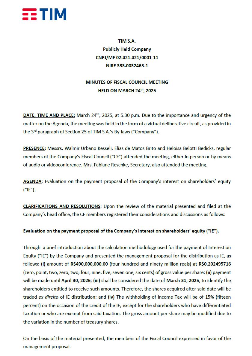 TIM S.A. Publicly Held Company CNPJ/MF 02.421.421/0001-11 NIRE 333.0032463-1 MINUTES OF FISCAL COUNCIL MEETING HELD ON MARCH 24th, 2025 DATE, TIME AND PLACE: March 24th, 2025, at 5.30 p.m. Due to the importance and urgency of the matter on the Agenda, the meeting was held in the form of a virtual deliberative circuit, as provided in the 3rd paragraph of Section 25 of TIM S.A.’s By-laws (“Company”). PRESENCE: Messrs. Walmir Urbano Kesseli, Elias de Matos Brito and Heloisa Belotti Bedicks, regular members of the Company’s Fiscal Council (“CF”) attended the meeting, either in person or by means of audio or videoconference. Mrs. Fabiane Reschke, Secretary, also attended the meeting. AGENDA: Evaluation on the payment proposal of the Company’s interest on shareholders’ equity (“IE”). CLARIFICATIONS AND RESOLUTIONS: Upon the review of the material presented and filed at the Company’s head office, the CF members registered their considerations and discussions as follows: Evaluation on the payment proposal of the Company’s interest on shareholders’ equity (“IE”). Through a brief introduction about the calculation methodology used for the payment of Interest on Equity ("IE") by the Company and presented the management proposal for the distribution as IE, as follows: (i) amount of R$490,000,000.00 (four hundred and ninety million reais) at R$0.202495716 (zero, point, two, zero, two, four, nine, five, seven one, six cents) of gross value per share; (ii) payment will be made until April 30, 2026; (iii) shall be considered the date of March 31, 2025, to identify the shareholders entitled to receive such amounts. Therefore, the shares acquired after said date will be traded ex direito of IE distribution; and (iv) The withholding of Income Tax will be of 15% (fifteen percent) on the occasion of the credit of the IE, except for the shareholders who have differentiated taxation or who are exempt from said taxation. The gross amount per share may be modified due to the variation in the number of treasury shares. On the basis of the material presented, the members of the Fiscal Council expressed in favor of the management proposal.
