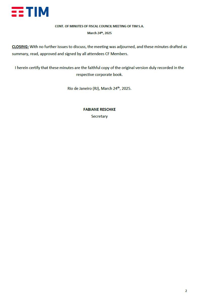 CONT. OF MINUTES OF FISCAL COUNCIL MEETING OF TIM S.A. March 24th, 2025 2 Classificado c omo Público CLOSING: With no further issues to discuss, the meeting was adjourned, and these minutes drafted as summary, read, approved and signed by all attendees CF Members. I herein certify that these minutes are the faithful copy of the original version duly recorded in the respective corporate book. Rio de Janeiro (RJ), March 24th, 2025. FABIANE RESCHKE Secretary