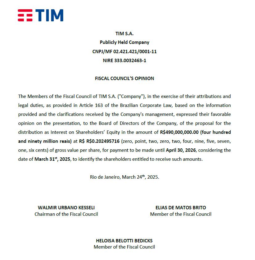 TIM S.A. Publicly Held Company CNPJ/MF 02.421.421/0001-11 NIRE 333.0032463-1 FISCAL COUNCIL’S OPINION The Members of the Fiscal Council of TIM S.A. ("Company"), in the exercise of their attributions and legal duties, as provided in Article 163 of the Brazilian Corporate Law, based on the information provided and the clarifications received by the Company's management, expressed their favorable opinion on the presentation, to the Board of Directors of the Company, of the proposal for the distribution as Interest on Shareholders’ Equity in the amount of R$490,000,000.00 (four hundred and ninety million reais) at R$ R$0.202495716 (zero, point, two, zero, two, four, nine, five, seven, one, six cents) of gross value per share, for payment to be made until April 30, 2026, considering the date of March 31st, 2025, to identify the shareholders entitled to receive such amounts. Rio de Janeiro, March 24th, 2025. WALMIR URBANO KESSELI Chairman of the Fiscal Council ELIAS DE MATOS BRITO Member of the Fiscal Council HELOISA BELOTTI BEDICKS Member of the Fiscal Council