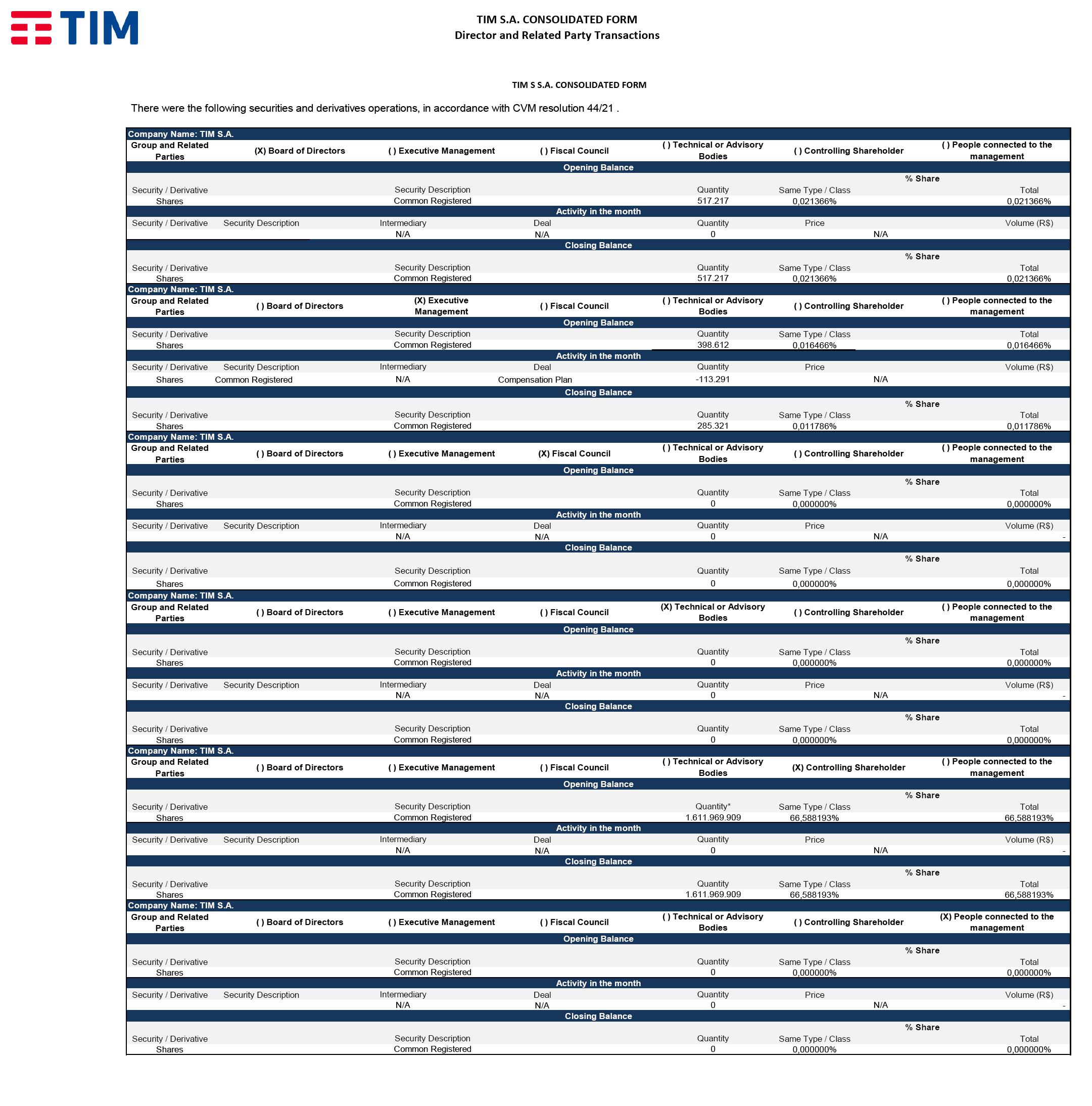 TIM S.A. CONSOLIDATED FORM Director and Related Party Transactions Group and Related Parties Security / Derivative Same Type / Class Total Shares 0,021366% 0,021366% Security / Derivative Security Description Deal Price Volume (R$) N/A Security / Derivative Same Type / Class Total Shares 0,021366% 0,021366% Group and Related Parties Security / Derivative Same Type / Class Total Shares 0,016466% 0,016466% Security / Derivative Security Description Deal Price Volume (R$) Shares Common Registered Compensation Plan Security / Derivative Same Type / Class Total Shares 0,011786% 0,011786% Group and Related Parties Security / Derivative Same Type / Class Total Shares 0,000000% 0,000000% Security / Derivative Security Description Deal Price Volume (R$) N/A - Security / Derivative Same Type / Class Total Shares 0,000000% 0,000000% Group and Related Parties Security / Derivative Same Type / Class Total Shares 0,000000% 0,000000% Security / Derivative Security Description Deal Price Volume (R$) N/A - Security / Derivative Same Type / Class Total Shares 0,000000% 0,000000% Group and Related Parties Security / Derivative Same Type / Class Total Shares 66,588193% 66,588193% Security / Derivative Security Description Deal Price Volume (R$) N/A - Security / Derivative Same Type / Class Total Shares 66,588193% 66,588193% Group and Related Parties Security / Derivative Same Type / Class Total Shares 0,000000% 0,000000% Security / Derivative Security Description Deal Price Volume (R$) N/A - Security / Derivative Same Type / Class Total Shares 0,000000% 0,000000% Intermediary Quantity N/A 0 N/A Intermediary Quantity N/A -113.291 Company Name: TIM S.A. ( ) Board of Directors (X) Executive Management ( ) Fiscal Council ( ) Technical or Advisory Bodies ( ) Controlling Shareholder ( ) People connected to the management Closing Balance % Share Security Description Quantity Common Registered 517.217 There were the following securities and derivatives operations, in accordance with CVM resolution 44/21 . Company Name: TIM S.A. (X) Board of Directors ( ) Executive Management ( ) Fiscal Council ( ) Technical or Advisory Bodies ( ) Controlling Shareholder ( ) People connected to the management Activity in the month Opening Balance % Share Security Description Quantity Common Registered 517.217 Closing Balance % Share Opening Balance Security Description Quantity Common Registered 398.612 Activity in the month N/A Security Description Quantity Common Registered 285.321 Company Name: TIM S.A. ( ) Board of Directors ( ) Executive Management (X) Fiscal Council ( ) Technical or Advisory Bodies ( ) Controlling Shareholder 0 N/A ( ) People connected to the management Opening Balance % Share Security Description Quantity Common Registered 0 Activity in the month Intermediary Quantity N/A Company Name: TIM S.A. ( ) Board of Directors ( ) Executive Management ( ) Fiscal Council (X) Technical or Advisory Bodies ( ) Controlling Shareholder ( ) People connected to the management Closing Balance % Share Security Description Quantity Common Registered 0 Closing Balance % Share Security Description Quantity Common Registered 0 Opening Balance % Share Security Description Quantity Common Registered 0 Activity in the month Intermediary Quantity N/A 0 N/A % Share Security Description Quantity* Common Registered 1.611.969.909 Closing Balance Company Name: TIM S.A. ( ) Board of Directors ( ) Executive Management ( ) Fiscal Council ( ) Technical or Advisory Bodies (X) Controlling Shareholder ( ) People connected to the management ( ) Technical or Advisory Bodies ( ) Controlling Shareholder (X) People connected to the management Security Description Quantity Common Registered 1.611.969.909 Company Name: TIM S.A. Activity in the month Intermediary Quantity N/A 0 N/A TIM S S.A. CONSOLIDATED FORM Common Registered 0 Activity in the month Intermediary Quantity N/A N/A Closing Balance % Share Security Description Quantity 0 Opening Balance % Share Security Description Quantity Common Registered 0 % Share Opening Balance ( ) Board of Directors ( ) Executive Management ( ) Fiscal Council