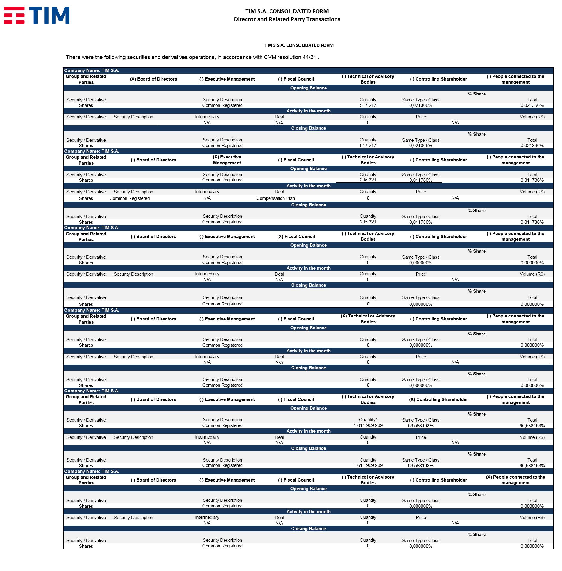 TIM S.A. CONSOLIDATED FORM Director and Related Party Transactions Group and Related Parties Security / Derivative Same Type / Class Total Shares 0,021366% 0,021366% Security / Derivative Security Description Deal Price Volume (R$) N/A Security / Derivative Same Type / Class Total Shares 0,021366% 0,021366% Group and Related Parties Security / Derivative Same Type / Class Total Shares 0,011786% 0,011786% Security / Derivative Security Description Deal Price Volume (R$) Shares Common Registered Compensation Plan Security / Derivative Same Type / Class Total Shares 0,011786% 0,011786% Group and Related Parties Security / Derivative Same Type / Class Total Shares 0,000000% 0,000000% Security / Derivative Security Description Deal Price Volume (R$) N/A - Security / Derivative Same Type / Class Total Shares 0,000000% 0,000000% Group and Related Parties Security / Derivative Same Type / Class Total Shares 0,000000% 0,000000% Security / Derivative Security Description Deal Price Volume (R$) N/A - Security / Derivative Same Type / Class Total Shares 0,000000% 0,000000% Group and Related Parties Security / Derivative Same Type / Class Total Shares 66,588193% 66,588193% Security / Derivative Security Description Deal Price Volume (R$) N/A - Security / Derivative Same Type / Class Total Shares 66,588193% 66,588193% Group and Related Parties Security / Derivative Same Type / Class Total Shares 0,000000% 0,000000% Security / Derivative Security Description Deal Price Volume (R$) N/A - Security / Derivative Same Type / Class Total Shares 0,000000% 0,000000% TIM S S.A. CONSOLIDATED FORM Common Registered 0 Activity in the month Intermediary Quantity N/A N/A Closing Balance % Share Security Description Quantity 0 Opening Balance % Share Security Description Quantity Common Registered 0 % Share Opening Balance ( ) Board of Directors ( ) Executive Management ( ) Fiscal Council ( ) Technical or Advisory Bodies ( ) Controlling Shareholder (X) People connected to the management Security Description Quantity Common Registered 1.611.969.909 Company Name: TIM S.A. Activity in the month Intermediary Quantity N/A 0 N/A % Share Security Description Quantity* Common Registered 1.611.969.909 Closing Balance Company Name: TIM S.A. ( ) Board of Directors ( ) Executive Management ( ) Fiscal Council ( ) Technical or Advisory Bodies (X) Controlling Shareholder ( ) People connected to the management Closing Balance % Share Security Description Quantity Common Registered 0 Opening Balance % Share Security Description Quantity Common Registered 0 Activity in the month Intermediary Quantity N/A 0 N/A Company Name: TIM S.A. ( ) Board of Directors ( ) Executive Management ( ) Fiscal Council (X) Technical or Advisory Bodies ( ) Controlling Shareholder ( ) People connected to the management Closing Balance % Share Security Description Quantity Common Registered 0 0 N/A ( ) People connected to the management Opening Balance % Share Security Description Quantity Common Registered 0 Activity in the month Intermediary Quantity N/A Security Description Quantity Common Registered 285.321 Company Name: TIM S.A. ( ) Board of Directors ( ) Executive Management (X) Fiscal Council ( ) Technical or Advisory Bodies ( ) Controlling Shareholder Closing Balance % Share Opening Balance Security Description Quantity Common Registered 285.321 Activity in the month N/A There were the following securities and derivatives operations, in accordance with CVM resolution 44/21 . Company Name: TIM S.A. (X) Board of Directors ( ) Executive Management ( ) Fiscal Council ( ) Technical or Advisory Bodies ( ) Controlling Shareholder ( ) People connected to the management Activity in the month Opening Balance % Share Security Description Quantity Common Registered 517.217 Intermediary Quantity N/A 0 N/A Intermediary Quantity N/A 0 Company Name: TIM S.A. ( ) Board of Directors (X) Executive Management ( ) Fiscal Council ( ) Technical or Advisory Bodies ( ) Controlling Shareholder ( ) People connected to the management Closing Balance % Share Security Description Quantity Common Registered 517.217 #Classificado como Uso Interno