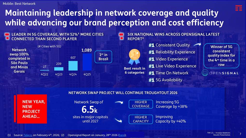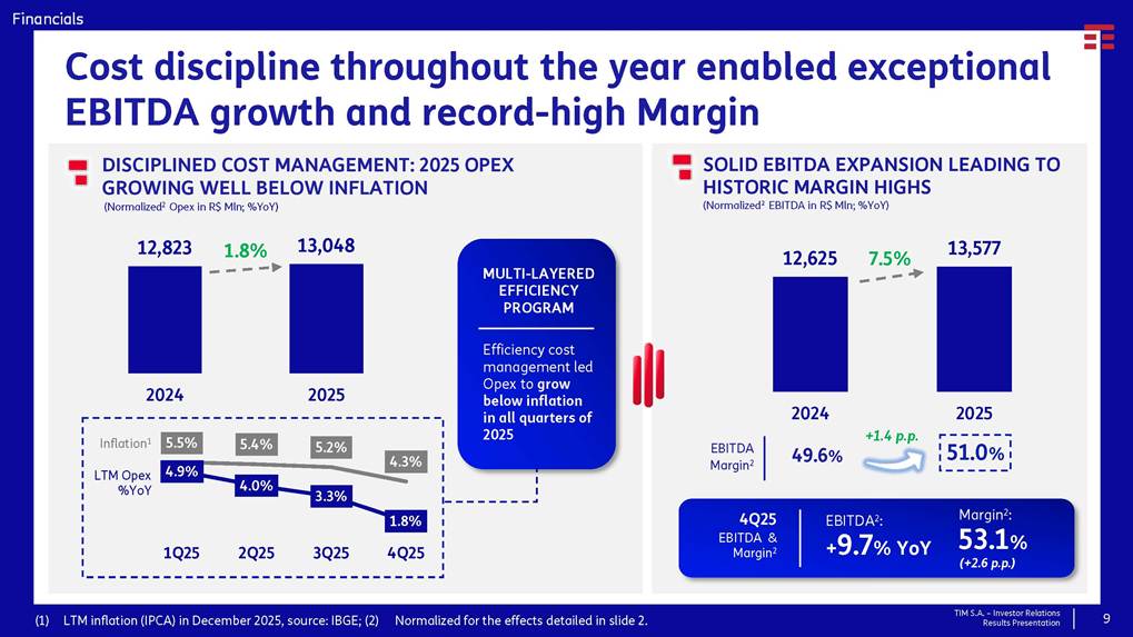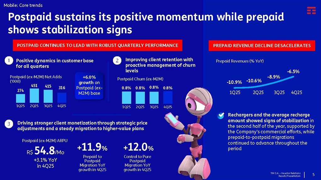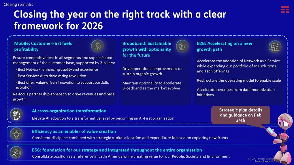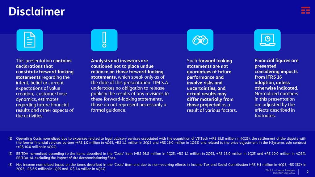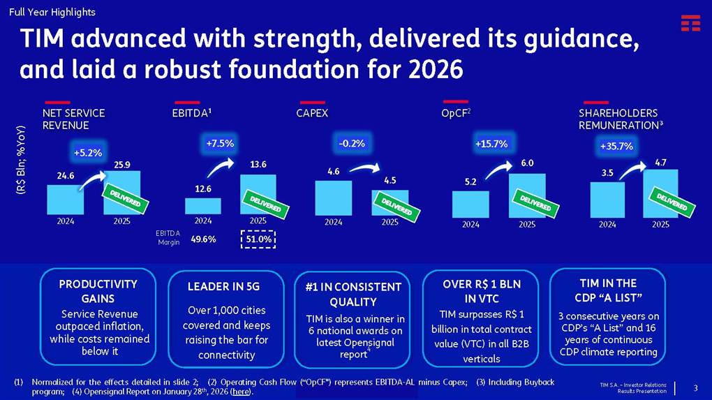 Classificado como Uso Interno Classificado como Uso Interno TIM S.A. – Investor Relations 2 Results Presentation Disclaimer This presentation contains declarations that constitute forward-looking statementsregarding the intent, belief or current expectations of value creation, customer base dynamics, estimates regarding future financial results and other aspects of the activities. Such forward looking statements are not guarantees of future performanceand involve risks and uncertainties, and actualresults may differ materially from those projected asa result of various factors. Analysts and investors are cautioned not to place undue reliance on those forward-looking statements, which speak only as of the date of this presentation. TIM S.A. undertakes no obligation to release publicly the results of any revisions to these forward-looking statements, those do not represent necessarily a formal guidance. Financial figures are presented considering impacts from IFRS 16 adoption, unless otherwise indicated. Normalized numbers in this presentation are adjusted by the effects described in footnotes. (1) OperatingCostsnormalizedduetoexpensesrelatedtolegaladvisoryservicesassociatedwiththeacquisitionofV8.Tech(+R$25.8millionin4Q25),thesettlementofthedisputewiththeformerfinancialservicespartner(+R$1.0millionin4Q25,+R$1.1millionin2Q25and+R$19.0millionin1Q25)andrelatedtothepriceadjustmentintheI-Systemssalecontract(+R$10.0millionin4Q24). (2) EBITDAnormalizedaccordingtotheitemsdescribedinthe'Costs’item(+R$26.8millionin4Q25,+R$1.1millionin2Q25,+R$19.0millionin1Q25and+R$10.0millionin4Q24).EBITDA-ALexcludingtheimpactofsitedecommissioningfines. (3) NetIncomenormalizedbasedontheitemsdescribedinthe'Costs’itemandduetonon-recurringeffectsinIncomeTaxandSocialContribution(-R$9,1millionin4Q25,-R$387kin2Q25,-R$6.5millionin1Q25and-R$3.4millionin4Q24). Classificado como Uso Interno TIM S.A. – Investor Relations 3 Results Presentation Full Year Highlights TIM advanced with strength, delivered its guidance, and laid a robust foundation for 2026 (1) Normalizedfortheeffectsdetailedinslide2;(2)OperatingCashFlow(“OpCF")representsEBITDA-ALminusCapex;(3)IncludingBuybackprogram;(4)OpensignalReportonJanuary28th,2026(here). NET SERVICE REVENUE +5.2% EBITDA¹ OpCF2 24.6 25.9 2024 2025 +7.5% 12.6 13.6 2024 2025 CAPEX SHAREHOLDERS REMUNERATION³ 4.6 4.5 2024 2025 -0.2% 3.5 4.7 2024 2025 49.6% EBITDA Margin 51.0% (R$ Bln; %YoY) 5.2 6.0 2024 2025 +15.7% +35.7% LEADER IN 5G TIM surpasses R$ 1 billion in total contract value (VTC) in all B2B verticals TIM is also a winner in 6 national awards on latest Opensignalreport4 Over 1,000 cities covered and keeps raising the bar for connectivity OVER R$ 1 BLN IN VTC #1 IN CONSISTENT QUALITY 3 consecutive years on CDP’s “A List” and 16 years of continuous CDP climate reporting TIM IN THE CDP “A LIST” Service Revenue outpaced inflation, while costs remained below it PRODUCTIVITY GAINS Classificado como Uso Interno TIM S.A. – Investor Relations 4 R esInuvltess Ptorer sReenlatatitoionns Results Presentation (Total Net Revenue in R$ Mln; %YoY) TOTAL NET REVENUE AT A SOLID PACE Mobile and fixed fueled consistent Net Service Revenue growth Revenues POSTPAID FTTH ARPU R$95.2/Moin 4Q25 ARPU growth driving revenue dynamics CLIENT BASE +7.6% in 4Q25 YoY 11 months of positive net adds in client base Postpaid is in a cycle of strong expansion, reflected in both ARPU and customer base performance 6,015 6,305 328 359 288 255 6,631 6,920 4Q24 4Q25 Mobile Fixed Handsets 4,4% 4.8% 9.4% PREPAID Prepaid revenue decline decelerated, 3rdconsecutive quarter Postpaid Revenues Prepaid Revenues +9.5% YoY in 4Q25 -6.5% YoY in 4Q25 FTTH revenue is back on a positive trend POSTPAID FUELS MOBILE SERVICE EXPANSION AS PREPAID DECLINE NARROWS FTTH DRIVING FIXED-LINE RECOVERY MOBILE FIXED +5.2% YoY Net Service Revenue 2025 Revenue +5.4% YoY Mobile Service Revenue TIM S.A. – Investor Relations 5 Results Presentation -10.9% -10.6% -8.9% -6.5% POSTPAID CONTINUES TO LEAD WITH ROBUST QUARTERLY PERFORMANCE Mobile: Core trends Postpaid(ex-M2M) Net Adds (‘000) Prepaidto Postpaid MigrationYoYgrowth in 4Q25 +11.9% Control to Pure Postpaid MigrationYoYgrowth in 4Q25 +12.0% Postpaid Churn (ex-M2M) PREPAID REVENUE DECLINE DESACELERATES Rechargers and the average recharge amount showed signs of stabilization in the second half of the year, supported by the Company’s commercial efforts, while prepaid-to-postpaid migrations continued to advance throughout the period Postpaid sustains its positive momentum while prepaid shows stabilization signs 1Q25 2Q25 3Q25 4Q25 Prepaid Revenues (% YoY) Positive dynamics in customer base for all quarters Improving client retention with proactive management of churn levels R$ 54.8/Mo +3.1% YoY in 4Q25 0.8% 0.8% 0.8% 0.8% 1Q25 2Q25 3Q25 4Q25 274 451 415 316 1Q25 2Q25 3Q25 4Q25 Driving stronger client monetization through strategic price adjustments and a steady migration to higher-value plans Postpaid (ex-M2M) ARPU +6.0% growthon Postpaid (ex-M2M) base Classificado como Uso Interno TIM S.A. – Investor Relations 6 Results Presentation Fixed: Broadband Broadband operational improvements are beginning to bear results 478 9,203 23,294 27,399 1Q25 2Q25 3Q25 4Q25 NET ADDS GROWTH BACK ON TRACK WHILE FTTH MIGRATION ACCELERATES 850kUltrafibra Customers in 4Q25 98.9%Running on FTTHNetwork (Broadband Total Net Adds) BROADBAND REVENUES GROWING AT SOLID PACE WHILE FTTH ARPU REMAINS STABLE (TIM Ultrafibra Revenue Growth;%YoY) R$ 95.2/MoFTTH ARPU in 4Q25 3.6%growth YoY in 4Q25 Broadband revenue has resumed growth, supported by rising net additions 1Q25 2Q25 3Q25 4Q25 -4.5% -3.6% -2.4% 6.2% TIM S.A. – Investor Relations 7 Results Presentation 27 209 607 1,089 4Q22 4Q23 4Q24 4Q25 (# Cities with 5G) Mobile: Best Network LEADER IN 5G COVERAGE, WITH 52%¹ MORE CITIES CONNECTED THAN SECOND PLAYER Maintaining leadership in network coverage and quality while advancing our brand perception and cost e