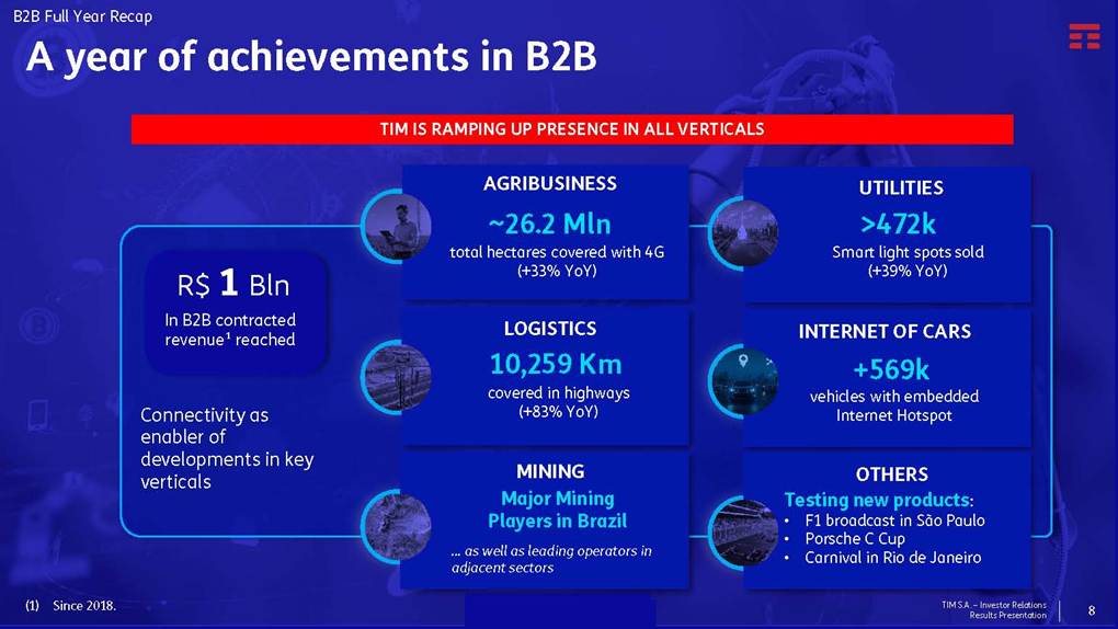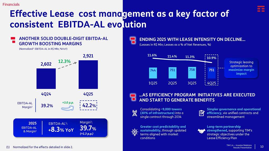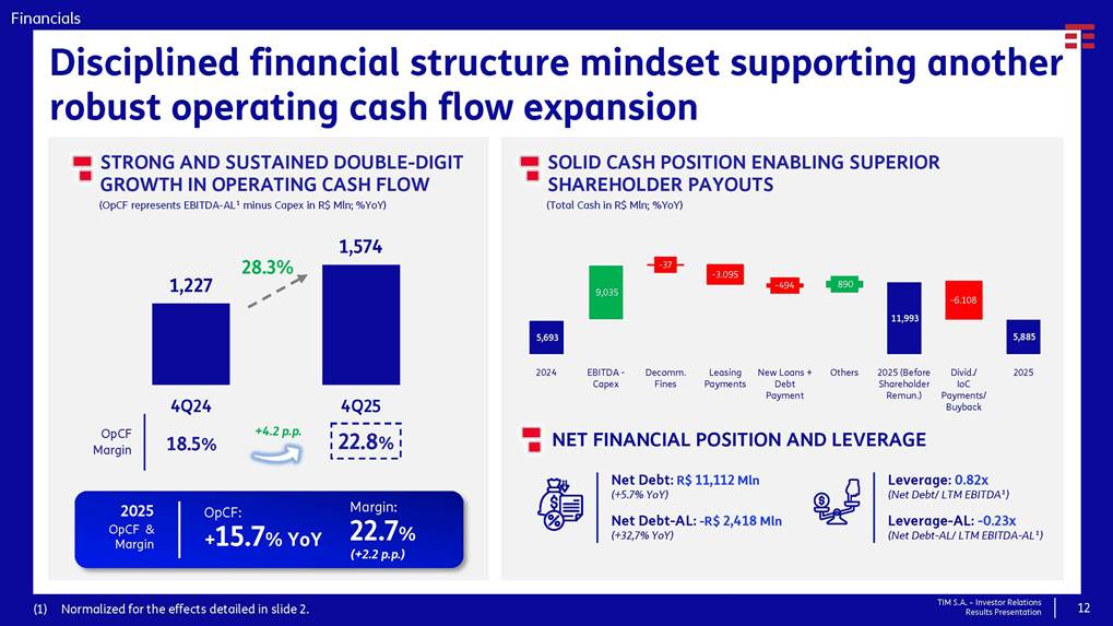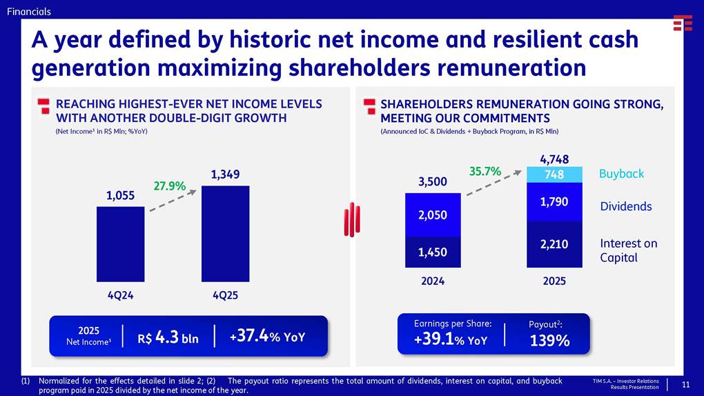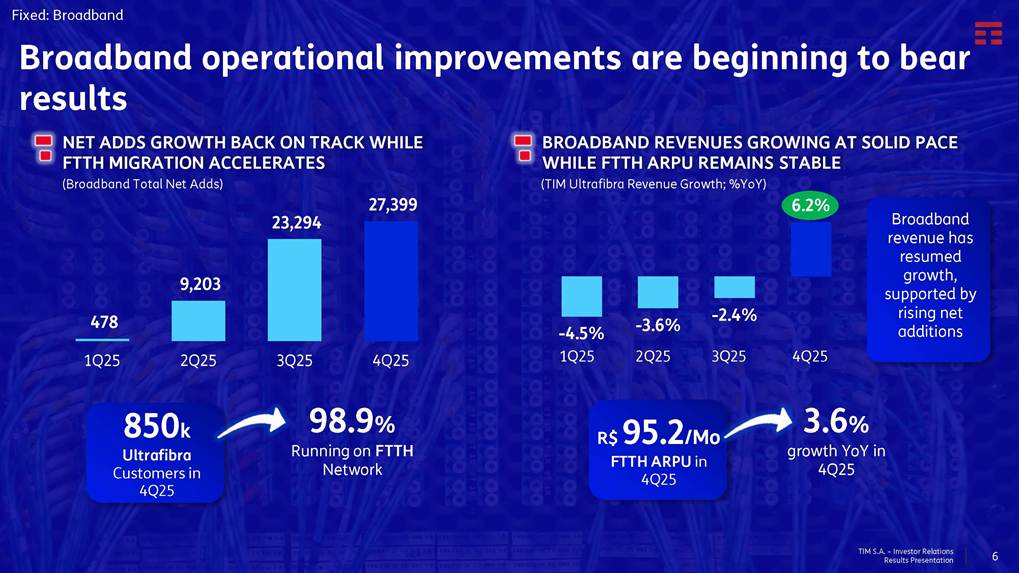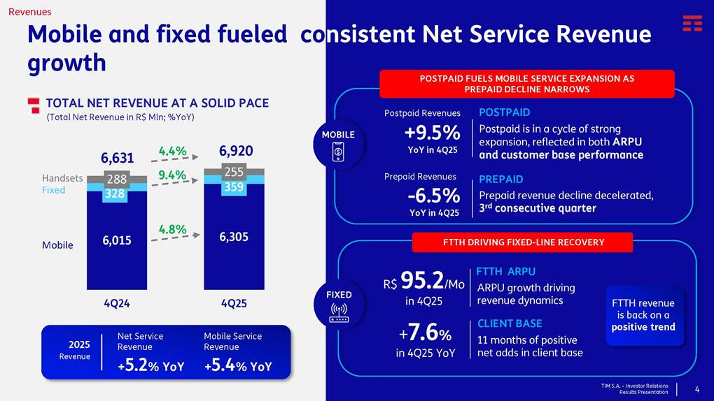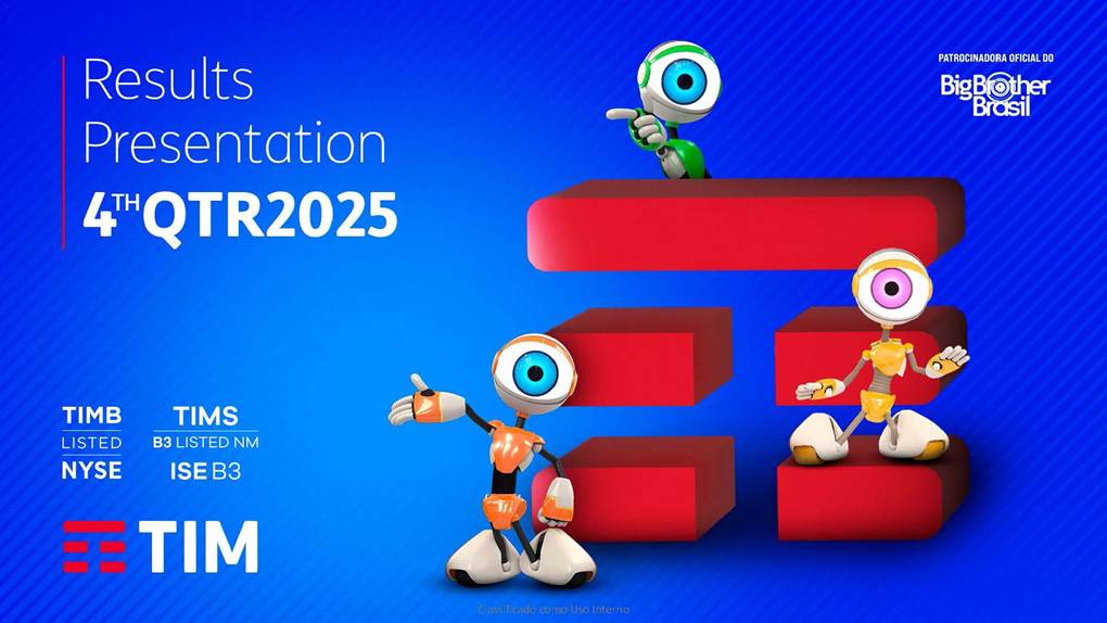 Classificado como Uso Interno Classificado como Uso Interno TIM S.A. – Investor Relations 2 Results Presentation Disclaimer This presentation contains declarations that constitute forward-looking statementsregarding the intent, belief or current expectations of value creation, customer base dynamics, estimates regarding future financial results and other aspects of the activities. Such forward looking statements are not guarantees of future performanceand involve risks and uncertainties, and actualresults may differ materially from those projected asa result of various factors. Analysts and investors are cautioned not to place undue reliance on those forward-looking statements, which speak only as of the date of this presentation. TIM S.A. undertakes no obligation to release publicly the results of any revisions to these forward-looking statements, those do not represent necessarily a formal guidance. Financial figures are presented considering impacts from IFRS 16 adoption, unless otherwise indicated. Normalized numbers in this presentation are adjusted by the effects described in footnotes. (1) OperatingCostsnormalizedduetoexpensesrelatedtolegaladvisoryservicesassociatedwiththeacquisitionofV8.Tech(+R$25.8millionin4Q25),thesettlementofthedisputewiththeformerfinancialservicespartner(+R$1.0millionin4Q25,+R$1.1millionin2Q25and+R$19.0millionin1Q25)andrelatedtothepriceadjustmentintheI-Systemssalecontract(+R$10.0millionin4Q24). (2) EBITDAnormalizedaccordingtotheitemsdescribedinthe'Costs’item(+R$26.8millionin4Q25,+R$1.1millionin2Q25,+R$19.0millionin1Q25and+R$10.0millionin4Q24).EBITDA-ALexcludingtheimpactofsitedecommissioningfines. (3) NetIncomenormalizedbasedontheitemsdescribedinthe'Costs’itemandduetonon-recurringeffectsinIncomeTaxandSocialContribution(-R$9,1millionin4Q25,-R$387kin2Q25,-R$6.5millionin1Q25and-R$3.4millionin4Q24). Classificado como Uso Interno TIM S.A. – Investor Relations 3 Results Presentation Full Year Highlights TIM advanced with strength, delivered its guidance, and laid a robust foundation for 2026 (1) Normalizedfortheeffectsdetailedinslide2;(2)OperatingCashFlow(“OpCF")representsEBITDA-ALminusCapex;(3)IncludingBuybackprogram;(4)OpensignalReportonJanuary28th,2026(here). NET SERVICE REVENUE +5.2% EBITDA¹ OpCF2 24.6 25.9 2024 2025 +7.5% 12.6 13.6 2024 2025 CAPEX SHAREHOLDERS REMUNERATION³ 4.6 4.5 2024 2025 -0.2% 3.5 4.7 2024 2025 49.6% EBITDA Margin 51.0% (R$ Bln; %YoY) 5.2 6.0 2024 2025 +15.7% +35.7% LEADER IN 5G TIM surpasses R$ 1 billion in total contract value (VTC) in all B2B verticals TIM is also a winner in 6 national awards on latest Opensignalreport4 Over 1,000 cities covered and keeps raising the bar for connectivity OVER R$ 1 BLN IN VTC #1 IN CONSISTENT QUALITY 3 consecutive years on CDP’s “A List” and 16 years of continuous CDP climate reporting TIM IN THE CDP “A LIST” Service Revenue outpaced inflation, while costs remained below it PRODUCTIVITY GAINS Classificado como Uso Interno TIM S.A. – Investor Relations 4 R esInuvltess Ptorer sReenlatatitoionns Results Presentation (Total Net Revenue in R$ Mln; %YoY) TOTAL NET REVENUE AT A SOLID PACE Mobile and fixed fueled consistent Net Service Revenue growth Revenues POSTPAID FTTH ARPU R$95.2/Moin 4Q25 ARPU growth driving revenue dynamics CLIENT BASE +7.6% in 4Q25 YoY 11 months of positive net adds in client base Postpaid is in a cycle of strong expansion, reflected in both ARPU and customer base performance 6,015 6,305 328 359 288 255 6,631 6,920 4Q24 4Q25 Mobile Fixed Handsets 4,4% 4.8% 9.4% PREPAID Prepaid revenue decline decelerated, 3rdconsecutive quarter Postpaid Revenues Prepaid Revenues +9.5% YoY in 4Q25 -6.5% YoY in 4Q25 FTTH revenue is back on a positive trend POSTPAID FUELS MOBILE SERVICE EXPANSION AS PREPAID DECLINE NARROWS FTTH DRIVING FIXED-LINE RECOVERY MOBILE FIXED +5.2% YoY Net Service Revenue 2025 Revenue +5.4% YoY Mobile Service Revenue TIM S.A. – Investor Relations 5 Results Presentation -10.9% -10.6% -8.9% -6.5% POSTPAID CONTINUES TO LEAD WITH ROBUST QUARTERLY PERFORMANCE Mobile: Core trends Postpaid(ex-M2M) Net Adds (‘000) Prepaidto Postpaid MigrationYoYgrowth in 4Q25 +11.9% Control to Pure Postpaid MigrationYoYgrowth in 4Q25 +12.0% Postpaid Churn (ex-M2M) PREPAID REVENUE DECLINE DESACELERATES Rechargers and the average recharge amount showed signs of stabilization in the second half of the year, supported by the Company’s commercial efforts, while prepaid-to-postpaid migrations continued to advance throughout the period Postpaid sustains its positive momentum while prepaid shows stabilization signs 1Q25 2Q25 3Q25 4Q25 Prepaid Revenues (% YoY) Positive dynamics in customer base for all quarters Improving client retention with proactive management of churn levels R$ 54.8/Mo +3.1% YoY in 4Q25 0.8% 0.8% 0.8% 0.8% 1Q25 2Q25 3Q25 4Q25 274 451 415 316 1Q25 2Q25 3Q25 4Q25 Driving stronger client monetization through strategic price adjustments and a steady migration to higher-value plans Postpaid (ex-M2M) ARPU +6.0% growthon Postpaid (ex-M2M) base Classificado como Uso Interno TIM S.A. – Investor Relations 6 Results Presentation Fixed: Broadband Broadband operational improvements are beginning to bear results 478 9,203 23,294 27,399 1Q25 2Q25 3Q25 4Q25 NET ADDS GROWTH BACK ON TRACK WHILE FTTH MIGRATION ACCELERATES 850kUltrafibra Customers in 4Q25 98.9%Running on FTTHNetwork (Broadband Total Net Adds) BROADBAND REVENUES GROWING AT SOLID PACE WHILE FTTH ARPU REMAINS STABLE (TIM Ultrafibra Revenue Growth;%YoY) R$ 95.2/MoFTTH ARPU in 4Q25 3.6%growth YoY in 4Q25 Broadband revenue has resumed growth, supported by rising net additions 1Q25 2Q25 3Q25 4Q25 -4.5% -3.6% -2.4% 6.2% TIM S.A. – Investor Relations 7 Results Presentation 27 209 607 1,089 4Q22 4Q23 4Q24 4Q25 (# Cities with 5G) Mobile: Best Network LEADER IN 5G COVERAGE, WITH 52%¹ MORE CITIES CONNECTED THAN SECOND PLAYER Maintaining leadership in network coverage and quality while advancing our brand perception and cost e