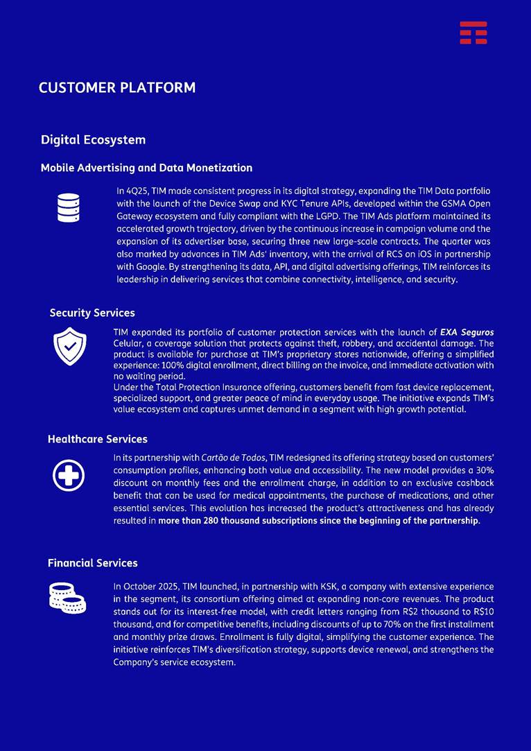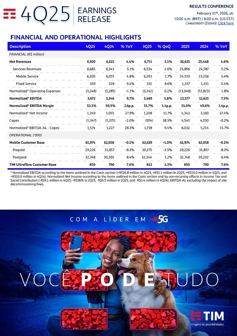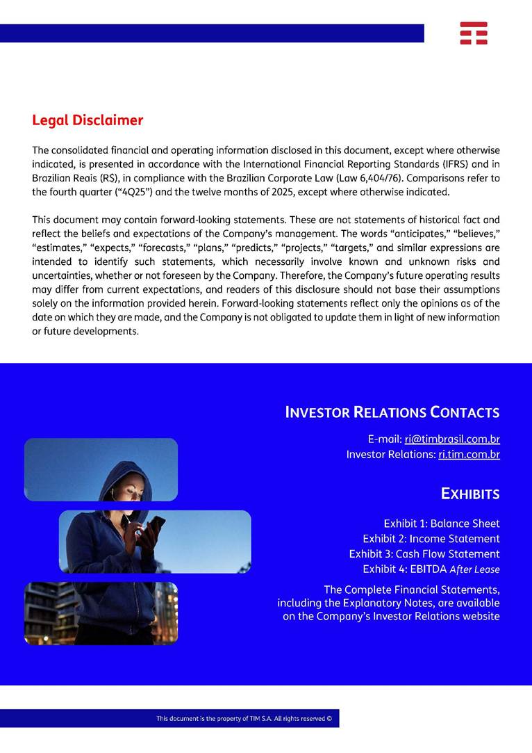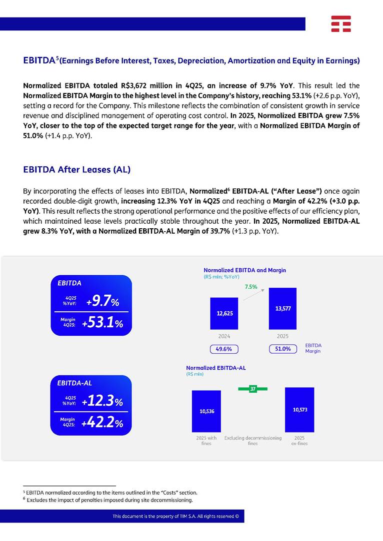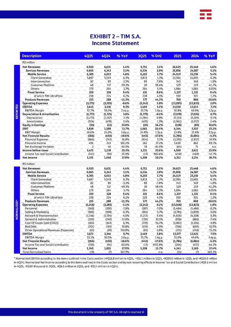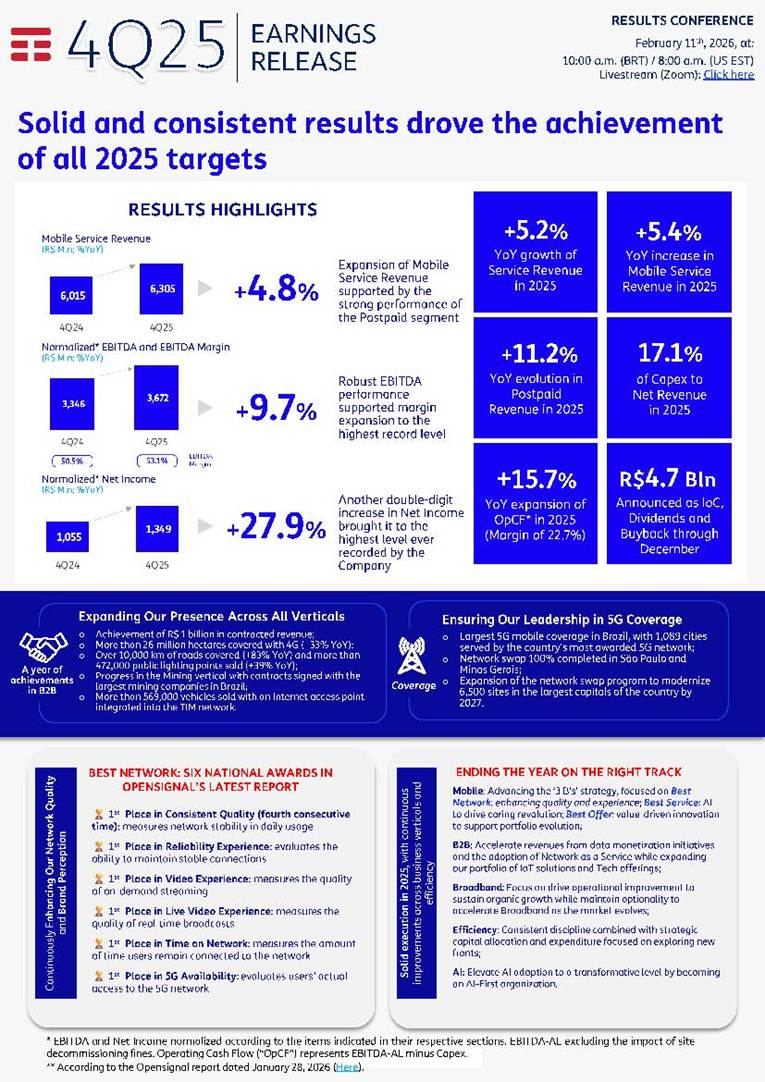 Classificado como Uso Interno Classificado como Uso Interno * EBITDA and Net Income normalized according to the items indicated in their respective sections . EBITDA -AL excluding the impact of site decommissioning fines . Operating Cash Flow (“OpCF ”) represents EBITDA -AL minus Capex . **According to the Opensignal report dated January 28, 2026 (Here ). RESULTS HIGHLIGHTS +27.9% Solid and consistent results drove the achievement of all 2025 targets +9.7% ENDING THE YEAR ON THE RIGHT TRACK Robust EBITDA performance supported margin expansion to the highest record level Another double -digit increase in Net Income brought it to the highest level ever recorded by the Company Normalized * EBITDA and EBITDA Margin (R$ Mln; % YoY ) Normalized * Net Income (R$ Mln; % YoY ) Mobile : Advancing the ‘3 B’s’ strategy, focused on Best Network : enhancing quality and experience ; Best Service: AI to drive caring revolution ; Best Offer : value -driven innovation to support portfolio evolution ; B2B : Accelerate revenues from data monetization initiatives and the adoption of Network as a Service while expanding our portfolio of IoT solutions and Tech offerings ; Broadband : Focus on drive operational improvement to sustain organic growth while maintain optionality to accelerate Broadband as the market evolves ; Efficiency : Consistent discipline combined with strategic capital allocation and expenditure focused on exploring new fronts ; AI: Elevate AI adoption to a transformative level by becoming an AI -First organization . BEST NETWORK: SIX NATIONAL AWARDS IN OPENSIGNAL’S LATEST REPORT 1st Place in Consistent Quality (fourth consecutive time): measures network stability in daily usage 1st Place in Reliability Experience: evaluates the ability to maintain stable connections 1st Place in Video Experience: measures the quality of on -demand streaming 1st Place in Live Video Experience: measures the quality of real -time broadcasts 1st Place in Time on Network: measures the amount of time users remain connected to the network 1st Place in 5G Availability: evaluates users’ actual access to the 5G network +5.2% +11.2% Announced as IoC, Dividends and Buyback through December R$ 4.7 Bln of Capex to Net Revenue in 2025 YoY evolution in Postpaid Revenue in 2025 YoY increase in Mobile Service Revenue in 2025 +5.4% 17.1% YoY growth of Service Revenue in 2025 YoY expansion of OpCF * in 2025 (Margin of 22.7%) +15.7% Expansion of Mobile Service Revenue supported by the strong performance of the Postpaid segment Continuously E nhancing Our Network Quality and Brand Perception Mobile Service Revenue (R$ Mln; % YoY ) +4.8% Solid execution in 2025, with continuous improvements across business verticals and efficiency Ensuring Our Leadership in 5G Coverage o Largest 5G mobile coverage in Brazil, with 1,089 cities served by the country's most awarded 5G network; o Network swap 100% completed in São Paulo and Minas Gerais; o Expansion of the network swap program to modernize 6,500 sites in the largest capitals of the country by 2027. A year of achievements in B2B Coverage Expanding Our Presence Across All Verticals o Achievement of R$ 1 billion in contracted revenue; o More than 26 million hectares covered with 4G (+33% YoY); o Over 10,000 km of roads covered (+83% YoY) and more than 472,000 public lighting points sold (+39% YoY); o Progress in the Mining vertical with contracts signed with the largest mining companies in Brazil; o More than 569,000 vehicles sold with an Internet access point integrated into the TIM network. RESULTS CONFERENCE February 11th, 2026, at : 10:00 a.m. (BRT) / 8:00 a.m. (US EST) Livestream (Zoom): Click here 4Q25 EARNINGS RELEASE Classificado como Uso Interno 4Q25 EARNINGS RELEASE FINANCIAL AND OPERATIONAL HIGHLIGHTS * Normalized EBITDA according to the items outlined in the Costs section (+R $26.8 million in 4Q25, +R$1.1 million in 2Q25, +R$19.0 million in 1Q25, and +R $10.0 million in 4Q24). Normalized Net Income according to the items outlined in the Costs section and by non -recurring effects in Income Tax and Social Contribution (-R$9.1 million in 4Q25, -R$387k in 2Q25, -R$6.5 million in 1Q25, and -R$3.4 million in 4Q24). EBITDA -AL excluding the impact of site decommissioning fines . 4Q25 4Q24 % YoY 3Q25 % QoQ 2025 2024 % YoY FINANCIAL (R$ million) Net Revenues 6,920 6,631 4.4% 6,711 3.1% 26,625 25,448 4.6% Services Revenues 6,665 6,343 5.1% 6,534 2.0% 25,856 24,587 5.2% Mobile Service 6,305 6,015 4.8% 6,203 1.7% 24,519 23,256 5.4% Fixed Service 359 328 9.4% 331 8.6% 1,337 1,331 0.4% Normalized* Operating Expenses (3,248) (3,285) -1.1% (3,242) 0.2% (13,048) (12,823) 1.8% Normalized* EBITDA 3,672 3,346 9.7% 3,469 5.8% 13,577 12,625 7.5% Normalized* EBITDA Margin 53.1% 50.5% 2.6p.p. 51.7% 1.4p.p. 51.0% 49.6% 1.4p.p. Normalized* Net Income 1,349 1,055 27.9% 1,208 11.7% 4,343 3,160 37.4% Capex (1,347) (1,375) -2.0% (974) 38.3% 4,541 4,550 -0.2% Normalized* EBITDA-AL - Capex 1,574 1,227 28.3% 1,738 -9.4% 6,032 5,214 15.7% OPERATIONAL ('000) Mobile Customer Base 61,974 62,058 -0.1% 62,619 -1.0% 61,974 62,058 -0.1% Prepaid 29,226 31,857 -8.3% 30,275 -3.5% 29,226 31,857 -8.3% Postpaid 32,748 30,202 8.4% 32,344 1.2% 32,748 30,202 8.4% TIM Ultrafibra Customer Base 850 790 7.6% 823 3.3% 850 790 7.6% Description RESULTS CONFERENCE February 11th, 2026, at : 10:00 a.m. (BRT) / 8:00 a.m. (US EST) Livestream (Zoom): Click here This document is the property of TIM S.A. All rights reserved © RE CENT AND SUBSEQUENT EVENTS Shareholder Remuneration On December 16, 2025, the Board of Directors of TIM S.A. approved the distribution of Interest on Capital in the amount of R$420 million, in addition to approving the distribution of Dividends totaling R$1,790 million. For further details, please visit TIM S.A.’s Investor Relations website: Filings Cancellation of Treasury Shares On December 16, 2025, TIM S.A. informed the market that the Company’s Board of Directors approved the cancellation 