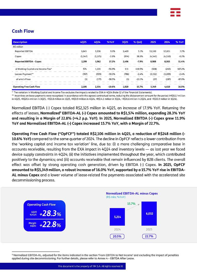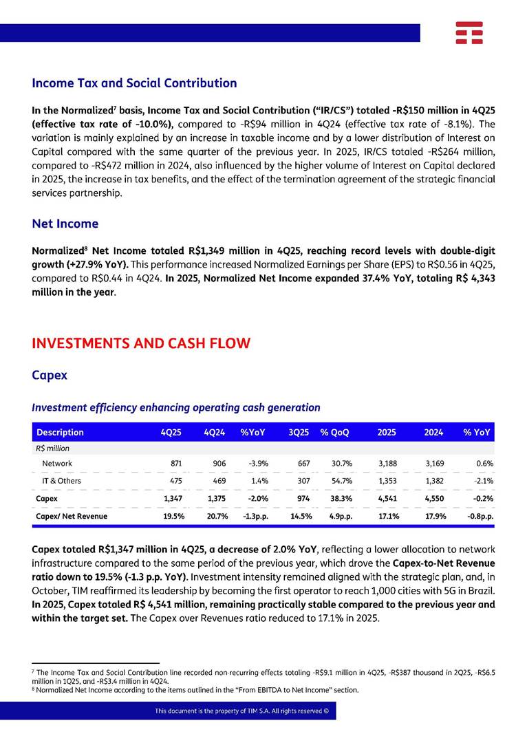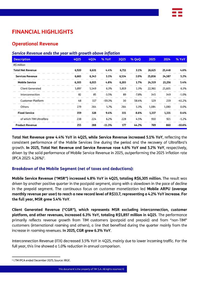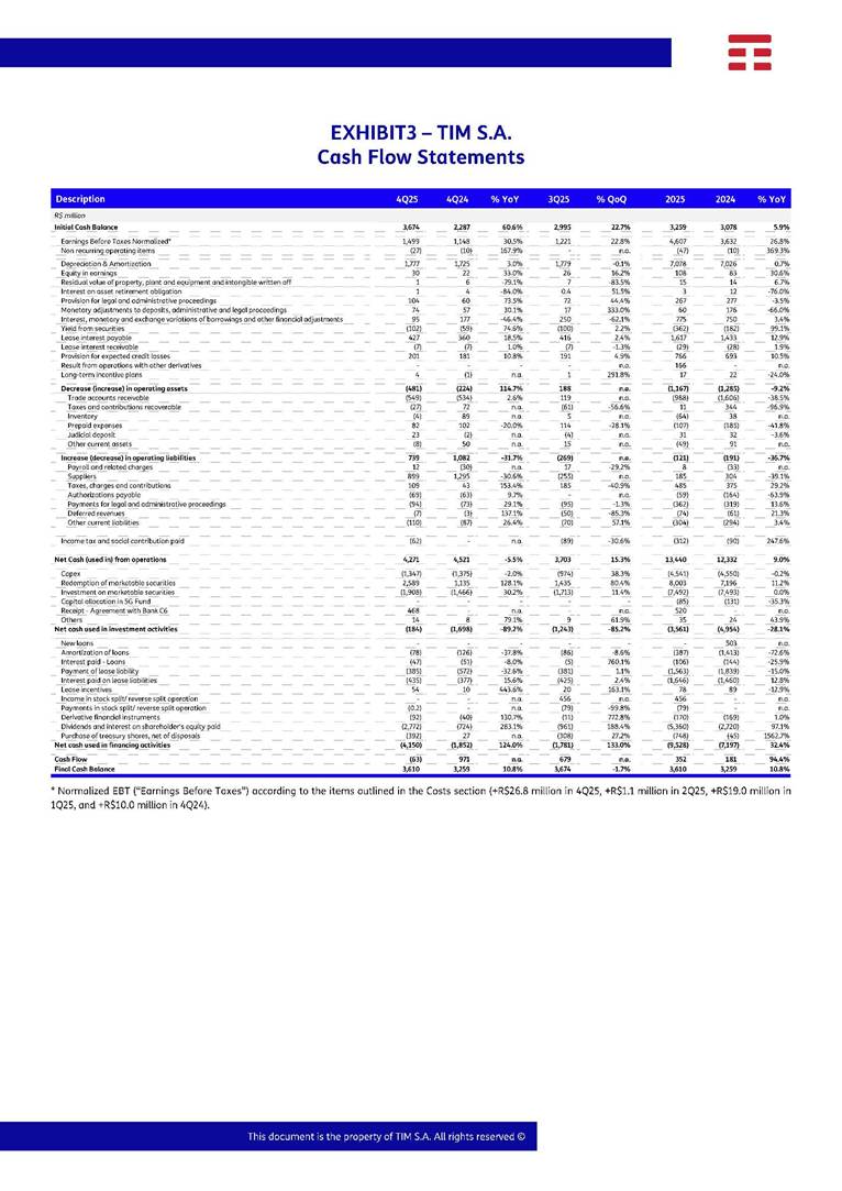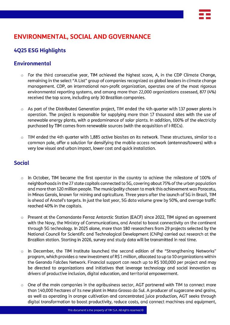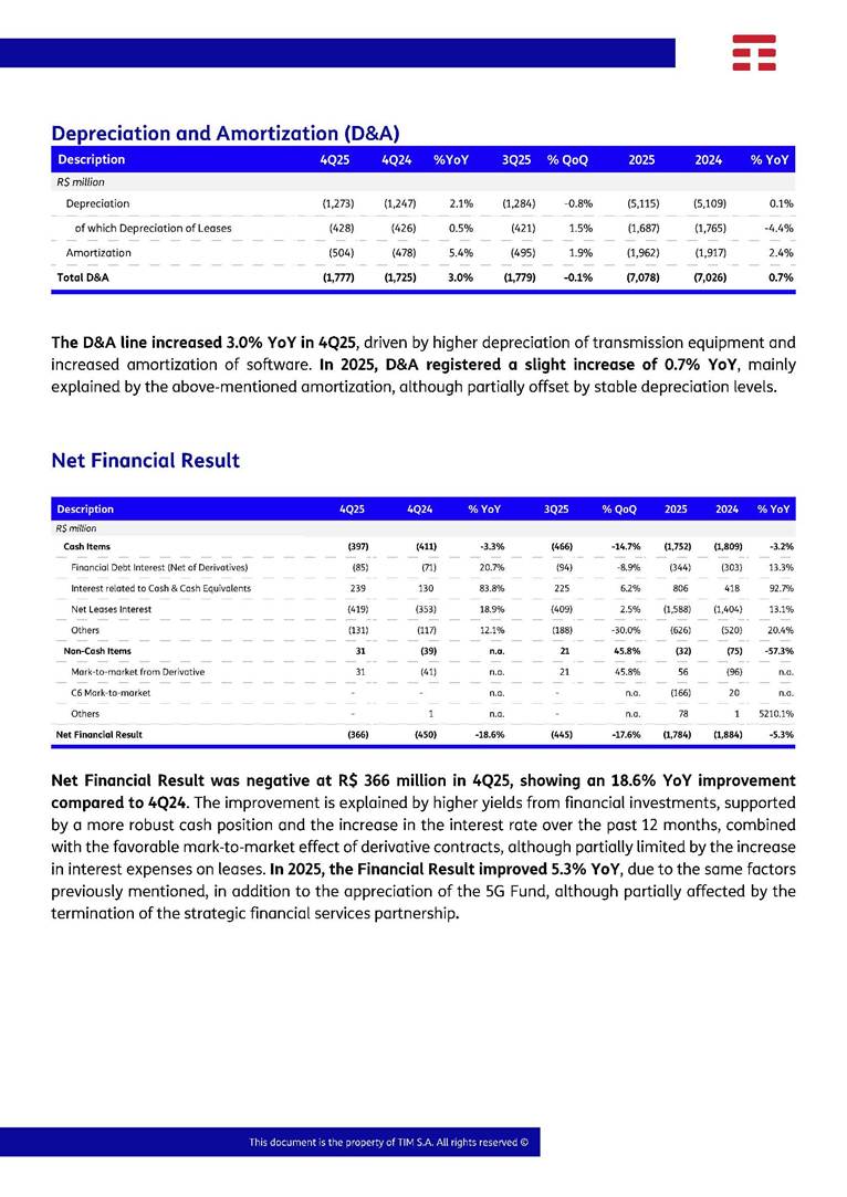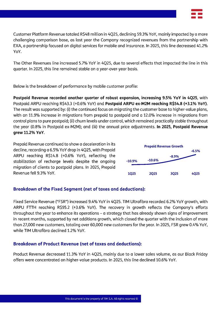 Classificado como Uso Interno Classificado como Uso Interno * EBITDA and Net Income normalized according to the items indicated in their respective sections . EBITDA -AL excluding the impact of site decommissioning fines . Operating Cash Flow (“OpCF ”) represents EBITDA -AL minus Capex . **According to the Opensignal report dated January 28, 2026 (Here ). RESULTS HIGHLIGHTS +27.9% Solid and consistent results drove the achievement of all 2025 targets +9.7% ENDING THE YEAR ON THE RIGHT TRACK Robust EBITDA performance supported margin expansion to the highest record level Another double -digit increase in Net Income brought it to the highest level ever recorded by the Company Normalized * EBITDA and EBITDA Margin (R$ Mln; % YoY ) Normalized * Net Income (R$ Mln; % YoY ) Mobile : Advancing the ‘3 B’s’ strategy, focused on Best Network : enhancing quality and experience ; Best Service: AI to drive caring revolution ; Best Offer : value -driven innovation to support portfolio evolution ; B2B : Accelerate revenues from data monetization initiatives and the adoption of Network as a Service while expanding our portfolio of IoT solutions and Tech offerings ; Broadband : Focus on drive operational improvement to sustain organic growth while maintain optionality to accelerate Broadband as the market evolves ; Efficiency : Consistent discipline combined with strategic capital allocation and expenditure focused on exploring new fronts ; AI: Elevate AI adoption to a transformative level by becoming an AI -First organization . BEST NETWORK: SIX NATIONAL AWARDS IN OPENSIGNAL’S LATEST REPORT 1st Place in Consistent Quality (fourth consecutive time): measures network stability in daily usage 1st Place in Reliability Experience: evaluates the ability to maintain stable connections 1st Place in Video Experience: measures the quality of on -demand streaming 1st Place in Live Video Experience: measures the quality of real -time broadcasts 1st Place in Time on Network: measures the amount of time users remain connected to the network 1st Place in 5G Availability: evaluates users’ actual access to the 5G network +5.2% +11.2% Announced as IoC, Dividends and Buyback through December R$ 4.7 Bln of Capex to Net Revenue in 2025 YoY evolution in Postpaid Revenue in 2025 YoY increase in Mobile Service Revenue in 2025 +5.4% 17.1% YoY growth of Service Revenue in 2025 YoY expansion of OpCF * in 2025 (Margin of 22.7%) +15.7% Expansion of Mobile Service Revenue supported by the strong performance of the Postpaid segment Continuously E nhancing Our Network Quality and Brand Perception Mobile Service Revenue (R$ Mln; % YoY ) +4.8% Solid execution in 2025, with continuous improvements across business verticals and efficiency Ensuring Our Leadership in 5G Coverage o Largest 5G mobile coverage in Brazil, with 1,089 cities served by the country's most awarded 5G network; o Network swap 100% completed in São Paulo and Minas Gerais; o Expansion of the network swap program to modernize 6,500 sites in the largest capitals of the country by 2027. A year of achievements in B2B Coverage Expanding Our Presence Across All Verticals o Achievement of R$ 1 billion in contracted revenue; o More than 26 million hectares covered with 4G (+33% YoY); o Over 10,000 km of roads covered (+83% YoY) and more than 472,000 public lighting points sold (+39% YoY); o Progress in the Mining vertical with contracts signed with the largest mining companies in Brazil; o More than 569,000 vehicles sold with an Internet access point integrated into the TIM network. RESULTS CONFERENCE February 11th, 2026, at : 10:00 a.m. (BRT) / 8:00 a.m. (US EST) Livestream (Zoom): Click here 4Q25 EARNINGS RELEASE Classificado como Uso Interno 4Q25 EARNINGS RELEASE FINANCIAL AND OPERATIONAL HIGHLIGHTS * Normalized EBITDA according to the items outlined in the Costs section (+R $26.8 million in 4Q25, +R$1.1 million in 2Q25, +R$19.0 million in 1Q25, and +R $10.0 million in 4Q24). Normalized Net Income according to the items outlined in the Costs section and by non -recurring effects in Income Tax and Social Contribution (-R$9.1 million in 4Q25, -R$387k in 2Q25, -R$6.5 million in 1Q25, and -R$3.4 million in 4Q24). EBITDA -AL excluding the impact of site decommissioning fines . 4Q25 4Q24 % YoY 3Q25 % QoQ 2025 2024 % YoY FINANCIAL (R$ million) Net Revenues 6,920 6,631 4.4% 6,711 3.1% 26,625 25,448 4.6% Services Revenues 6,665 6,343 5.1% 6,534 2.0% 25,856 24,587 5.2% Mobile Service 6,305 6,015 4.8% 6,203 1.7% 24,519 23,256 5.4% Fixed Service 359 328 9.4% 331 8.6% 1,337 1,331 0.4% Normalized* Operating Expenses (3,248) (3,285) -1.1% (3,242) 0.2% (13,048) (12,823) 1.8% Normalized* EBITDA 3,672 3,346 9.7% 3,469 5.8% 13,577 12,625 7.5% Normalized* EBITDA Margin 53.1% 50.5% 2.6p.p. 51.7% 1.4p.p. 51.0% 49.6% 1.4p.p. Normalized* Net Income 1,349 1,055 27.9% 1,208 11.7% 4,343 3,160 37.4% Capex (1,347) (1,375) -2.0% (974) 38.3% 4,541 4,550 -0.2% Normalized* EBITDA-AL - Capex 1,574 1,227 28.3% 1,738 -9.4% 6,032 5,214 15.7% OPERATIONAL ('000) Mobile Customer Base 61,974 62,058 -0.1% 62,619 -1.0% 61,974 62,058 -0.1% Prepaid 29,226 31,857 -8.3% 30,275 -3.5% 29,226 31,857 -8.3% Postpaid 32,748 30,202 8.4% 32,344 1.2% 32,748 30,202 8.4% TIM Ultrafibra Customer Base 850 790 7.6% 823 3.3% 850 790 7.6% Description RESULTS CONFERENCE February 11th, 2026, at : 10:00 a.m. (BRT) / 8:00 a.m. (US EST) Livestream (Zoom): Click here This document is the property of TIM S.A. All rights reserved © RE CENT AND SUBSEQUENT EVENTS Shareholder Remuneration On December 16, 2025, the Board of Directors of TIM S.A. approved the distribution of Interest on Capital in the amount of R$420 million, in addition to approving the distribution of Dividends totaling R$1,790 million. For further details, please visit TIM S.A.’s Investor Relations website: Filings Cancellation of Treasury Shares On December 16, 2025, TIM S.A. informed the market that the Company’s Board of Directors approved the cancellation 