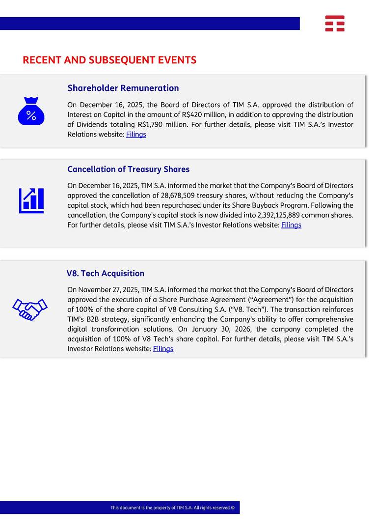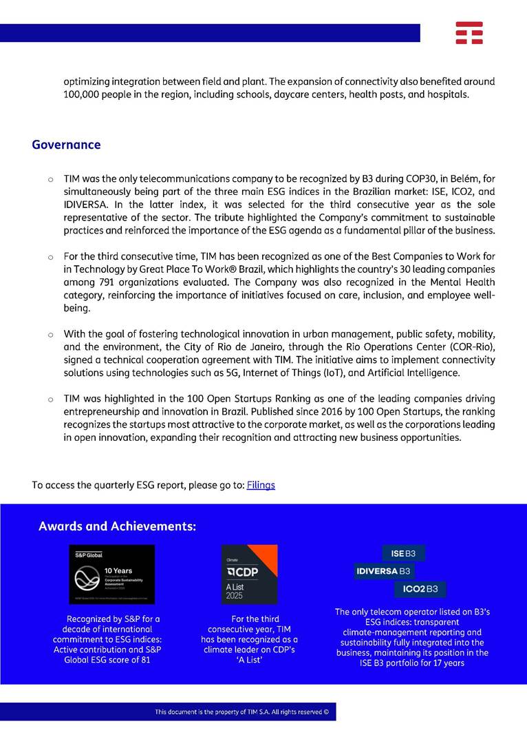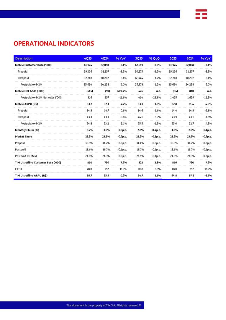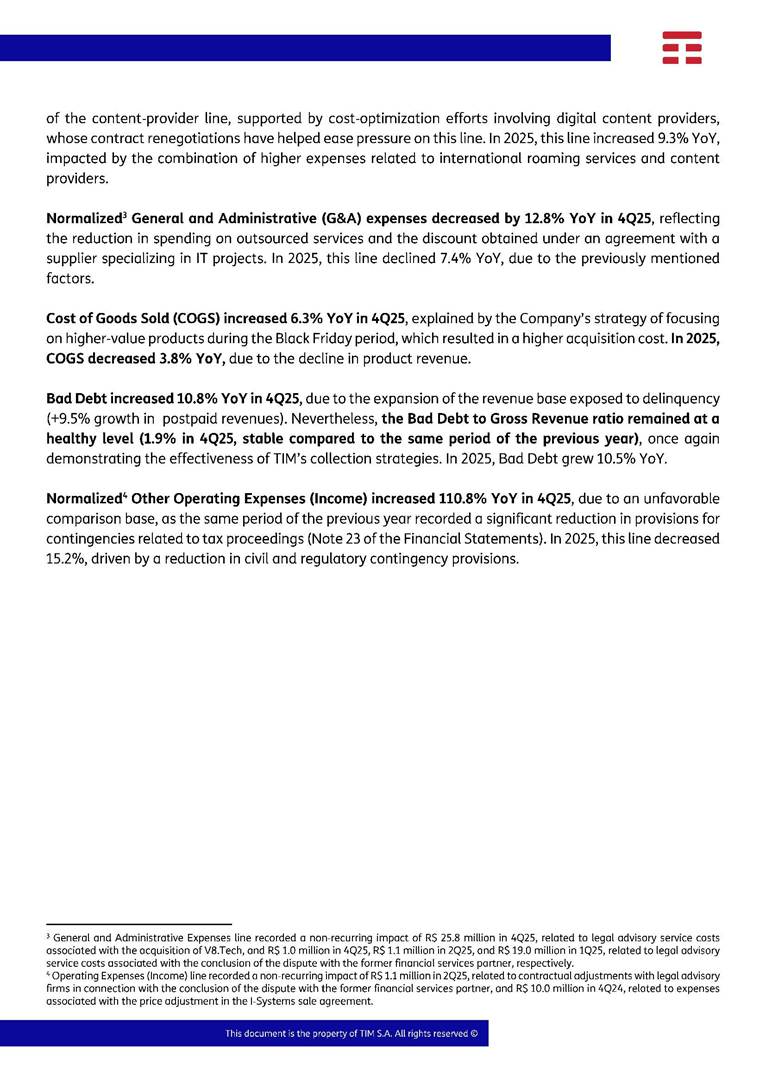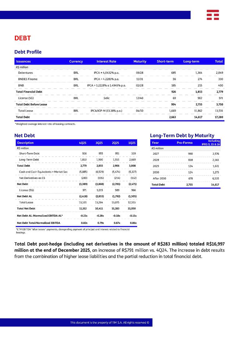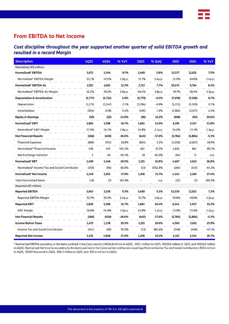 Classificado como Uso Interno Classificado como Uso Interno * EBITDA and Net Income normalized according to the items indicated in their respective sections . EBITDA -AL excluding the impact of site decommissioning fines . Operating Cash Flow (“OpCF ”) represents EBITDA -AL minus Capex . **According to the Opensignal report dated January 28, 2026 (Here ). RESULTS HIGHLIGHTS +27.9% Solid and consistent results drove the achievement of all 2025 targets +9.7% ENDING THE YEAR ON THE RIGHT TRACK Robust EBITDA performance supported margin expansion to the highest record level Another double -digit increase in Net Income brought it to the highest level ever recorded by the Company Normalized * EBITDA and EBITDA Margin (R$ Mln; % YoY ) Normalized * Net Income (R$ Mln; % YoY ) Mobile : Advancing the ‘3 B’s’ strategy, focused on Best Network : enhancing quality and experience ; Best Service: AI to drive caring revolution ; Best Offer : value -driven innovation to support portfolio evolution ; B2B : Accelerate revenues from data monetization initiatives and the adoption of Network as a Service while expanding our portfolio of IoT solutions and Tech offerings ; Broadband : Focus on drive operational improvement to sustain organic growth while maintain optionality to accelerate Broadband as the market evolves ; Efficiency : Consistent discipline combined with strategic capital allocation and expenditure focused on exploring new fronts ; AI: Elevate AI adoption to a transformative level by becoming an AI -First organization . BEST NETWORK: SIX NATIONAL AWARDS IN OPENSIGNAL’S LATEST REPORT 1st Place in Consistent Quality (fourth consecutive time): measures network stability in daily usage 1st Place in Reliability Experience: evaluates the ability to maintain stable connections 1st Place in Video Experience: measures the quality of on -demand streaming 1st Place in Live Video Experience: measures the quality of real -time broadcasts 1st Place in Time on Network: measures the amount of time users remain connected to the network 1st Place in 5G Availability: evaluates users’ actual access to the 5G network +5.2% +11.2% Announced as IoC, Dividends and Buyback through December R$ 4.7 Bln of Capex to Net Revenue in 2025 YoY evolution in Postpaid Revenue in 2025 YoY increase in Mobile Service Revenue in 2025 +5.4% 17.1% YoY growth of Service Revenue in 2025 YoY expansion of OpCF * in 2025 (Margin of 22.7%) +15.7% Expansion of Mobile Service Revenue supported by the strong performance of the Postpaid segment Continuously E nhancing Our Network Quality and Brand Perception Mobile Service Revenue (R$ Mln; % YoY ) +4.8% Solid execution in 2025, with continuous improvements across business verticals and efficiency Ensuring Our Leadership in 5G Coverage o Largest 5G mobile coverage in Brazil, with 1,089 cities served by the country's most awarded 5G network; o Network swap 100% completed in São Paulo and Minas Gerais; o Expansion of the network swap program to modernize 6,500 sites in the largest capitals of the country by 2027. A year of achievements in B2B Coverage Expanding Our Presence Across All Verticals o Achievement of R$ 1 billion in contracted revenue; o More than 26 million hectares covered with 4G (+33% YoY); o Over 10,000 km of roads covered (+83% YoY) and more than 472,000 public lighting points sold (+39% YoY); o Progress in the Mining vertical with contracts signed with the largest mining companies in Brazil; o More than 569,000 vehicles sold with an Internet access point integrated into the TIM network. RESULTS CONFERENCE February 11th, 2026, at : 10:00 a.m. (BRT) / 8:00 a.m. (US EST) Livestream (Zoom): Click here 4Q25 EARNINGS RELEASE Classificado como Uso Interno 4Q25 EARNINGS RELEASE FINANCIAL AND OPERATIONAL HIGHLIGHTS * Normalized EBITDA according to the items outlined in the Costs section (+R $26.8 million in 4Q25, +R$1.1 million in 2Q25, +R$19.0 million in 1Q25, and +R $10.0 million in 4Q24). Normalized Net Income according to the items outlined in the Costs section and by non -recurring effects in Income Tax and Social Contribution (-R$9.1 million in 4Q25, -R$387k in 2Q25, -R$6.5 million in 1Q25, and -R$3.4 million in 4Q24). EBITDA -AL excluding the impact of site decommissioning fines . 4Q25 4Q24 % YoY 3Q25 % QoQ 2025 2024 % YoY FINANCIAL (R$ million) Net Revenues 6,920 6,631 4.4% 6,711 3.1% 26,625 25,448 4.6% Services Revenues 6,665 6,343 5.1% 6,534 2.0% 25,856 24,587 5.2% Mobile Service 6,305 6,015 4.8% 6,203 1.7% 24,519 23,256 5.4% Fixed Service 359 328 9.4% 331 8.6% 1,337 1,331 0.4% Normalized* Operating Expenses (3,248) (3,285) -1.1% (3,242) 0.2% (13,048) (12,823) 1.8% Normalized* EBITDA 3,672 3,346 9.7% 3,469 5.8% 13,577 12,625 7.5% Normalized* EBITDA Margin 53.1% 50.5% 2.6p.p. 51.7% 1.4p.p. 51.0% 49.6% 1.4p.p. Normalized* Net Income 1,349 1,055 27.9% 1,208 11.7% 4,343 3,160 37.4% Capex (1,347) (1,375) -2.0% (974) 38.3% 4,541 4,550 -0.2% Normalized* EBITDA-AL - Capex 1,574 1,227 28.3% 1,738 -9.4% 6,032 5,214 15.7% OPERATIONAL ('000) Mobile Customer Base 61,974 62,058 -0.1% 62,619 -1.0% 61,974 62,058 -0.1% Prepaid 29,226 31,857 -8.3% 30,275 -3.5% 29,226 31,857 -8.3% Postpaid 32,748 30,202 8.4% 32,344 1.2% 32,748 30,202 8.4% TIM Ultrafibra Customer Base 850 790 7.6% 823 3.3% 850 790 7.6% Description RESULTS CONFERENCE February 11th, 2026, at : 10:00 a.m. (BRT) / 8:00 a.m. (US EST) Livestream (Zoom): Click here This document is the property of TIM S.A. All rights reserved © RE CENT AND SUBSEQUENT EVENTS Shareholder Remuneration On December 16, 2025, the Board of Directors of TIM S.A. approved the distribution of Interest on Capital in the amount of R$420 million, in addition to approving the distribution of Dividends totaling R$1,790 million. For further details, please visit TIM S.A.’s Investor Relations website: Filings Cancellation of Treasury Shares On December 16, 2025, TIM S.A. informed the market that the Company’s Board of Directors approved the cancellation 