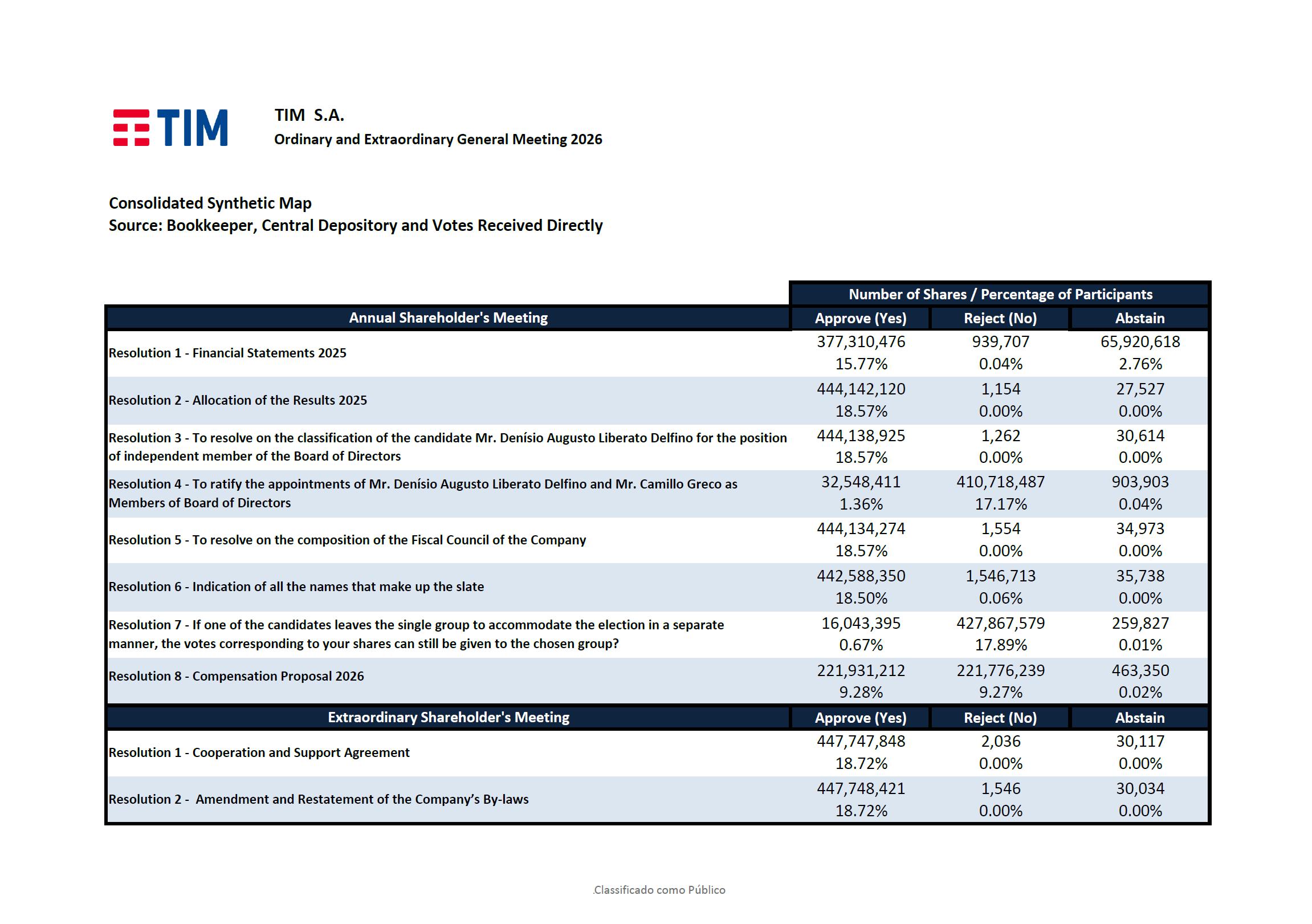 TIM S.A. Ordinary and Extraordinary General Meeting 2026 Consolidated Synthetic Map Source: Bookkeeper, Central Depository and Votes Received Directly Approve (Yes) Reject (No) Abstain 377,310,476 939,707 65,920,618 15.77% 0.04% 2.76% 444,142,120 1,154 27,527 18.57% 0.00% 0.00% 444,138,925 1,262 30,614 18.57% 0.00% 0.00% 32,548,411 410,718,487 903,903 1.36% 17.17% 0.04% 444,134,274 1,554 34,973 18.57% 0.00% 0.00% 442,588,350 1,546,713 35,738 18.50% 0.06% 0.00% 16,043,395 427,867,579 259,827 0.67% 17.89% 0.01% 221,931,212 221,776,239 463,350 9.28% 9.27% 0.02% Approve (Yes) Reject (No) Abstain 447,747,848 2,036 30,117 18.72% 0.00% 0.00% 447,748,421 1,546 30,034 18.72% 0.00% 0.00% Resolution 2 - Amendment and Restatement of the Company’s By-laws Resolution 3 - To resolve on the classification of the candidate Mr. Denísio Augusto Liberato Delfino for the position of independent member of the Board of Directors Number of Shares / Percentage of Participants Annual Shareholder's Meeting Resolution 1 - Financial Statements 2025 Resolution 2 - Allocation of the Results 2025 Resolution 1 - Cooperation and Support Agreement Resolution 4 - To ratify the appointments of Mr. Denísio Augusto Liberato Delfino and Mr. Camillo Greco as Members of Board of Directors Resolution 5 - To resolve on the composition of the Fiscal Council of the Company Resolution 6 - Indication of all the names that make up the slate Resolution 7 - If one of the candidates leaves the single group to accommodate the election in a separatemanner, the votes corresponding to your shares can still be given to the chosen group? Resolution 8 - Compensation Proposal 2026 Extraordinary Shareholder's Meeting #Classificado como Público