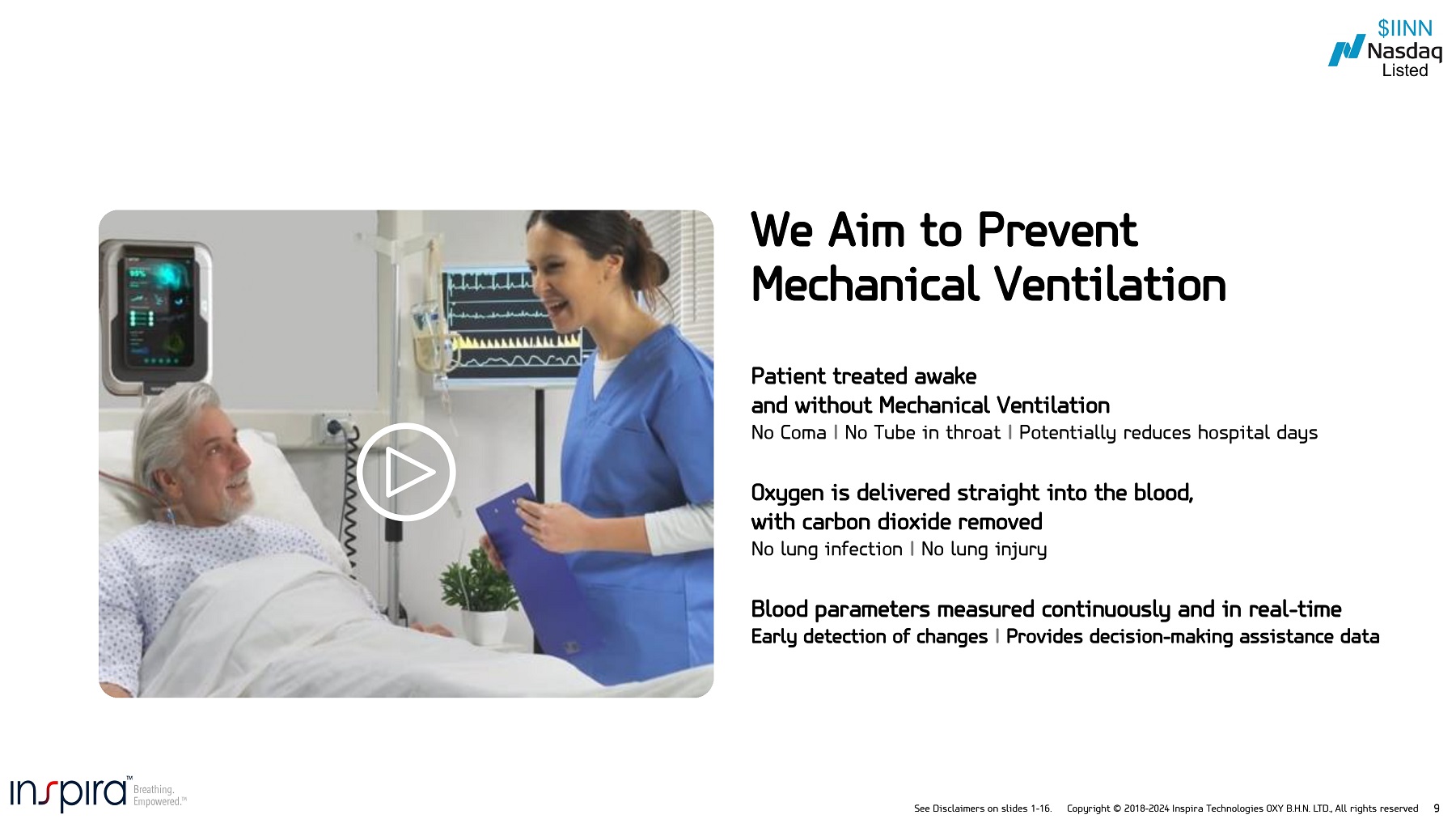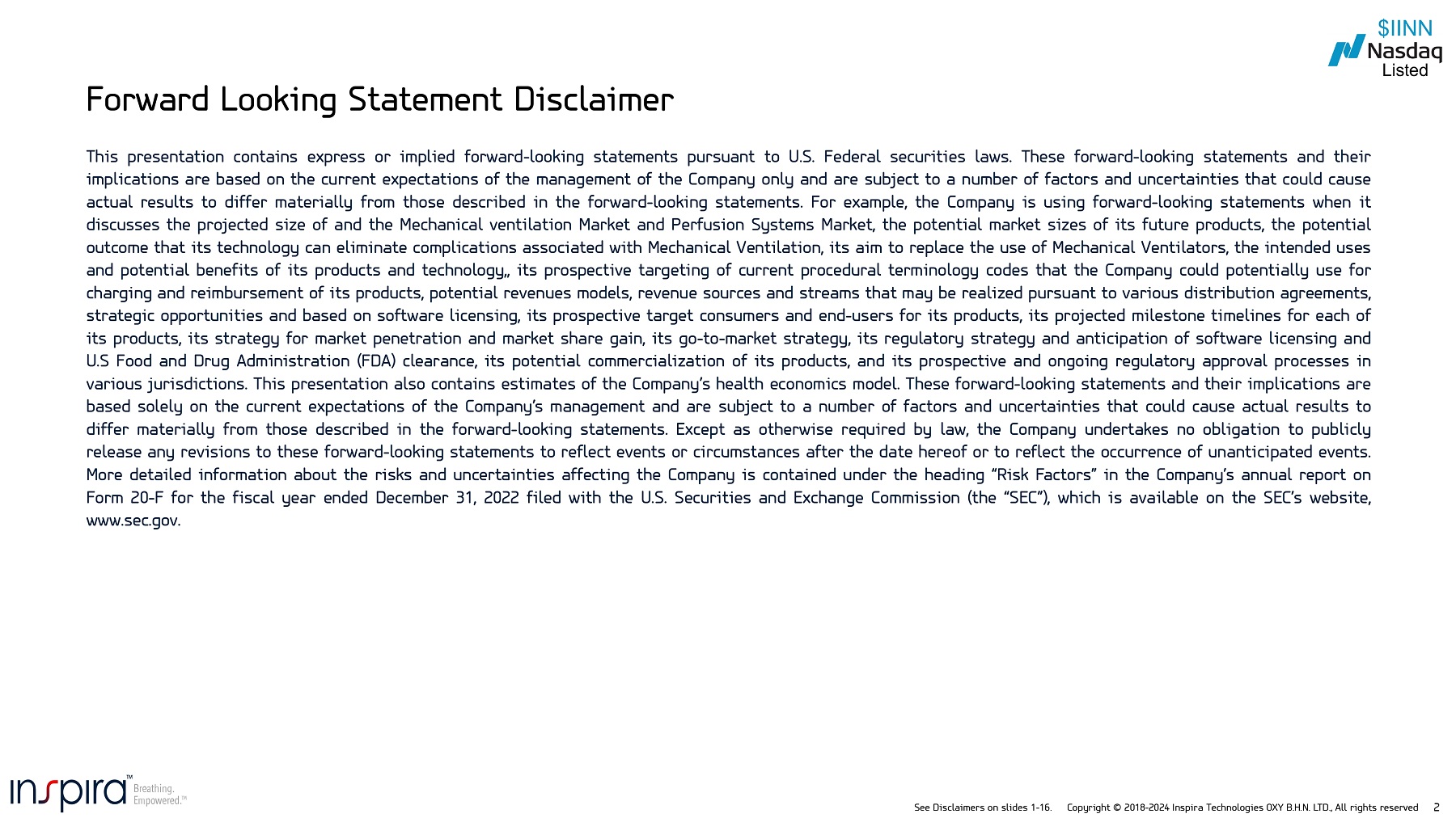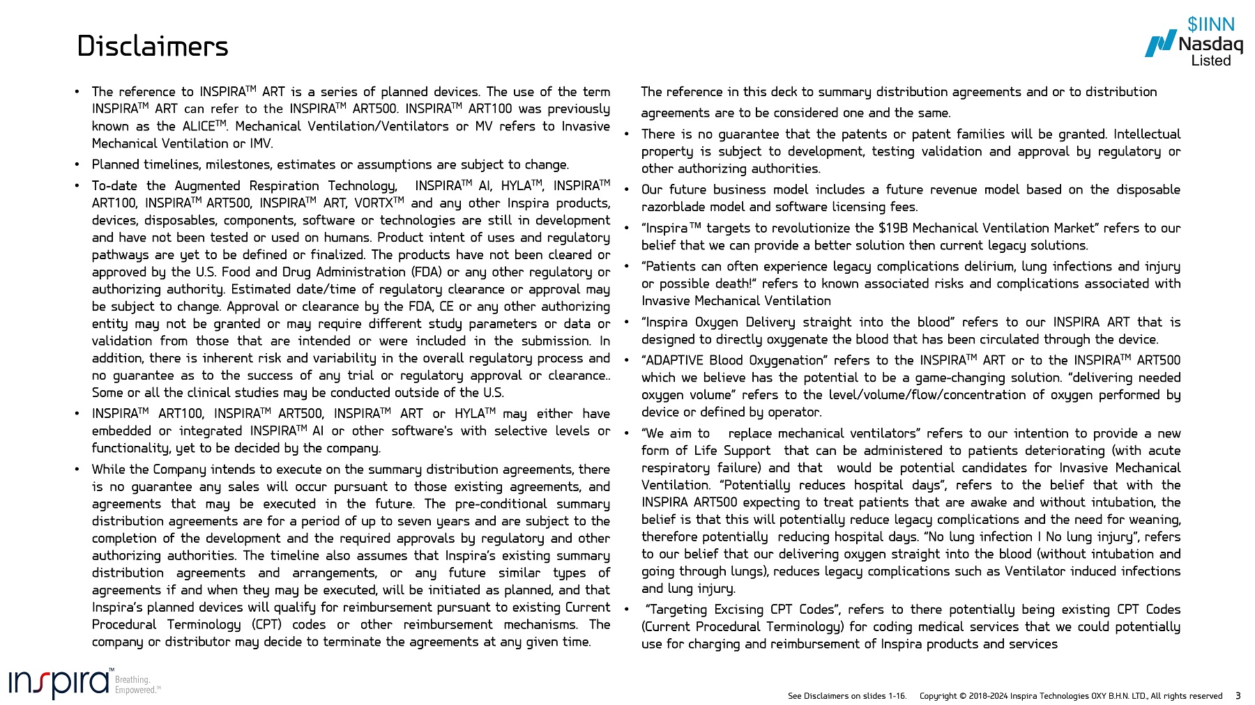 See Disclaimers on slides 1 - 16. Copyright © 2018 - 2024 Inspira Technologies OXY B.H.N. LTD., All rights reserved 2 This presentation contains express or implied forward - looking statements pursuant to U . S . Federal securities laws . These forward - looking statements and their implications are based on the current expectations of the management of the Company only and are subject to a number of factors and uncertainties that could cause actual results to differ materially from those described in the forward - looking statements . For example, the Company is using forward - looking statements when it discusses the projected size of and the Mechanical ventilation Market and Perfusion Systems Market, the potential market sizes of its future products, the potential outcome that its technology can eliminate complications associated with Mechanical Ventilation, its aim to replace the use of Mechanical Ventilators, the intended uses and potential benefits of its products and technology,, its prospective targeting of current procedural terminology codes that the Company could potentially use for charging and reimbursement of its products, potential revenues models, revenue sources and streams that may be realized pursuant to various distribution agreements, strategic opportunities and based on software licensing, its prospective target consumers and end - users for its products, its projected milestone timelines for each of its products, its strategy for market penetration and market share gain, its go - to - market strategy, its regulatory strategy and anticipation of software licensing and U . S Food and Drug Administration (FDA) clearance, its potential commercialization of its products, and its prospective and ongoing regulatory approval processes in various jurisdictions . This presentation also contains estimates of the Company’s health economics model . These forward - looking statements and their implications are based solely on the current expectations of the Company’s management and are subject to a number of factors and uncertainties that could cause actual results to differ materially from those described in the forward - looking statements . Except as otherwise required by law, the Company undertakes no obligation to publicly release any revisions to these forward - looking statements to reflect events or circumstances after the date hereof or to reflect the occurrence of unanticipated events . More detailed information about the risks and uncertainties affecting the Company is contained under the heading “Risk Factors” in the Company’s annual report on Form 20 - F for the fiscal year ended December 31 , 2022 filed with the U . S . Securities and Exchange Commission (the “SEC”), which is available on the SEC’s website, www . sec . gov . Forward Looking Statement Disclaimer