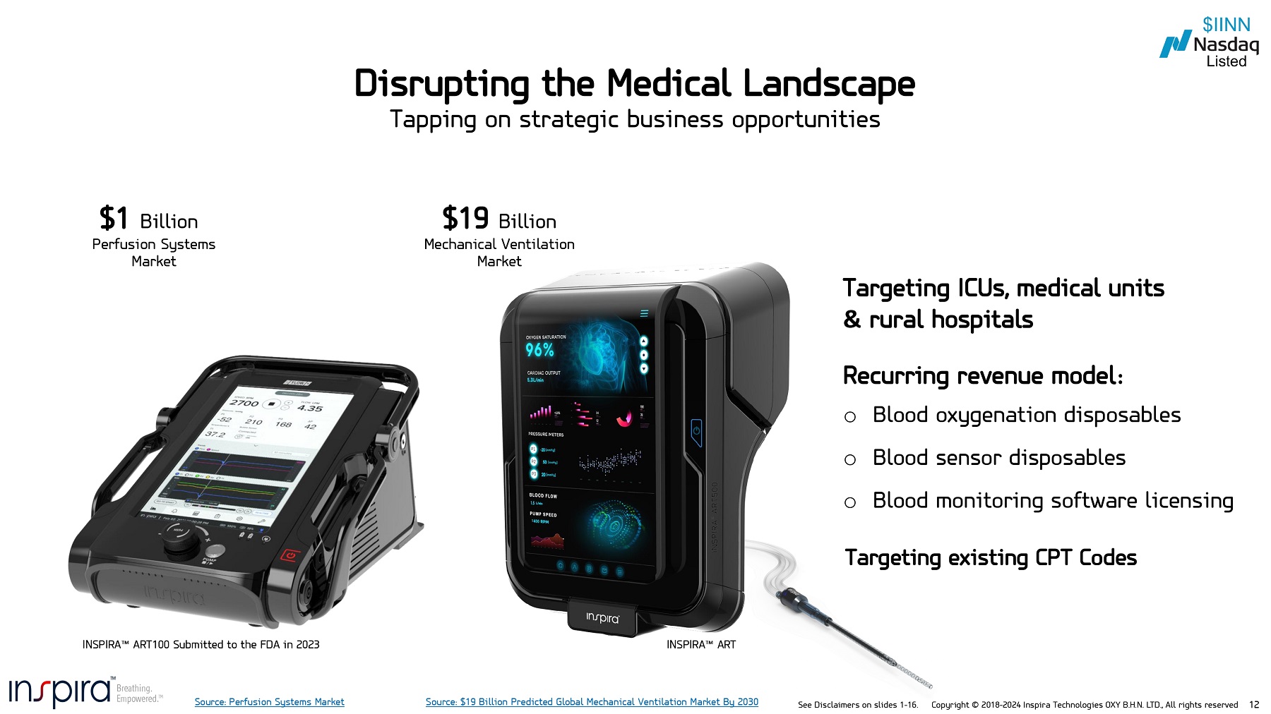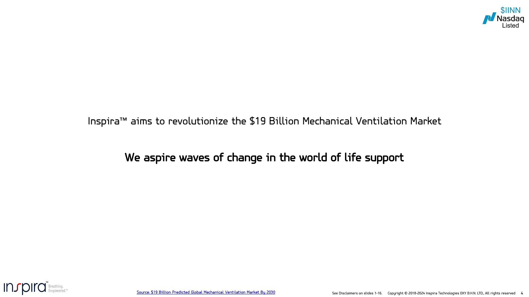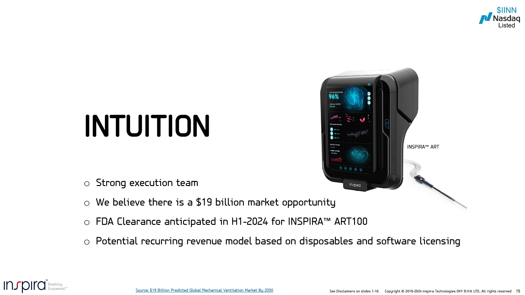 See Disclaimers on slides 1 - 16. Copyright © 2018 - 2024 Inspira Technologies OXY B.H.N. LTD., All rights reserved 3 • The reference to INSPIRA TM ART is a series of planned devices . The use of the term INSPIRA TM ART can refer to the INSPIRA TM ART 500 . INSPIRA TM ART 100 was previously known as the ALICE TM . Mechanical Ventilation/Ventilators or MV refers to Invasive Mechanical Ventilation or IMV . • Planned timelines, milestones, estimates or assumptions are subject to change . • To - date the Augmented Respiration Technology, INSPIRA TM AI, HYLA TM , INSPIRA TM ART 100 , INSPIRA TM ART 500 , INSPIRA TM ART, VORTX TM and any other Inspira products, devices, disposables, components, software or technologies are still in development and have not been tested or used on humans . Product intent of uses and regulatory pathways are yet to be defined or finalized . The products have not been cleared or approved by the U . S . Food and Drug Administration (FDA) or any other regulatory or authorizing authority . Estimated date/time of regulatory clearance or approval may be subject to change . Approval or clearance by the FDA, CE or any other authorizing entity may not be granted or may require different study parameters or data or validation from those that are intended or were included in the submission . In addition, there is inherent risk and variability in the overall regulatory process and no guarantee as to the success of any trial or regulatory approval or clearance .. Some or all the clinical studies may be conducted outside of the U . S . • INSPIRA TM ART 100 , INSPIRA TM ART 500 , INSPIRA TM ART or HYLA TM may either have embedded or integrated INSPIRA TM AI or other software's with selective levels or functionality, yet to be decided by the company . • While the Company intends to execute on the summary distribution agreements, there is no guarantee any sales will occur pursuant to those existing agreements, and agreements that may be executed in the future . The pre - conditional summary distribution agreements are for a period of up to seven years and are subject to the completion of the development and the required approvals by regulatory and other authorizing authorities . The timeline also assumes that Inspira’s existing summary distribution agreements and arrangements, or any future similar types of agreements if and when they may be executed, will be initiated as planned, and that Inspira’s planned devices will qualify for reimbursement pursuant to existing Current Procedural Terminology (CPT) codes or other reimbursement mechanisms . The company or distributor may decide to terminate the agreements at any given time . The reference in this deck to summary distribution agreements and or to distribution agreements are to be considered one and the same . • There is no guarantee that the patents or patent families will be granted . Intellectual property is subject to development, testing validation and approval by regulatory or other authorizing authorities . • Our future business model includes a future revenue model based on the disposable razorblade model and software licensing fees . • “Inspira targets to revolutionize the $ 19 B Mechanical Ventilation Market” refers to our belief that we can provide a better solution then current legacy solutions . • “Patients can often experience legacy complications delirium, lung infections and injury or possible death!“ refers to known associated risks and complications associated with Invasive Mechanical Ventilation • “Inspira Oxygen Delivery straight into the blood” refers to our INSPIRA ART that is designed to directly oxygenate the blood that has been circulated through the device . • “ADAPTIVE Blood Oxygenation” refers to the INSPIRA TM ART or to the INSPIRA TM ART 500 which we believe has the potential to be a game - changing solution . “delivering needed oxygen volume” refers to the level/volume/flow/concentration of oxygen performed by device or defined by operator . • “We aim to replace mechanical ventilators” refers to our intention to provide a new form of Life Support that can be administered to patients deteriorating (with acute respiratory failure) and that would be potential candidates for Invasive Mechanical Ventilation . “Potentially reduces hospital days”, refers to the belief that with the INSPIRA ART 500 expecting to treat patients that are awake and without intubation, the belief is that this will potentially reduce legacy complications and the need for weaning, therefore potentially reducing hospital days . “No lung infection I No lung injury”, refers to our belief that our delivering oxygen straight into the blood (without intubation and going through lungs), reduces legacy complications such as Ventilator induced infections and lung injury . • “Targeting Excising CPT Codes”, refers to there potentially being existing CPT Codes (Current Procedural Terminology) for coding medical services that we could potentially use for charging and reimbursement of Inspira products and services Disclaimers