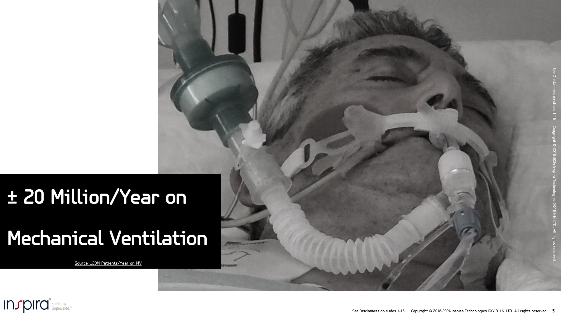 See Disclaimers on slides 1 - 16. Copyright © 2018 - 2024 Inspira Technologies OXY B.H.N. LTD., All rights reserved 5 See Disclaimers on slides 1 - 16 Copyright © 2018 - 2024 Inspira Technologies OXY B.H.N. LTD., All rights reserved ц 20 Million/Year on Mechanical Ventilation Source: ц 20M Patients/Year on MV