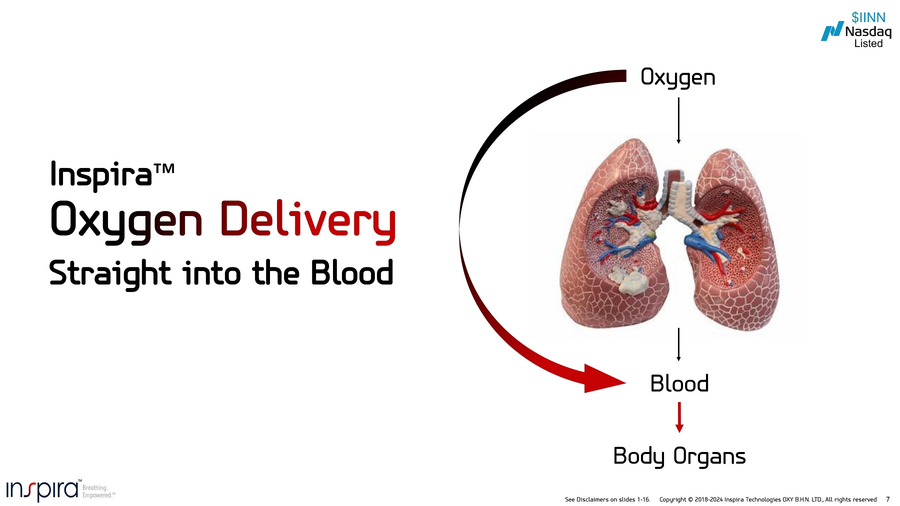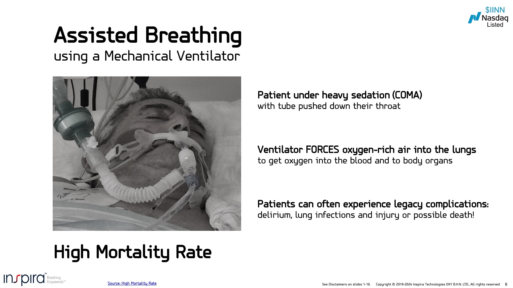 See Disclaimers on slides 1 - 16. Copyright © 2018 - 2024 Inspira Technologies OXY B.H.N. LTD., All rights reserved 6 Patients can often experience legacy complications: delirium, lung infections and injury or possible death! Patient under heavy sedation (COMA) with tube pushed down their throat Ventilator FORCES oxygen - rich air into the lungs to get oxygen into the blood and to body organs High Mortality Rate Assisted Breathing using a Mechanical Ventilator Source: High Mortality Rate