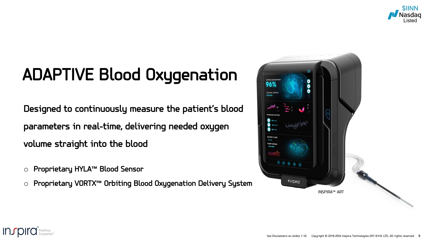 See Disclaimers on slides 1 - 16. Copyright © 2018 - 2024 Inspira Technologies OXY B.H.N. LTD., All rights reserved 7 Oxygen Blood Body Organs Straight into the Blood Inspira