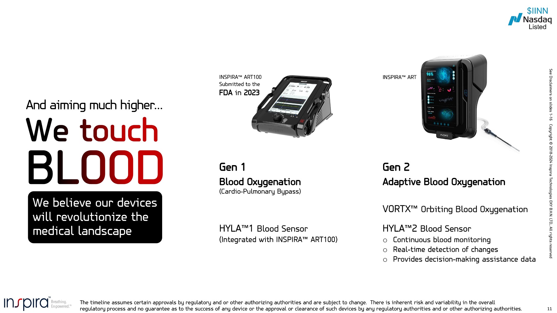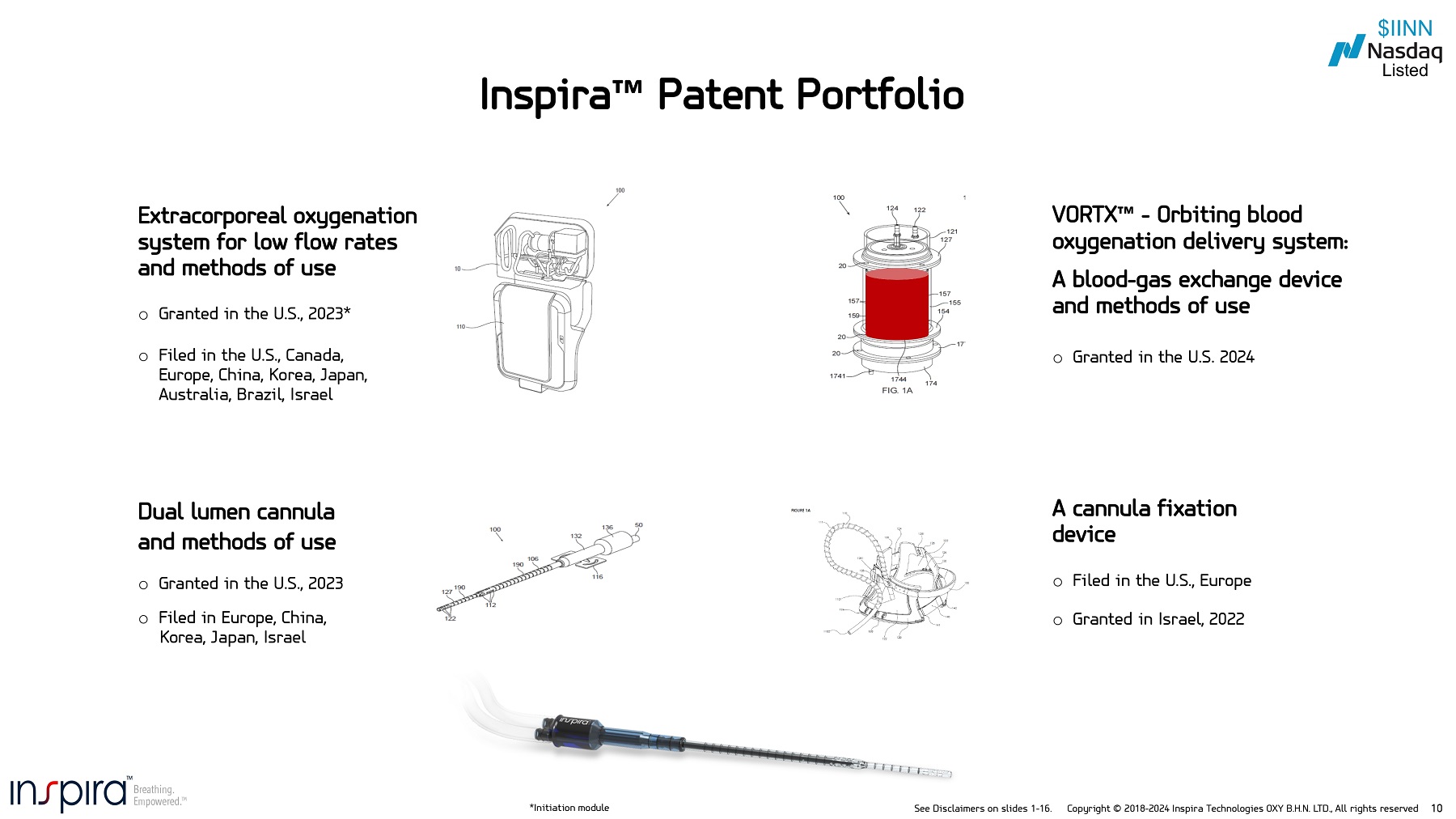 See Disclaimers on slides 1 - 16. Copyright © 2018 - 2024 Inspira Technologies OXY B.H.N. LTD., All rights reserved 10 VORTX - Orbiting blood oxygenation delivery system: A blood - gas exchange device and methods of use Dual lumen cannula and methods of use o Granted in the U.S., 2023 o Filed in Europe, China, Korea, Japan, Israel Inspira Patent Portfolio A cannula fixation device Extracorporeal oxygenation system for low flow rates and methods of use o Granted in the U.S., 2023* o Filed in the U.S., Canada, Europe, China, Korea, Japan, Australia, Brazil, Israel o Filed in the U.S., Europe o Granted in Israel, 2022 *Initiation module o Granted in the U.S. 2024
