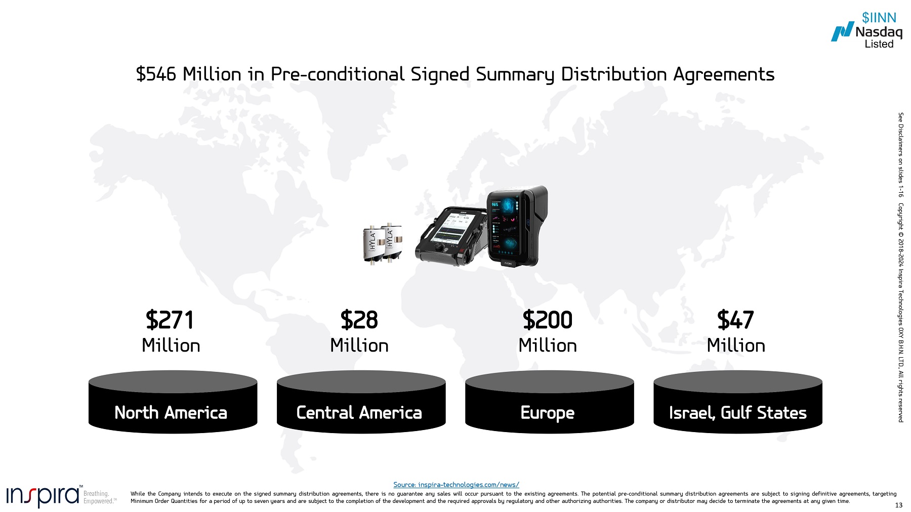 13 $546 Million in Pre - conditional Signed Summary Distribution Agreements Source: inspira - technologies.com/news/ While the Company intends to execute on the signed summary distribution agreements, there is no guarantee any sales will occur pursuant to the existing agreements. The potential pre - conditional summary distribution agreements are subject to signing definitive agreements, targeting $271 Million North America $28 Million Central America $200 Million Europe $47 Million Israel, Gulf States Minimum Order Quantities for a period of up to seven years and are subject to the completion of the development and the required approvals by regulatory and other authorizing authorities. The company or distributor may decide to terminate the agreements at any given time. See Disclaimers on slides 1 - 16 Copyright © 2018 - 2024 Inspira Technologies OXY B.H.N. LTD., All rights reserved