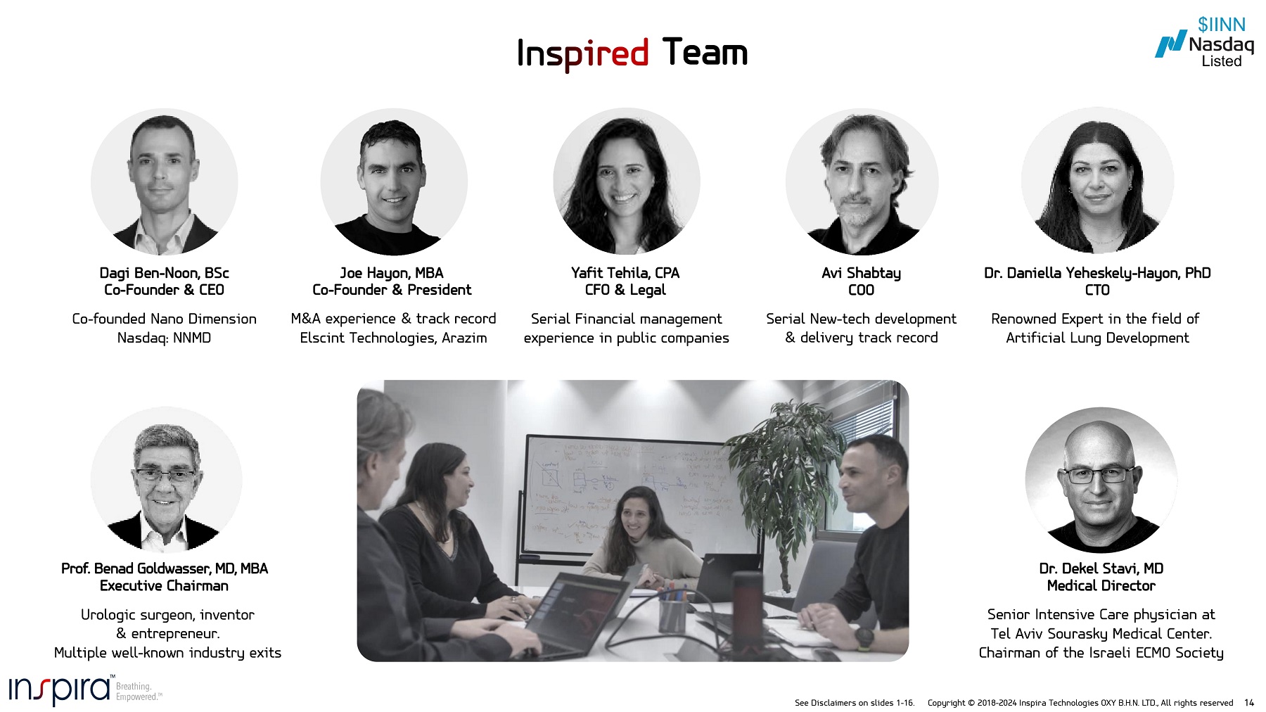 See Disclaimers on slides 1 - 16. Copyright © 2018 - 2024 Inspira Technologies OXY B.H.N. LTD., All rights reserved 14 Dr. Daniella Yeheskely - Hayon, PhD CTO Renowned Expert in the field of Artificial Lung Development Yafit Tehila, CPA CFO & Legal Serial Financial management experience in public companies Dagi Ben - Noon, BSc Co - Founder & CEO Co - founded Nano Dimension Nasdaq: NNMD Joe Hayon, MBA Co - Founder & President M & A experience & track record Elscint Technologies, Arazim Avi Shabtay COO Serial New - tech development & delivery track record Prof. Benad Goldwasser, MD, MBA Executive Chairman Urologic surgeon, inventor & entrepreneur. Multiple well - known industry exits Dr. Dekel Stavi, MD Medical Director Senior Intensive Care physician at Tel Aviv Sourasky Medical Center. Chairman of the Israeli ECMO Society Team
