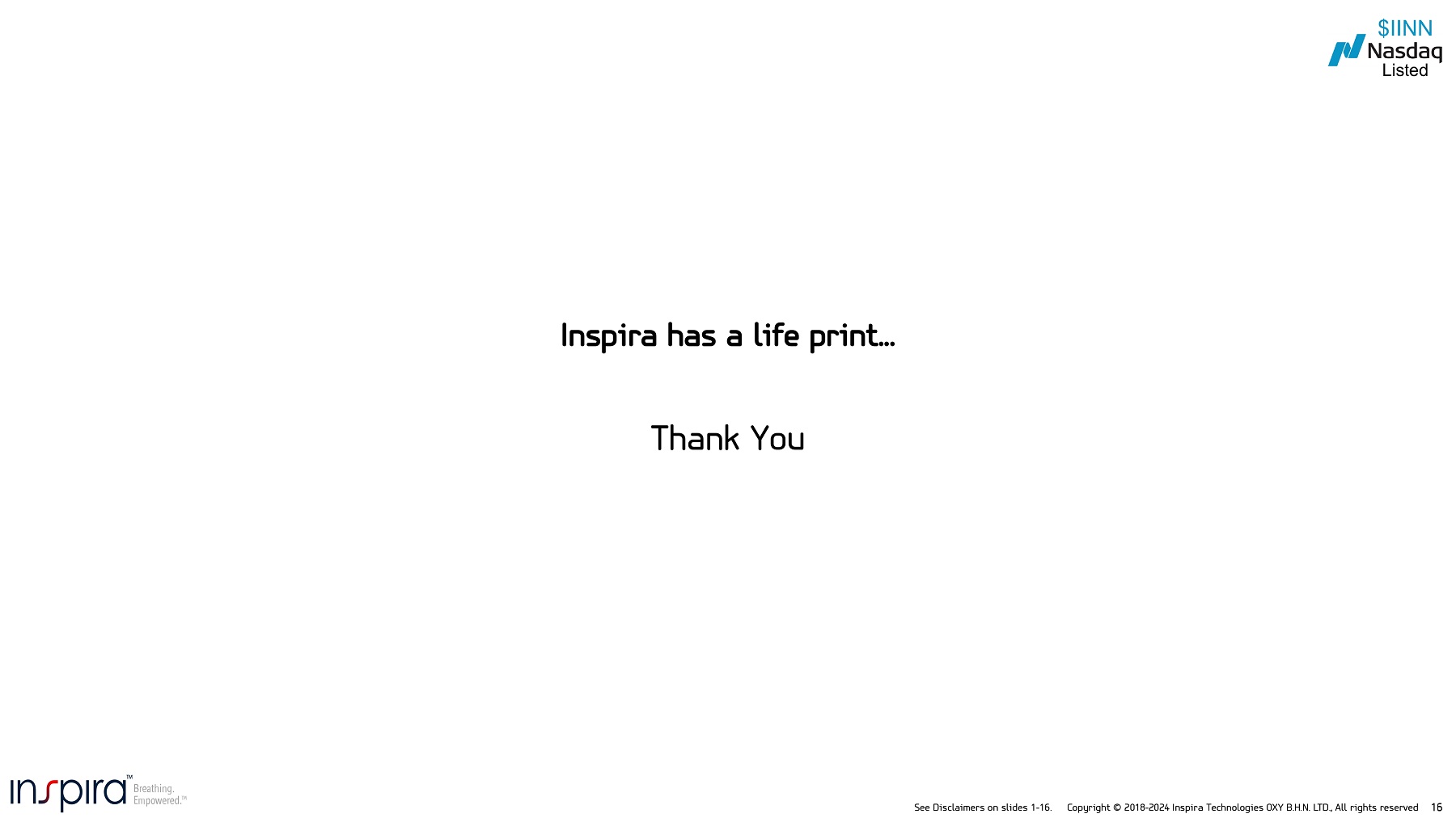 See Disclaimers on slides 1 - 16. Copyright © 2018 - 2024 Inspira Technologies OXY B.H.N. LTD., All rights reserved 16 Inspira has a life print... Thank You