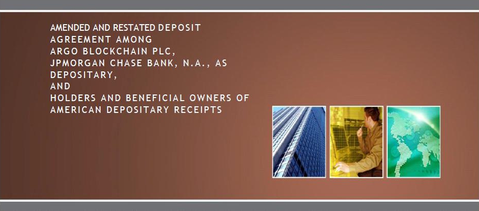 AMENDED AND RESTATED DEPOSIT AGREEMENT, dated as of December 12, 2025 (the "Deposit Agreement"), among ARGO BLOCKCHAIN PLC, a public limited company incorporated under the laws of England and Wales, and its successors (the "Company"), JPMORGAN CHASE BANK, N.A., a national banking association organized under the laws of the United States of America, as depositary hereunder (in such capacity, the "Depositary"), and all Holders (as defined below) and Beneficial Owners (as defined below) from time to time of American depositary receipts issued hereunder evidencing American depositary shares ("ADSs") representing deposited Shares (as defined below). The Company hereby appoints the Depositary as depositary for the Deposited Securities (as defined below) and hereby authorizes and directs the Depositary to act in accordance with the terms set forth in this Deposit Agreement. All capitalized terms used herein have the meanings ascribed to them in Section 1 or elsewhere in this Deposit Agreement.