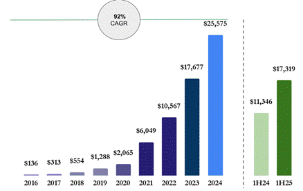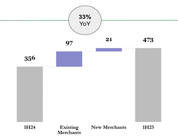 In the chart above, “Existing Merchants” represents the increase in revenues in the six-month period ended on June 30, 2025 attributable to merchants that were customers before or as of June 30, 2024, and “New Merchants” represents the increase in revenues in the six-month period ended on June 30, 2025 attributable to selling services to new merchants added after June 30, 2024.