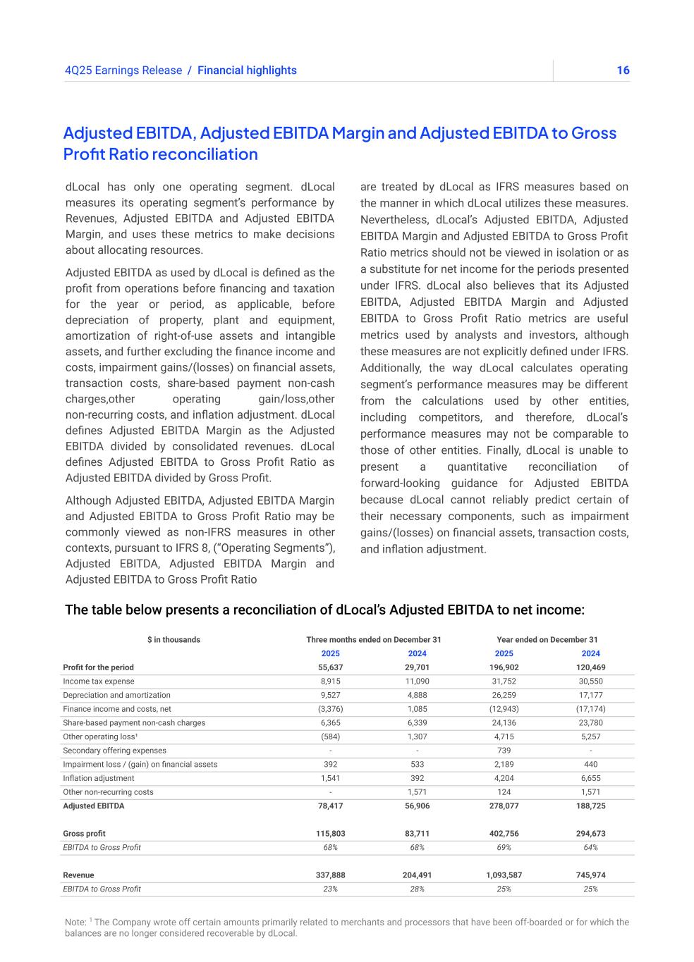 164Q25 Earnings Release The table below presents a reconciliation of dLocal’s Adjusted EBITDA to net income: Note: 1 The Company wrote off certain amounts primarily related to merchants and processors that have been off-boarded or for which the balances are no longer considered recoverable by dLocal. Adjusted EBITDA, Adjusted EBITDA Margin and Adjusted EBITDA to Gross Profit Ratio reconciliation / Financial highlights dLocal has only one operating segment. dLocal measures its operating segment’s performance by Revenues, Adjusted EBITDA and Adjusted EBITDA Margin, and uses these metrics to make decisions about allocating resources. Adjusted EBITDA as used by dLocal is defined as the profit from operations before financing and taxation for the year or period, as applicable, before depreciation of property, plant and equipment, amortization of right-of-use assets and intangible assets, and further excluding the finance income and costs, impairment gains/(losses) on financial assets, transaction costs, share-based payment non-cash charges,other operating gain/loss,other non-recurring costs, and inflation adjustment. dLocal defines Adjusted EBITDA Margin as the Adjusted EBITDA divided by consolidated revenues. dLocal defines Adjusted EBITDA to Gross Profit Ratio as Adjusted EBITDA divided by Gross Profit. Although Adjusted EBITDA, Adjusted EBITDA Margin and Adjusted EBITDA to Gross Profit Ratio may be commonly viewed as non-IFRS measures in other contexts, pursuant to IFRS 8, (“Operating Segments”), Adjusted EBITDA, Adjusted EBITDA Margin and Adjusted EBITDA to Gross Profit Ratio are treated by dLocal as IFRS measures based on the manner in which dLocal utilizes these measures. Nevertheless, dLocal’s Adjusted EBITDA, Adjusted EBITDA Margin and Adjusted EBITDA to Gross Profit Ratio metrics should not be viewed in isolation or as a substitute for net income for the periods presented under IFRS. dLocal also believes that its Adjusted EBITDA, Adjusted EBITDA Margin and Adjusted EBITDA to Gross Profit Ratio metrics are useful metrics used by analysts and investors, although these measures are not explicitly defined under IFRS. Additionally, the way dLocal calculates operating segment’s performance measures may be different from the calculations used by other entities, including competitors, and therefore, dLocal’s performance measures may not be comparable to those of other entities. Finally, dLocal is unable to present a quantitative reconciliation of forward-looking guidance for Adjusted EBITDA because dLocal cannot reliably predict certain of their necessary components, such as impairment gains/(losses) on financial assets, transaction costs, and inflation adjustment. $ in thousands Three months ended on December 31 Year ended on December 31 2025 2024 2025 2024 Profit for the period 55,637 29,701 196,902 120,469 Income tax expense 8,915 11,090 31,752 30,550 Depreciation and amortization 9,527 4,888 26,259 17,177 Finance income and costs, net (3,376) 1,085 (12,943) (17,174) Share-based payment non-cash charges 6,365 6,339 24,136 23,780 Other operating loss¹ (584) 1,307 4,715 5,257 Secondary offering expenses - - 739 - Impairment loss / (gain) on financial assets 392 533 2,189 440 Inflation adjustment 1,541 392 4,204 6,655 Other non-recurring costs - 1,571 124 1,571 Adjusted EBITDA 78,417 56,906 278,077 188,725 Gross profit 115,803 83,711 402,756 294,673 EBITDA to Gross Profit 68% 68% 69% 64% Revenue 337,888 204,491 1,093,587 745,974 EBITDA to Gross Profit 23% 28% 25% 25%